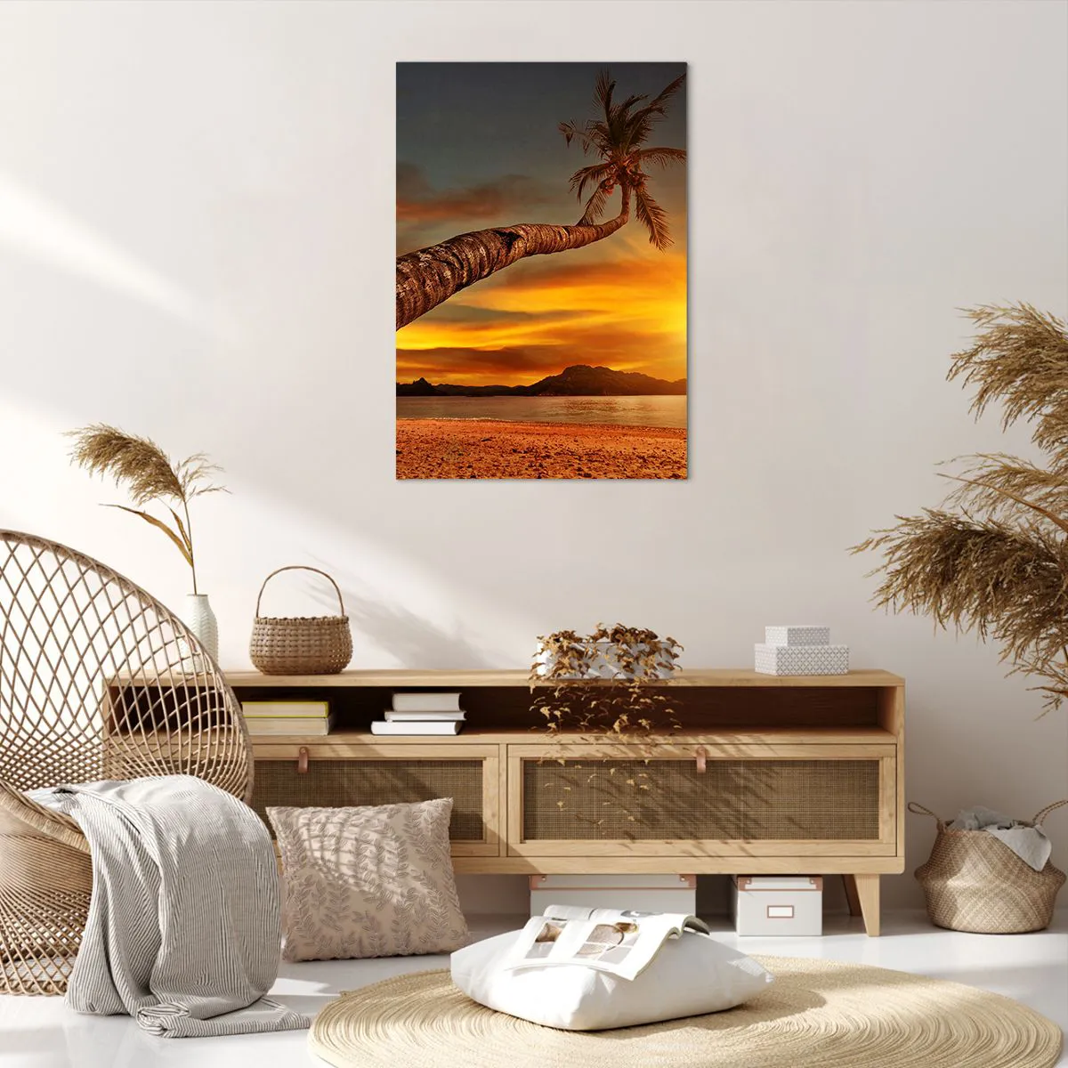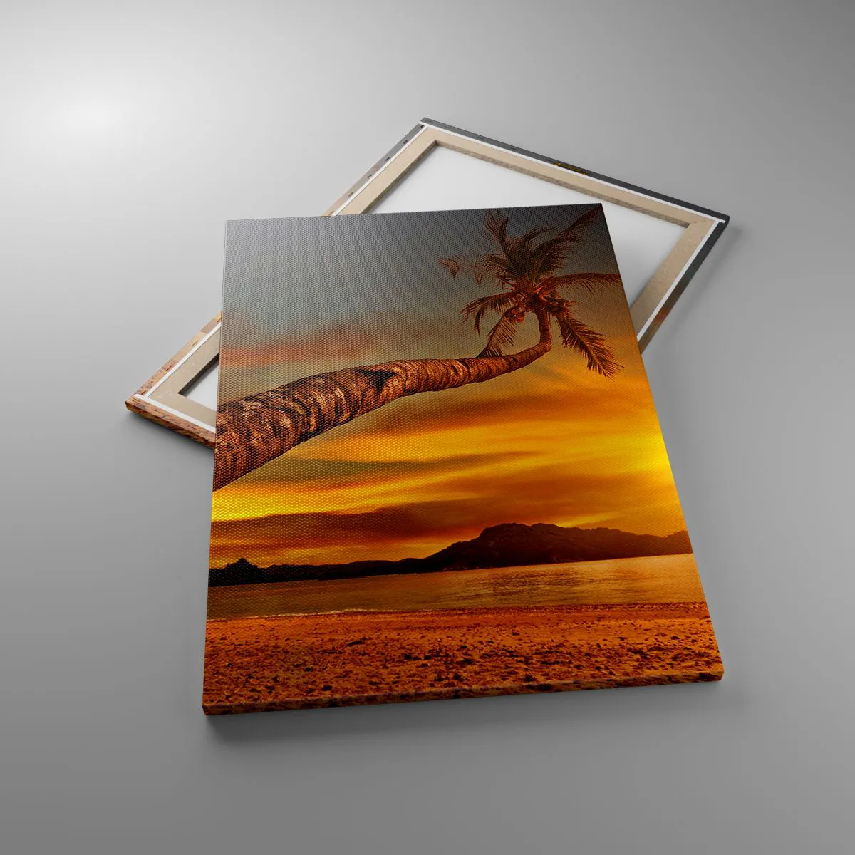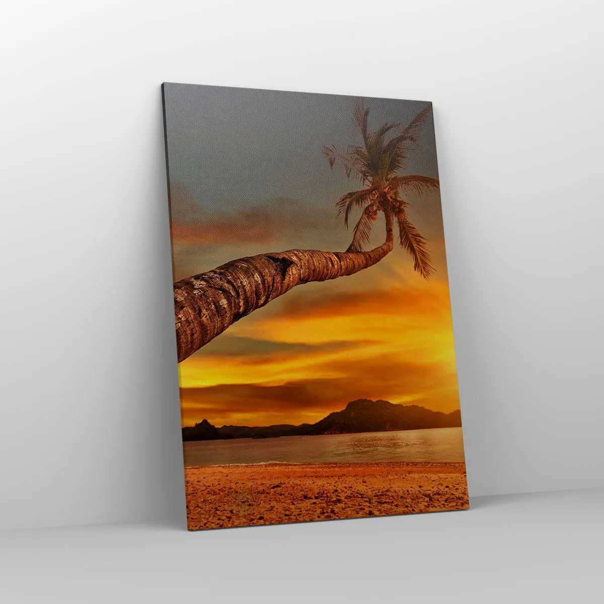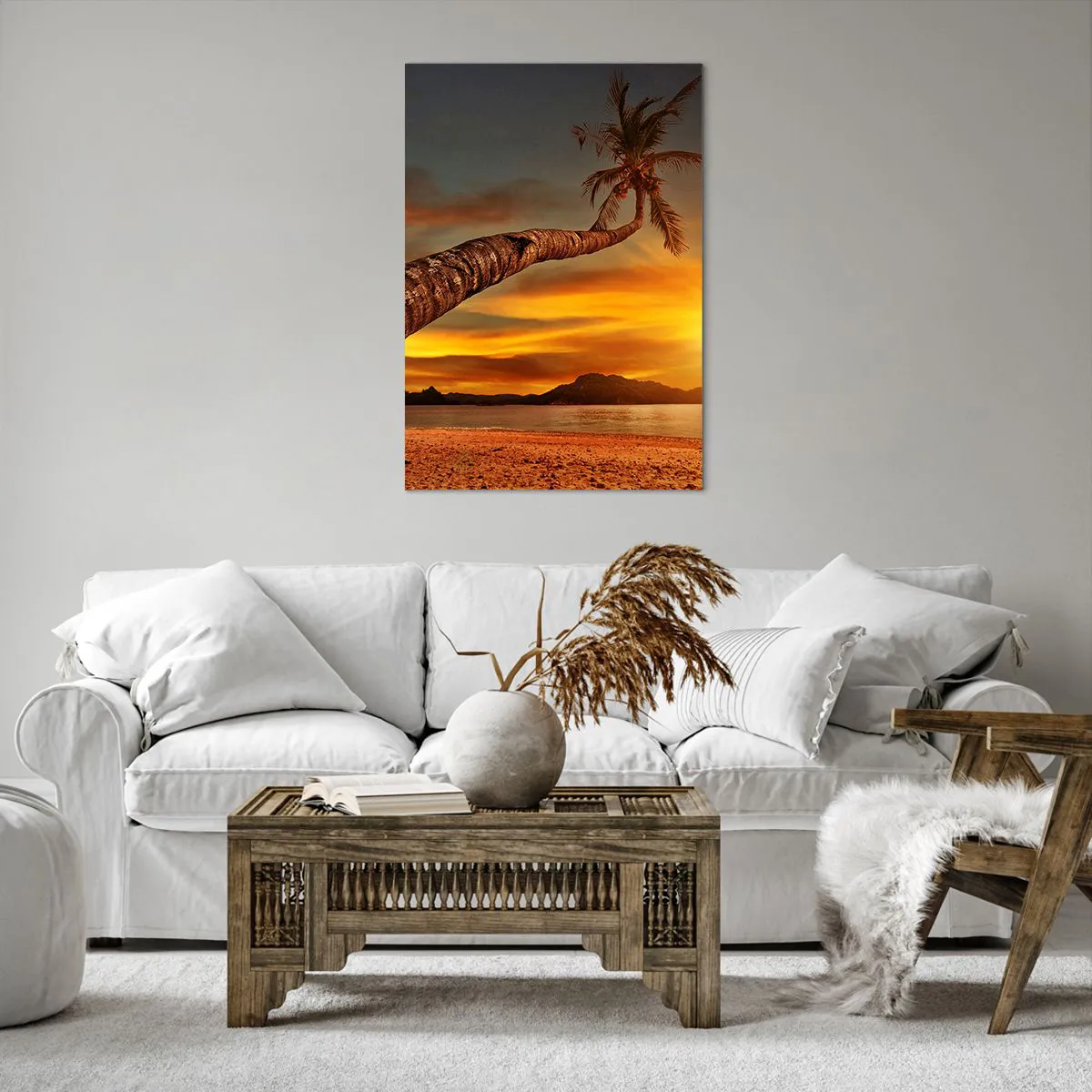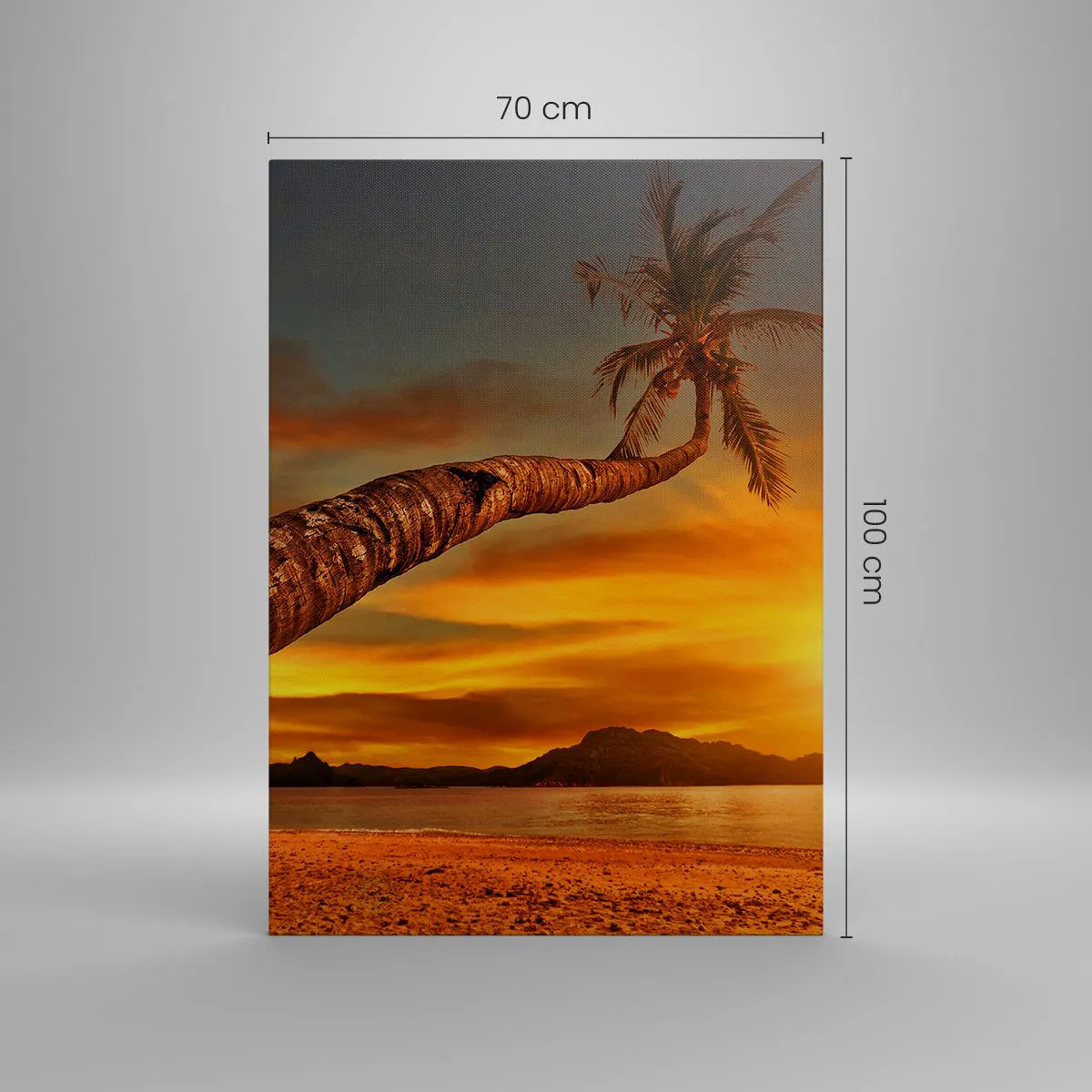 Bild auf Leinwand - Leinwandbild - Palme am Strand bei Sonnenuntergang mit Blick auf das Meer - 70x100cm - Exotischer Urlaub, karibisches Abenteuer - Moderne Wanddekoration für Wohnzimmer und Schlafzimmer ARTTOR