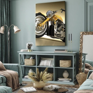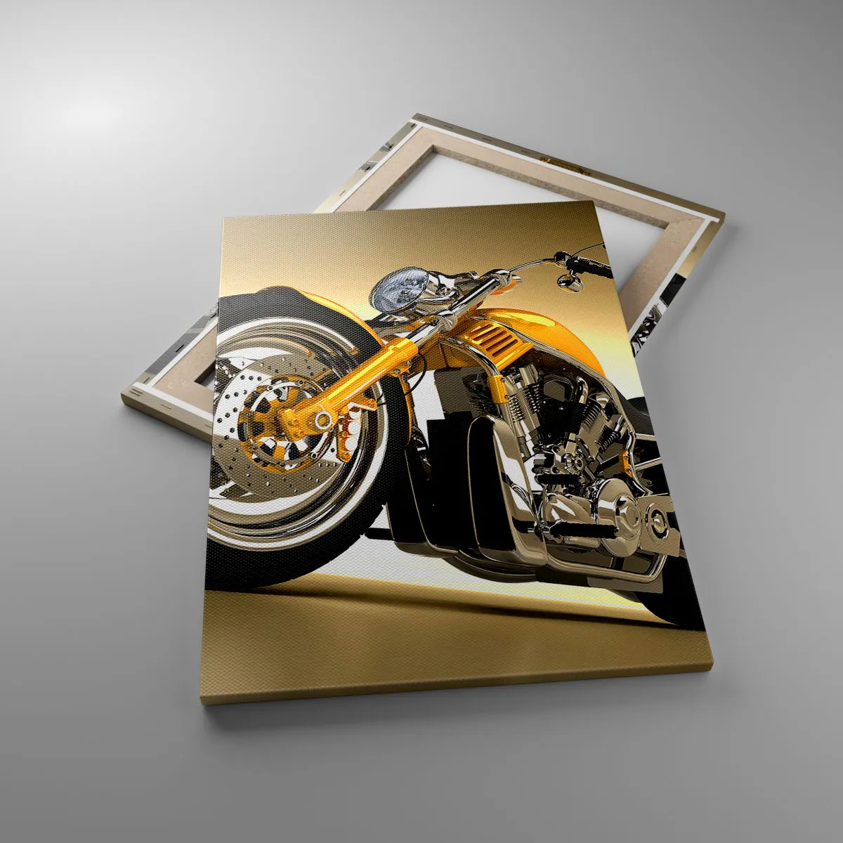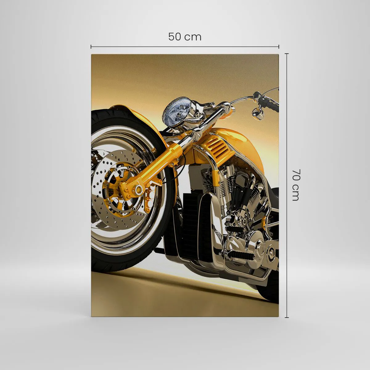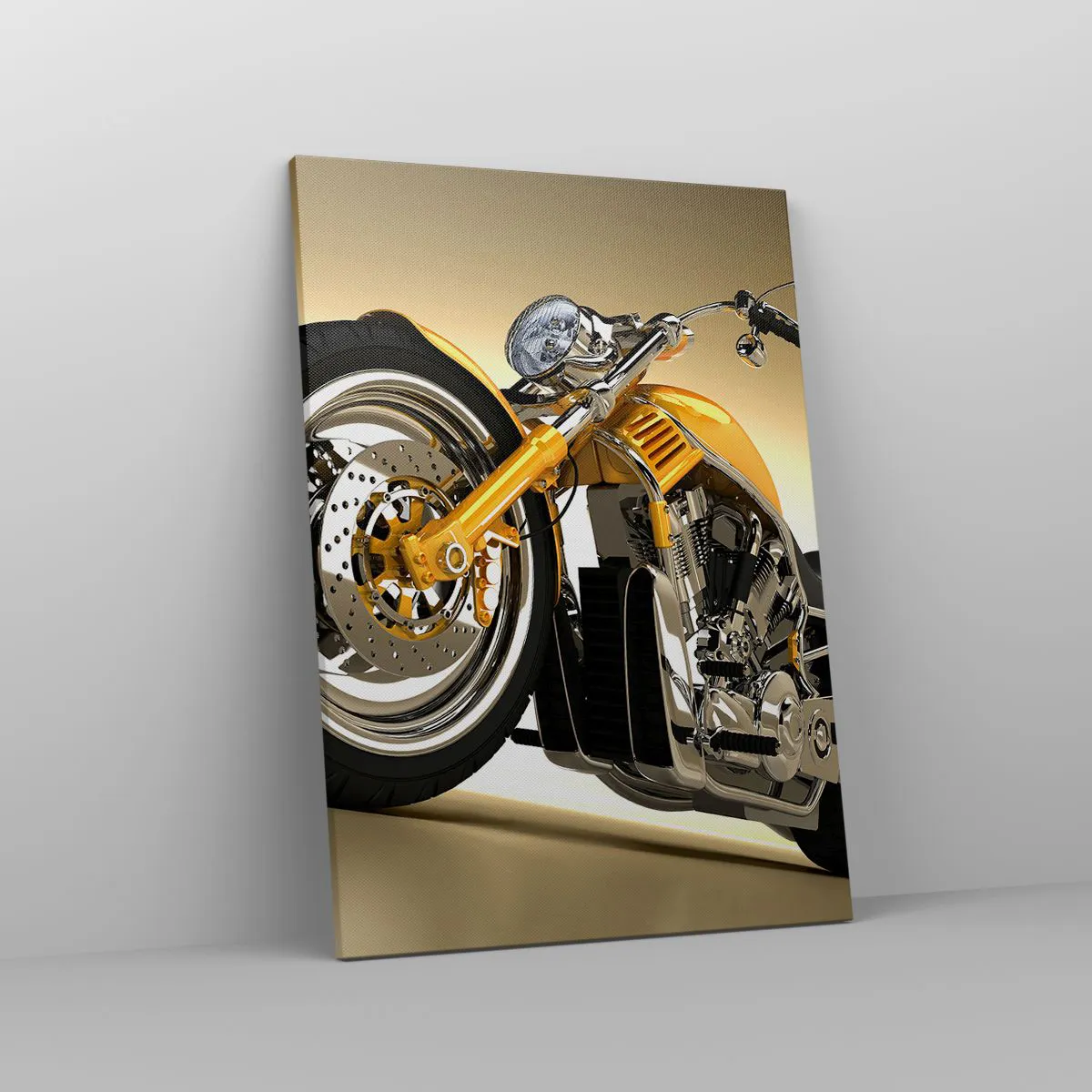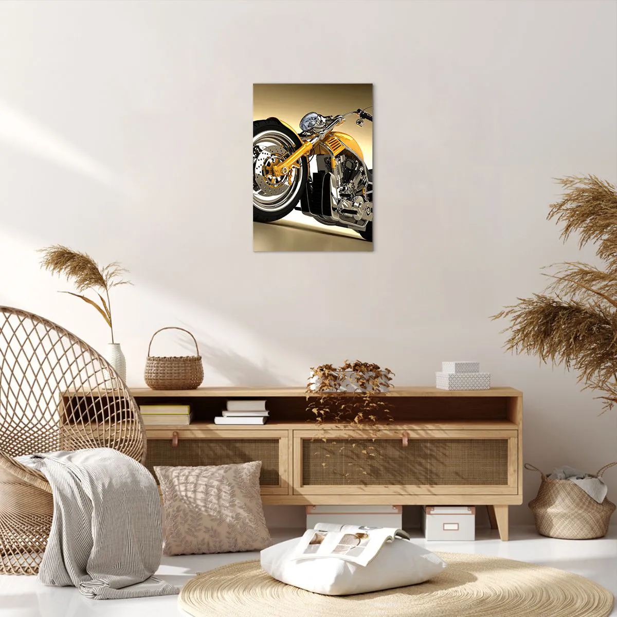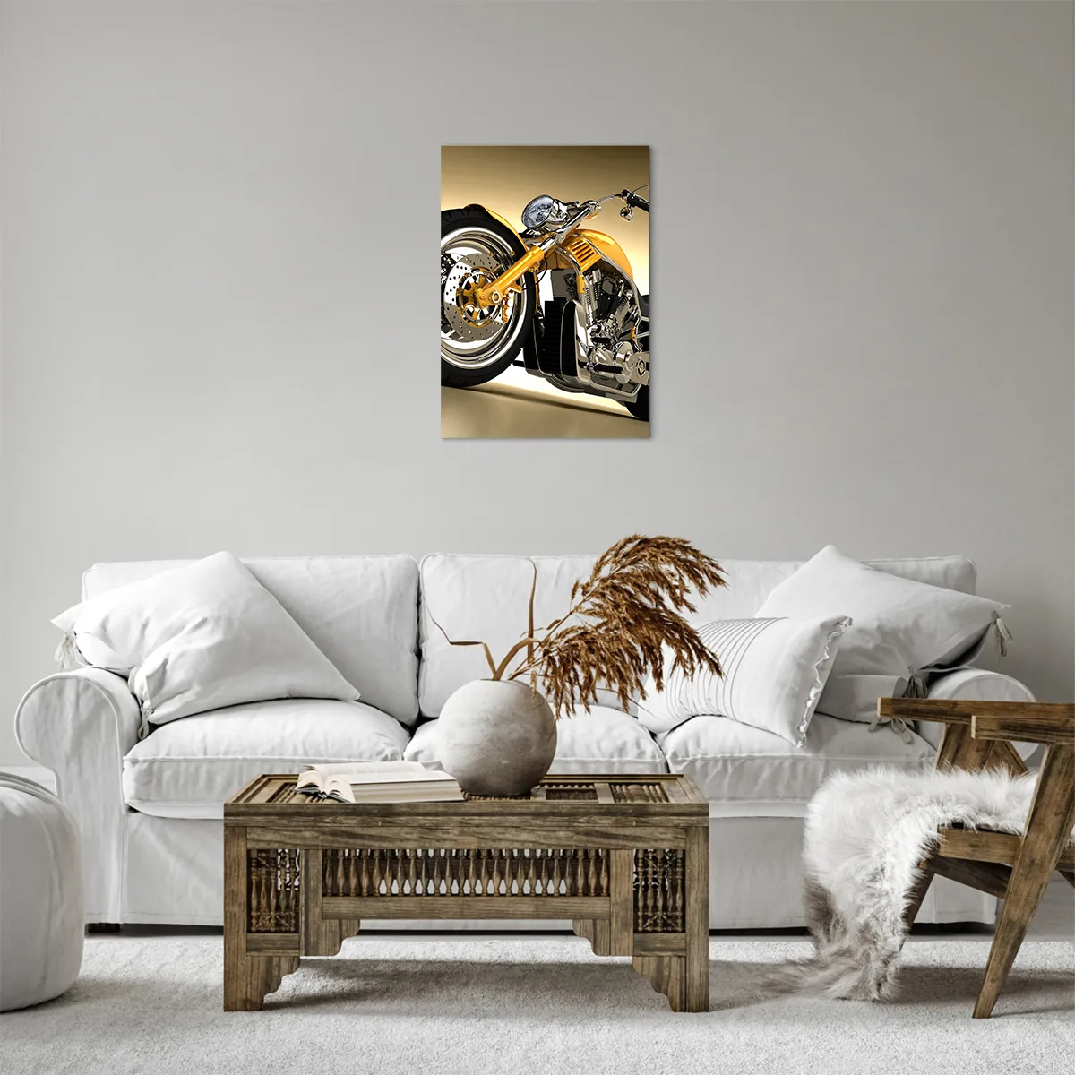 Bild auf Leinwand - Leinwandbild - Ein gelbes Motorrad im Chopper-Stil vor einer beigen Wand - 50x70cm - Ein Traum von Kraft und Geschwindigkeit - Moderne Wanddekoration für Wohnzimmer und Schlafzimmer ARTTOR