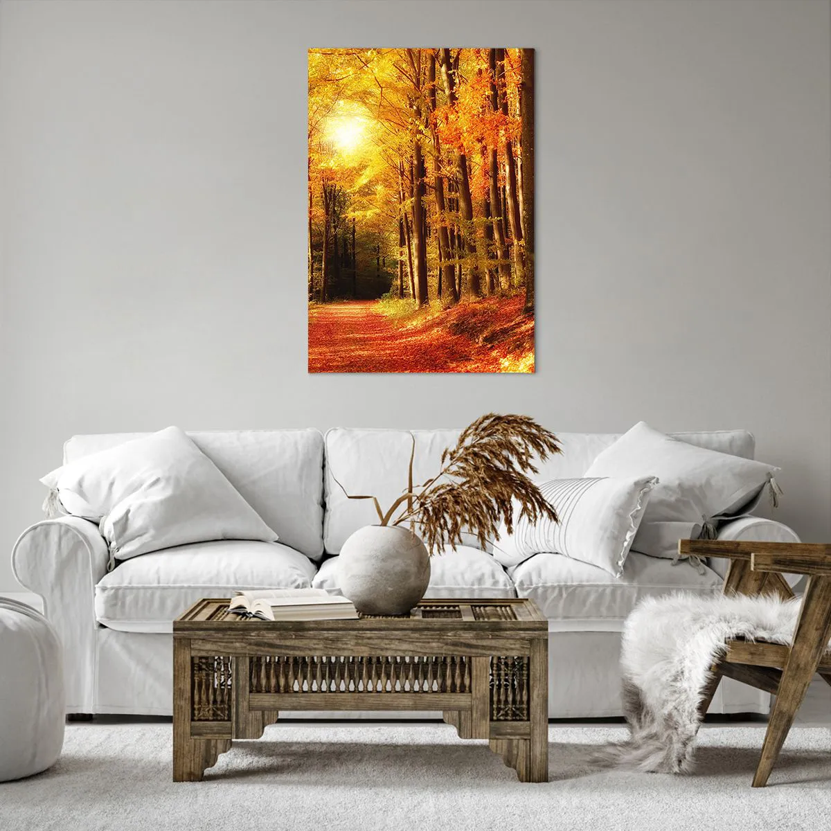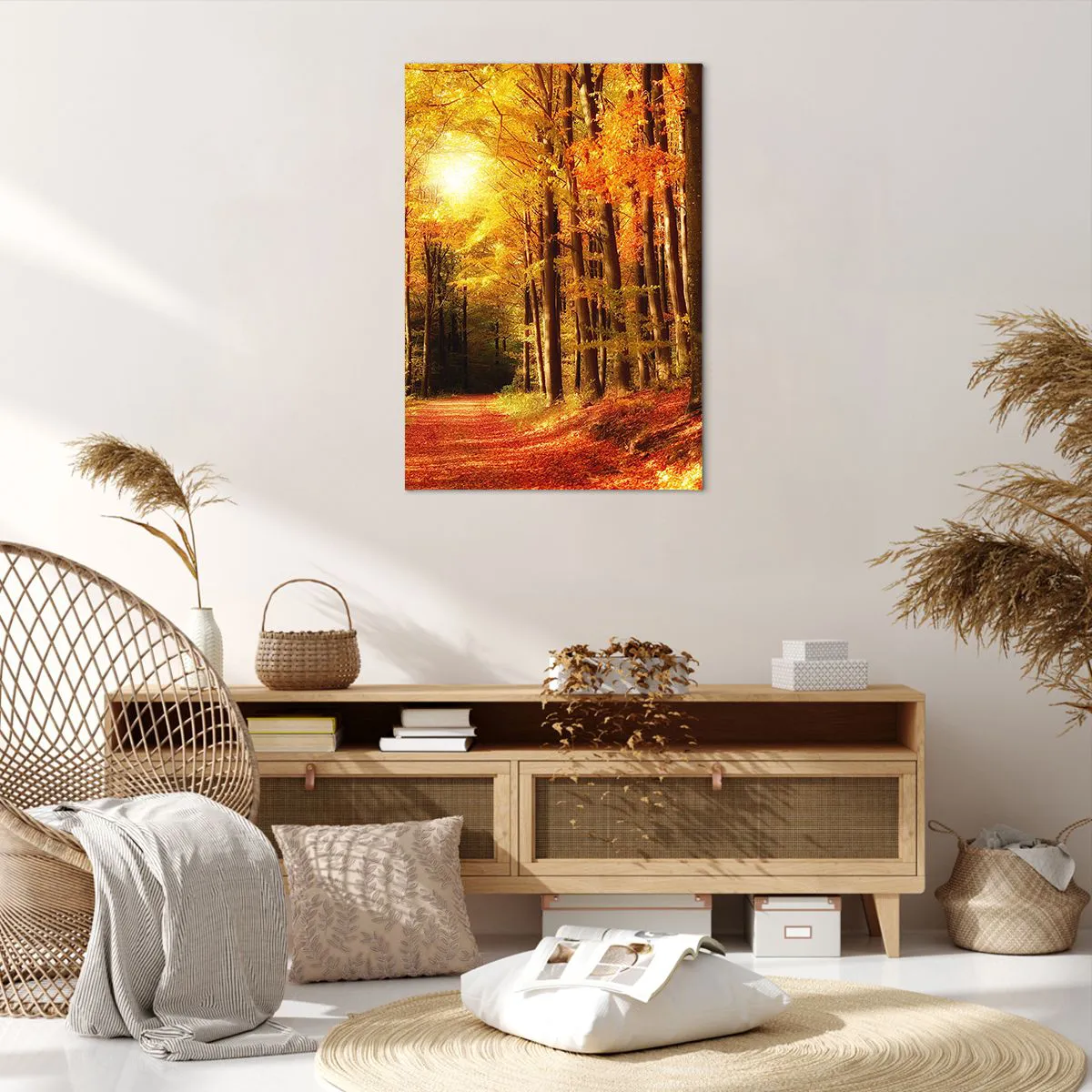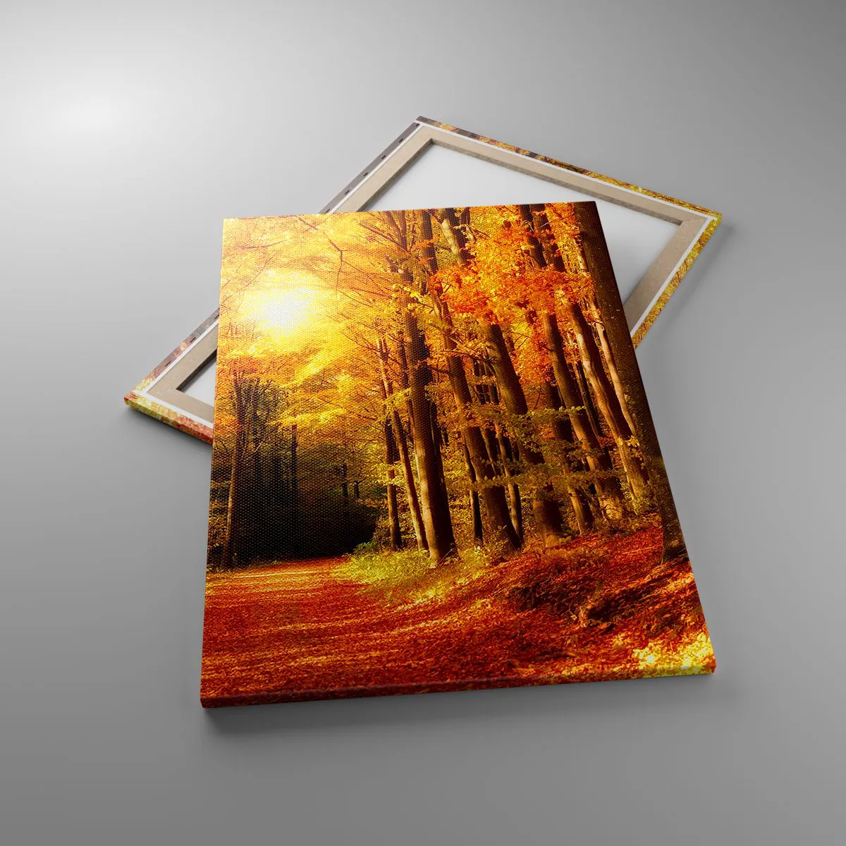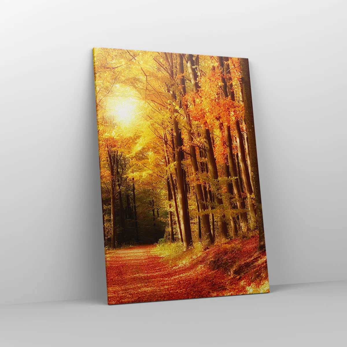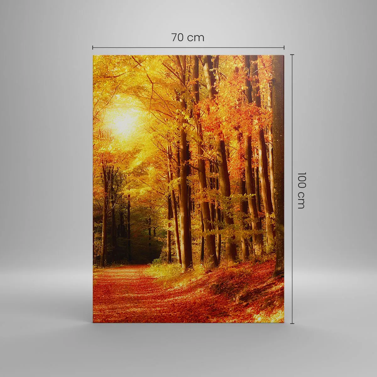 Bild auf Leinwand - Leinwandbild - Herbstwald mit Sonnenstrahlen, die durch die Bäume scheinen - 70x100cm - Goldener Herbst auf einer Forststraße - Moderne Wanddekoration für Wohnzimmer und Schlafzimmer ARTTOR
