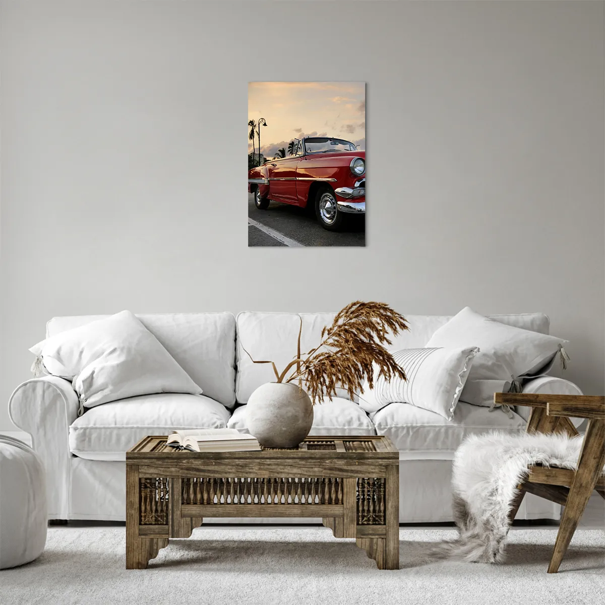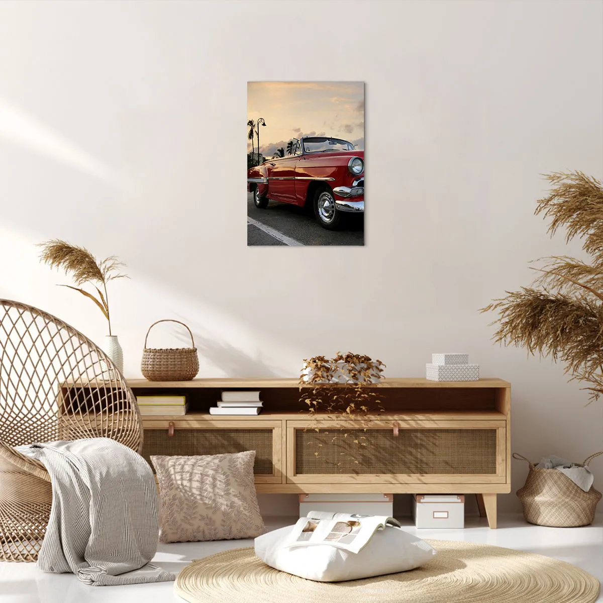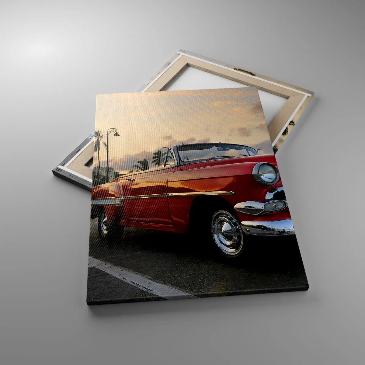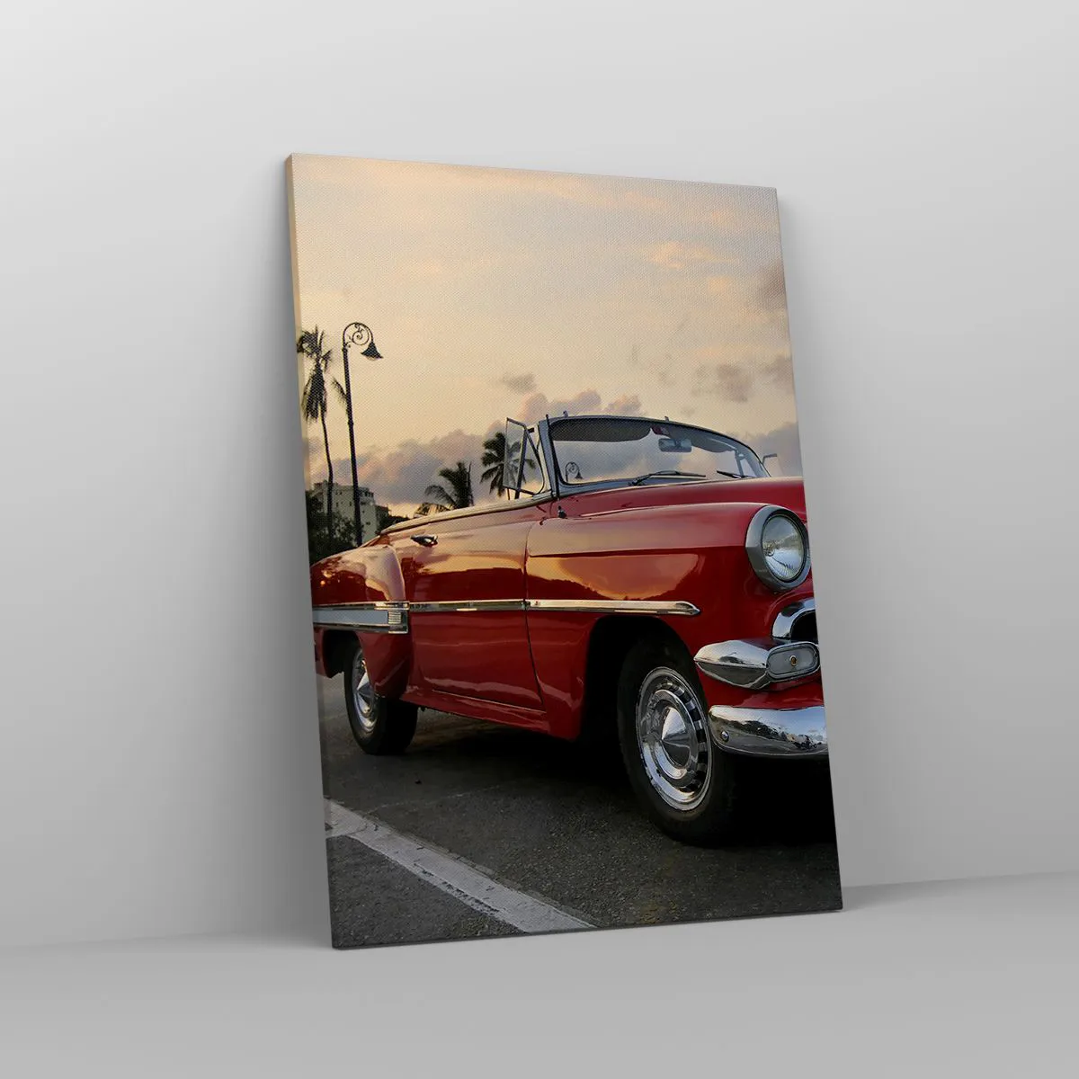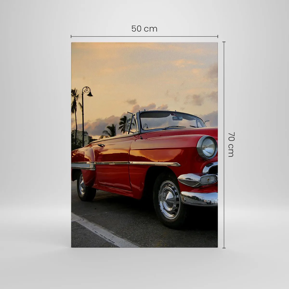 Bild auf Leinwand - Leinwandbild - Ein rotes klassisches Cabrio, das in der Abenddämmerung zwischen Palmen geparkt ist. - 50x70cm - Die rote Hitze der Tropen - Moderne Wanddekoration für Wohnzimmer und Schlafzimmer ARTTOR