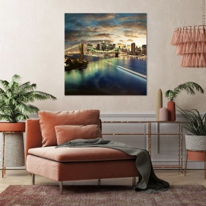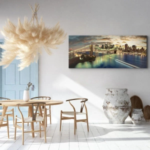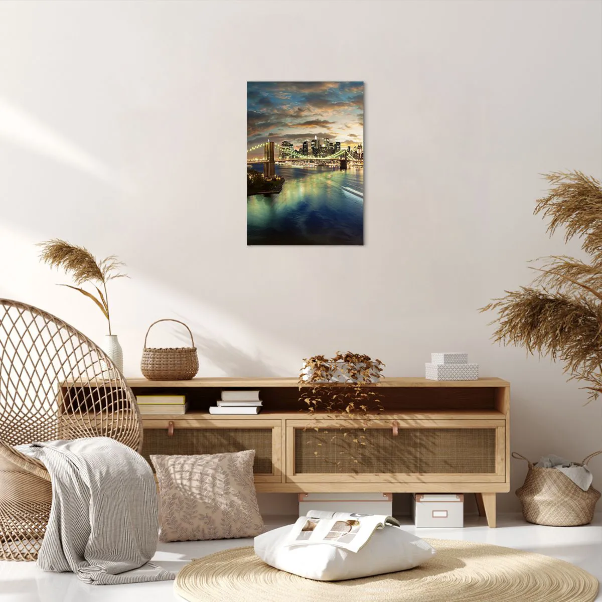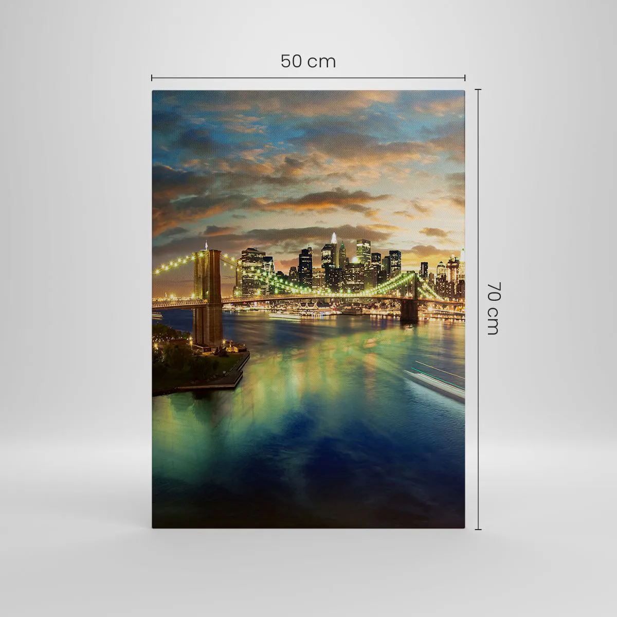 Bild auf Leinwand - Leinwandbild - Eine beleuchtete Brücke mit der Stadt im Hintergrund, deren Lichter sich im Wasser spiegeln. - 50x70cm - Ein heller Abend über Manhattan - Moderne Wanddekoration für Wohnzimmer und Schlafzimmer ARTTOR