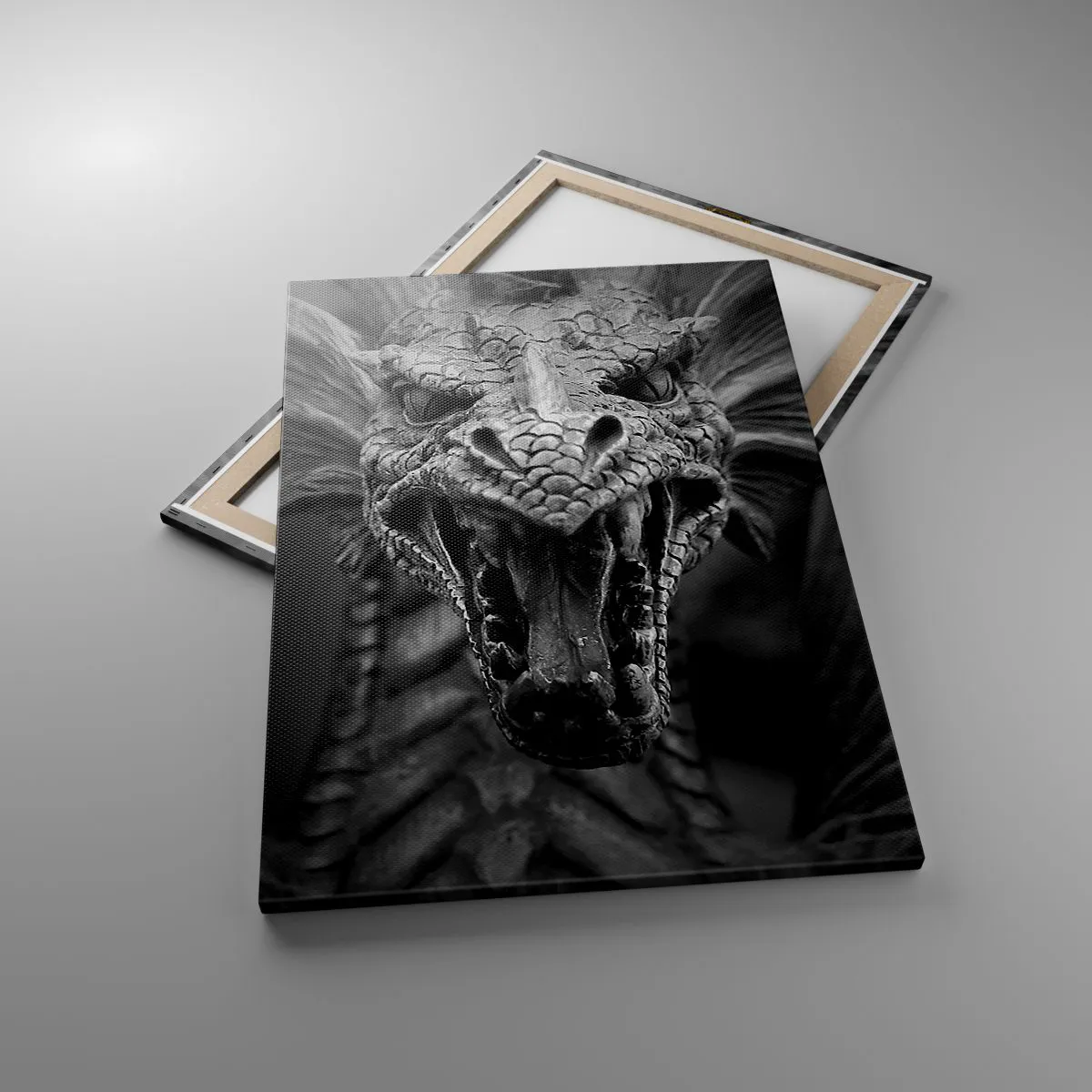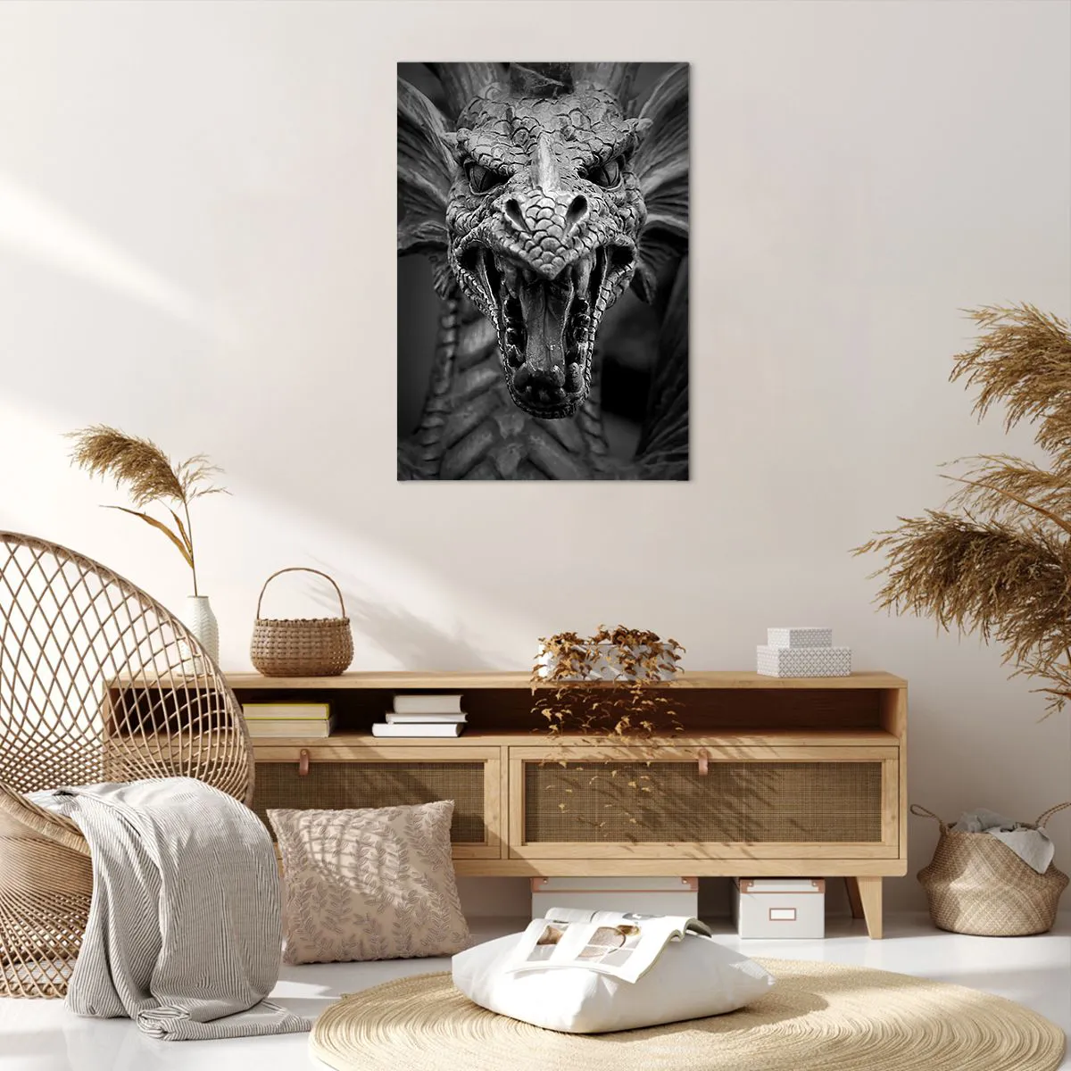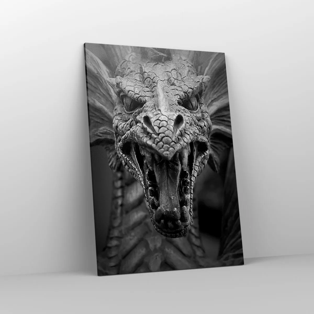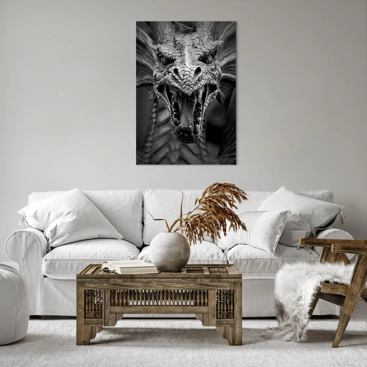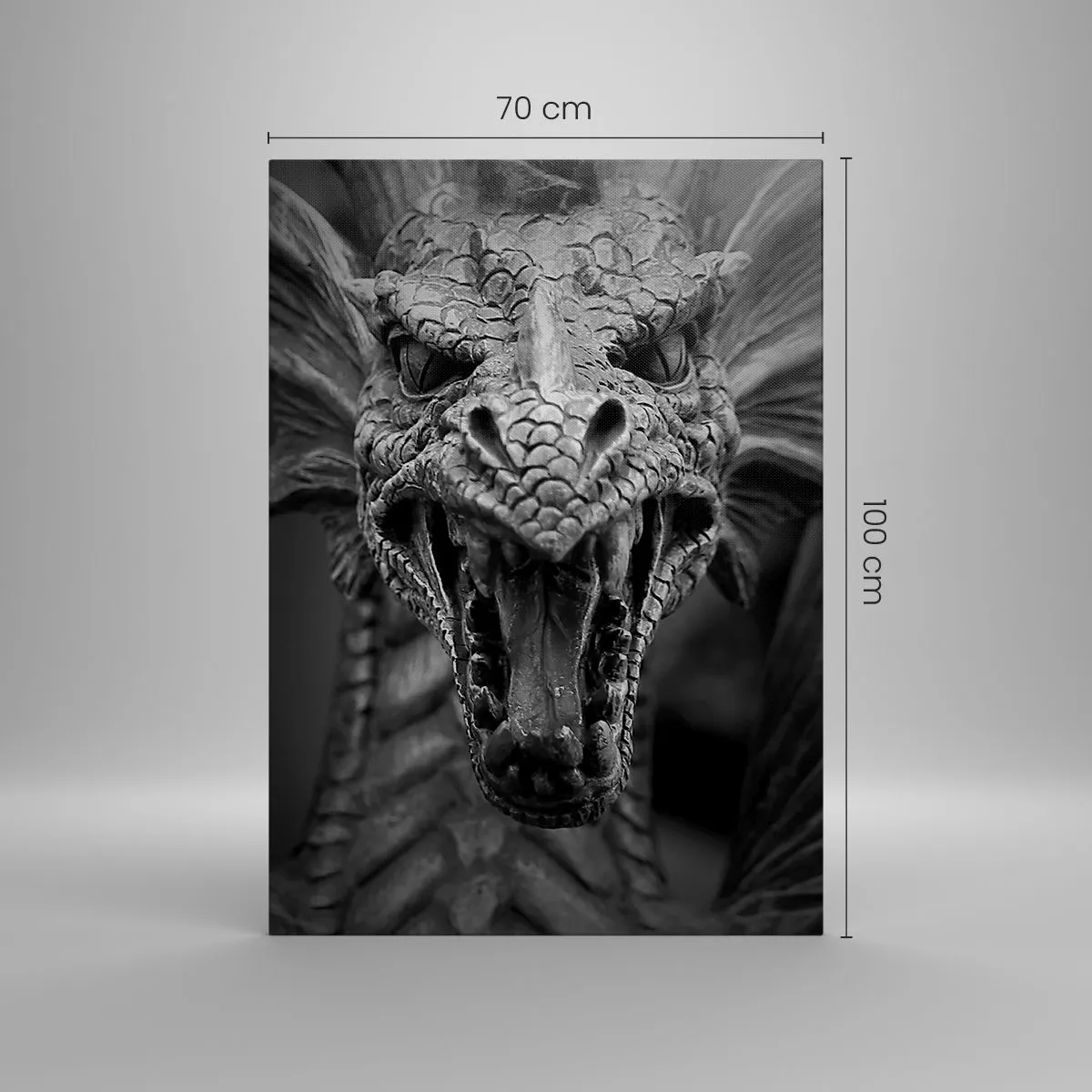 Bild auf Leinwand - Leinwandbild - Ein bedrohlicher Drachenkopf in Schwarz-Weiß mit ausdrucksstarken Details. - 70x100cm - Ein märchenhafter Drache in Grau - Moderne Wanddekoration für Wohnzimmer und Schlafzimmer ARTTOR