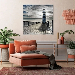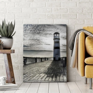 Bild auf Leinwand - Leinwandbild - Leuchtturm auf einem Holzsteg mit Blick auf das Meer. - 50x70cm - Matrosen, ich warte auf euch - Moderne Wanddekoration für Wohnzimmer und Schlafzimmer ARTTOR