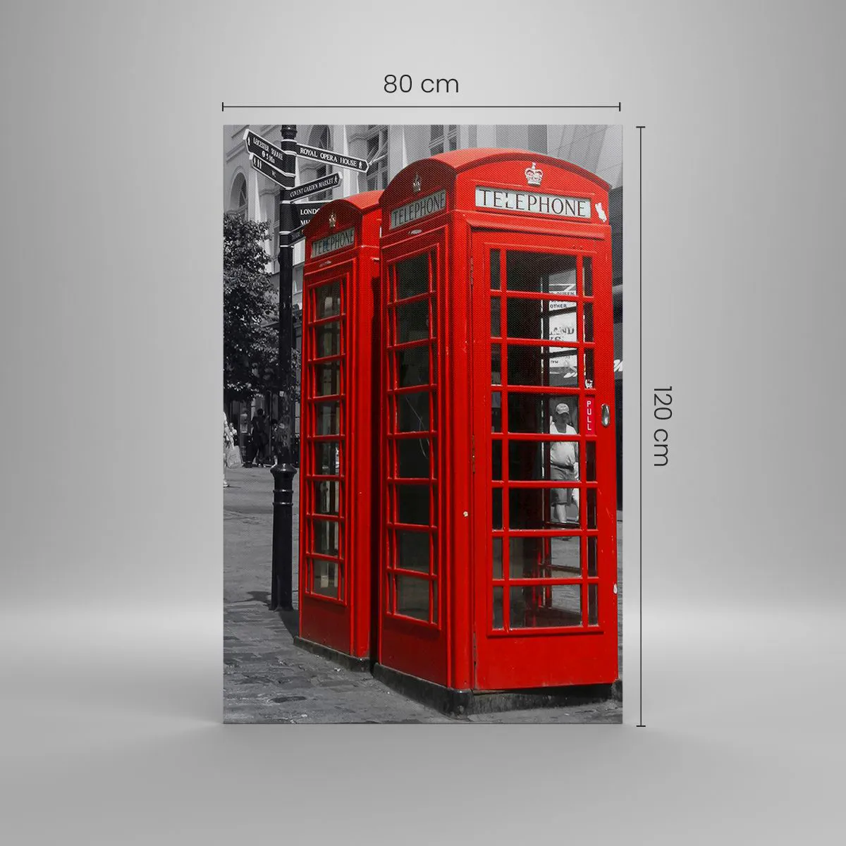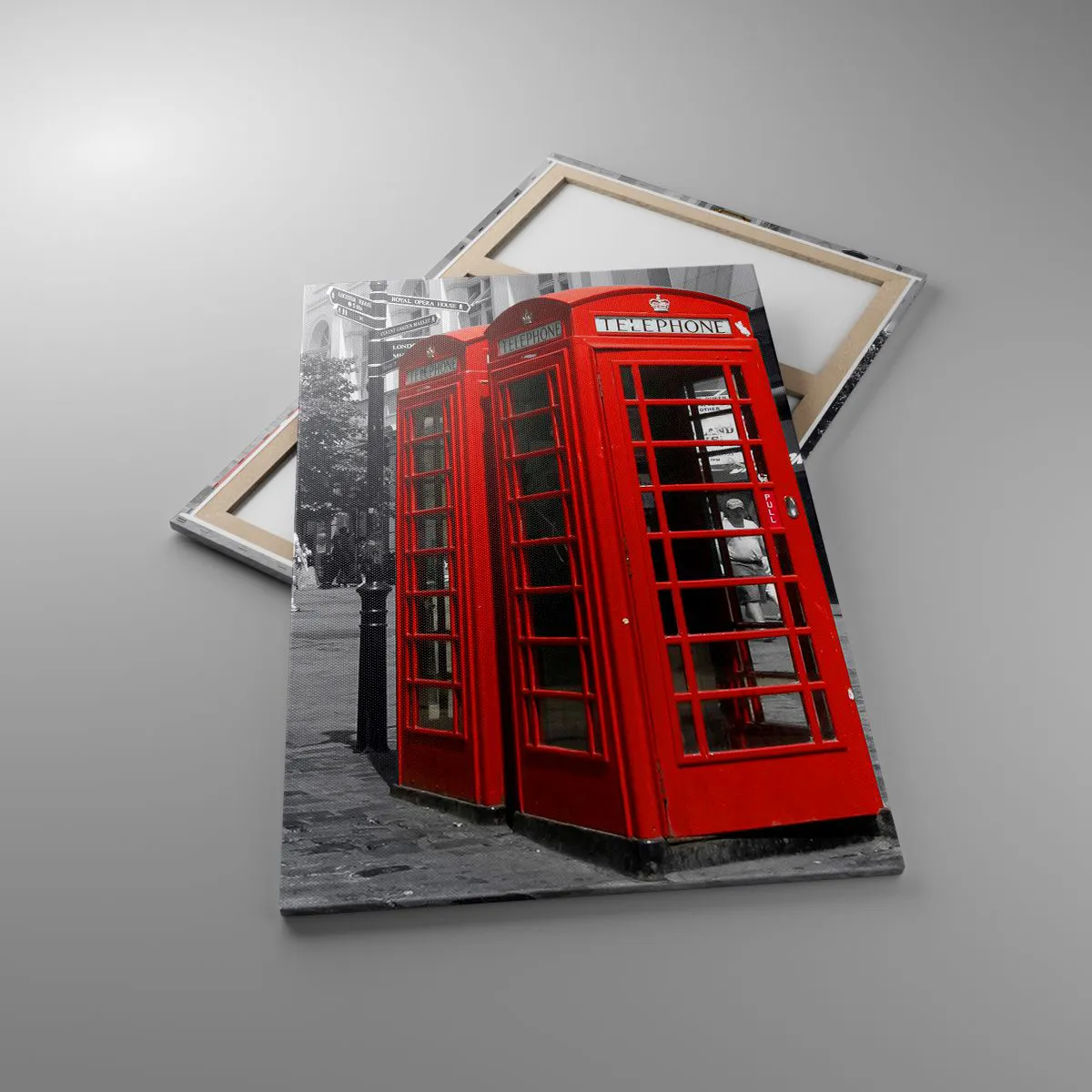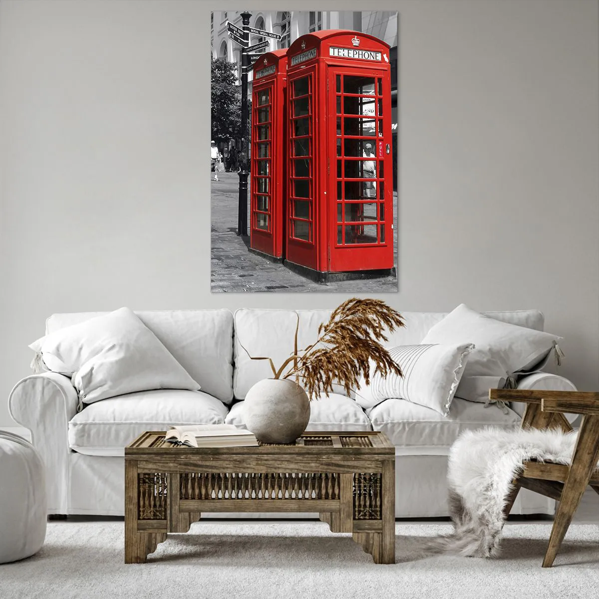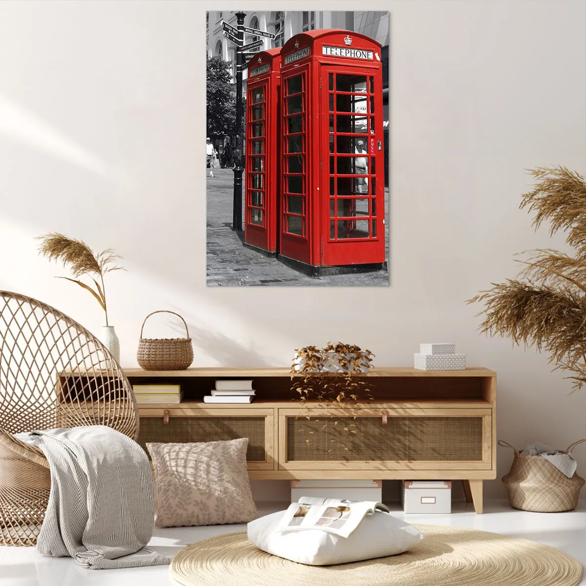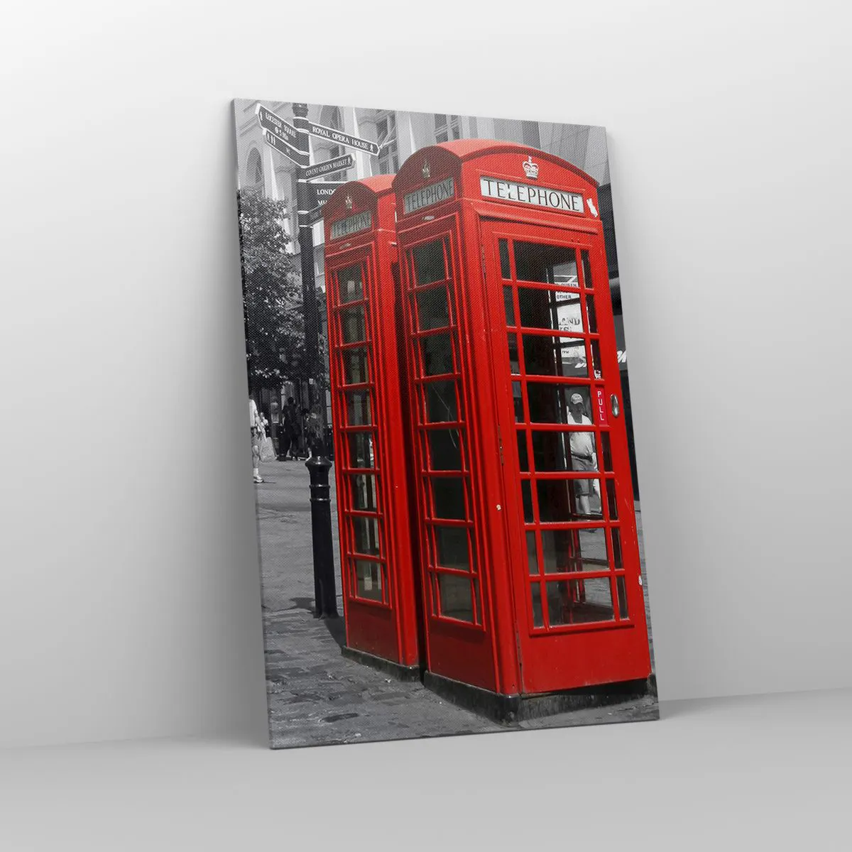 Bild auf Leinwand - Leinwandbild - Rote Telefonzellen vor einer schwarz-weißen Stadtkulisse. - 80x120cm - Rote Telefonzellen - Moderne Wanddekoration für Wohnzimmer und Schlafzimmer ARTTOR