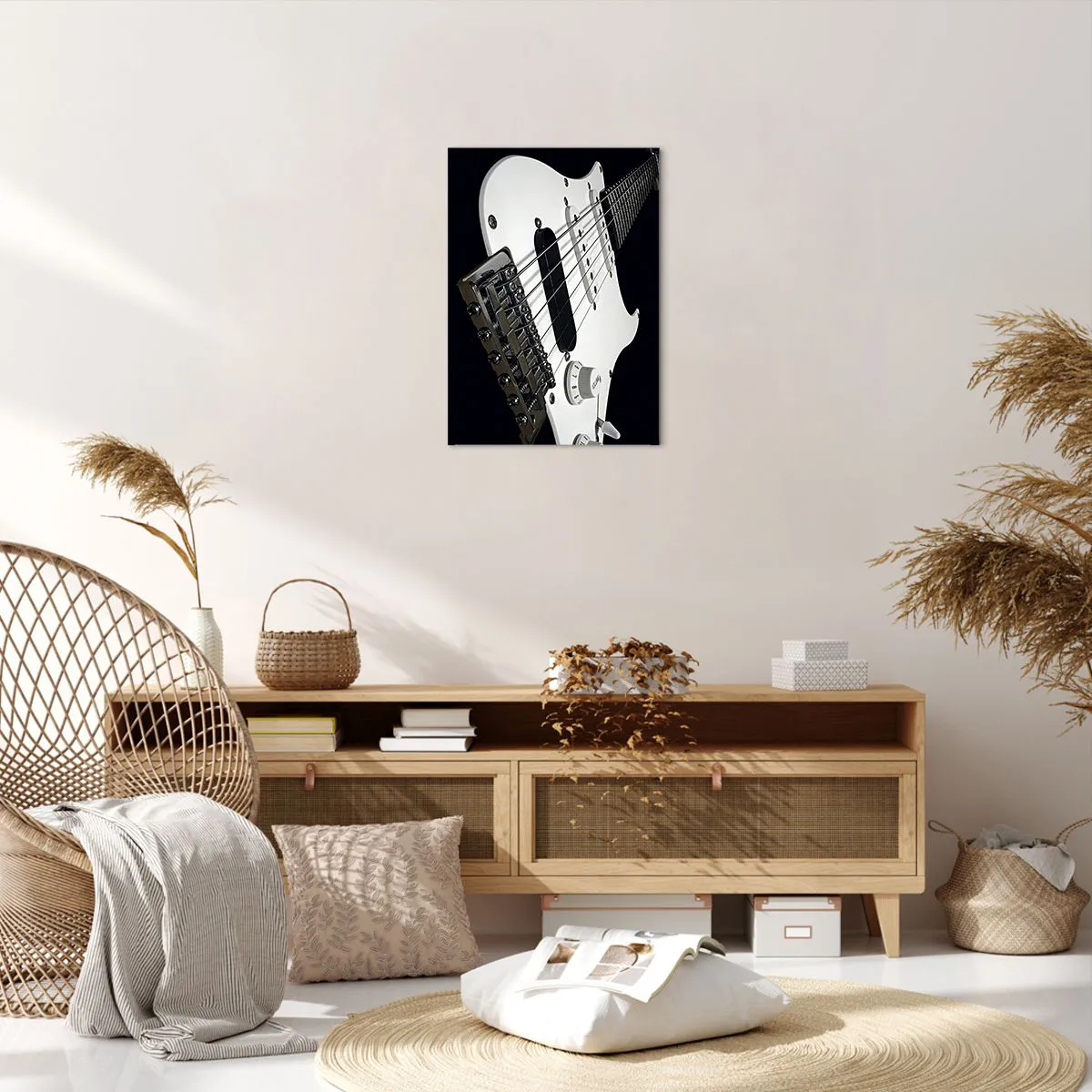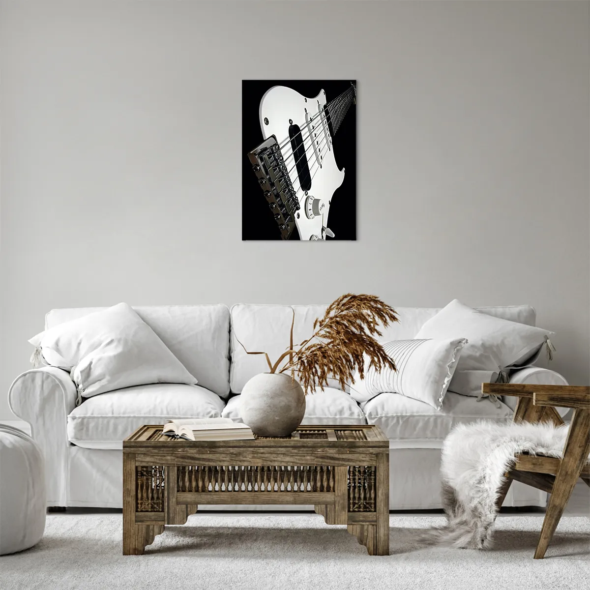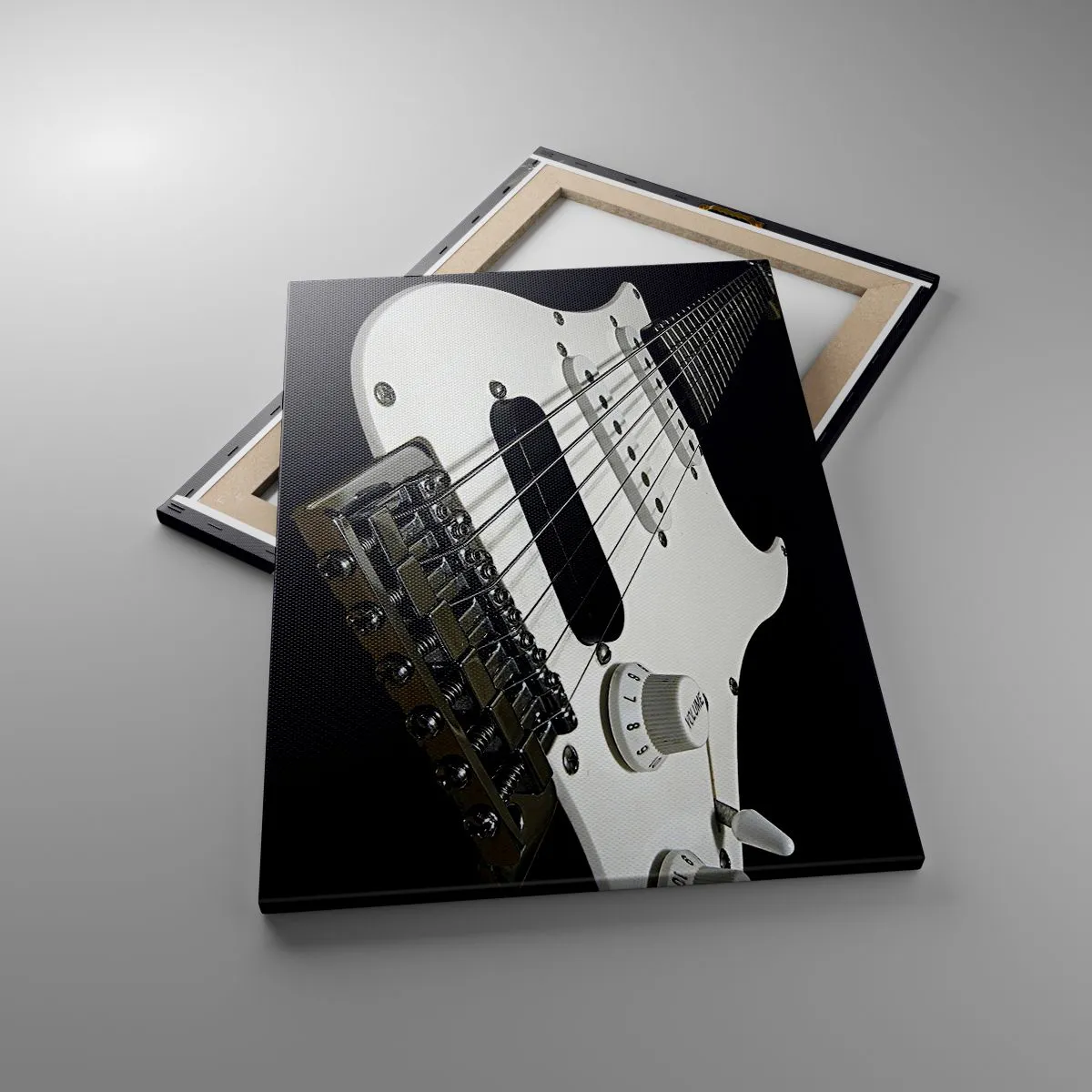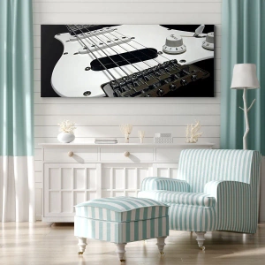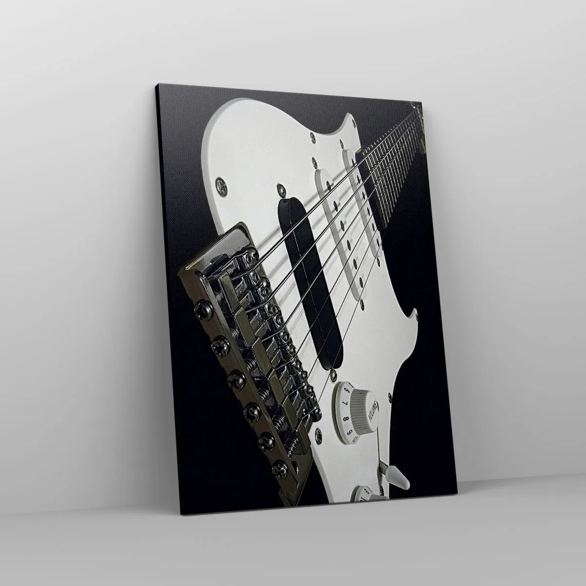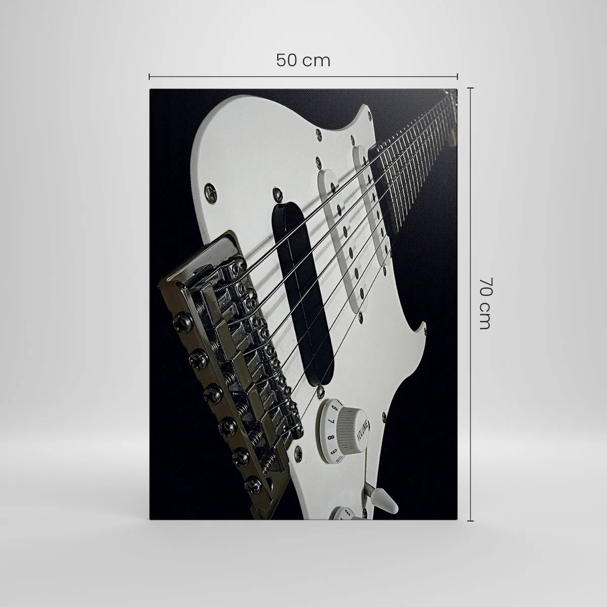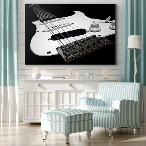 Bild auf Leinwand - Leinwandbild - Nahaufnahme einer weißen E-Gitarre auf schwarzem Hintergrund. - 50x70cm - In Weiß versteckter Ton - Moderne Wanddekoration für Wohnzimmer und Schlafzimmer ARTTOR