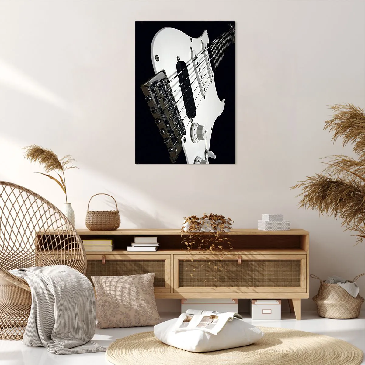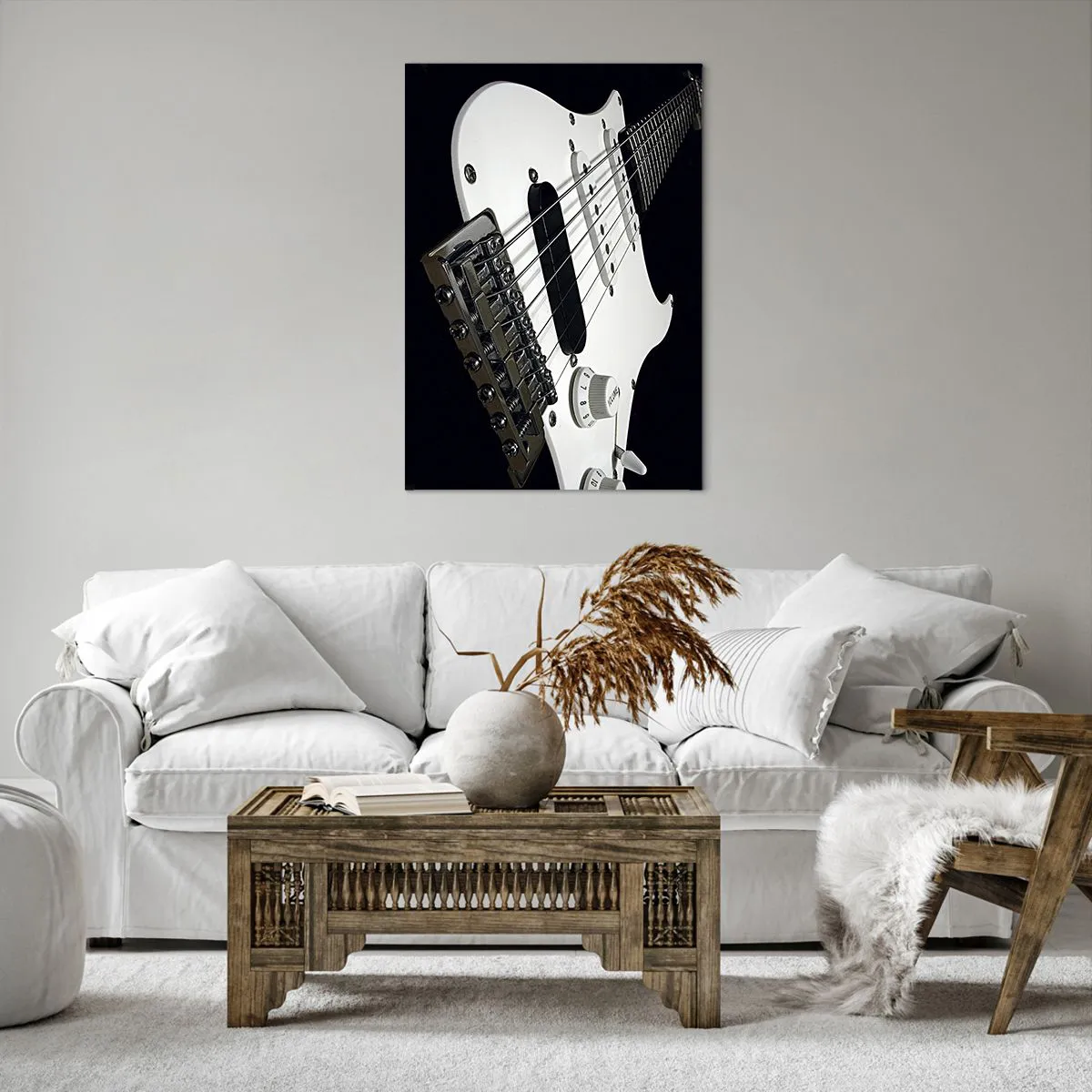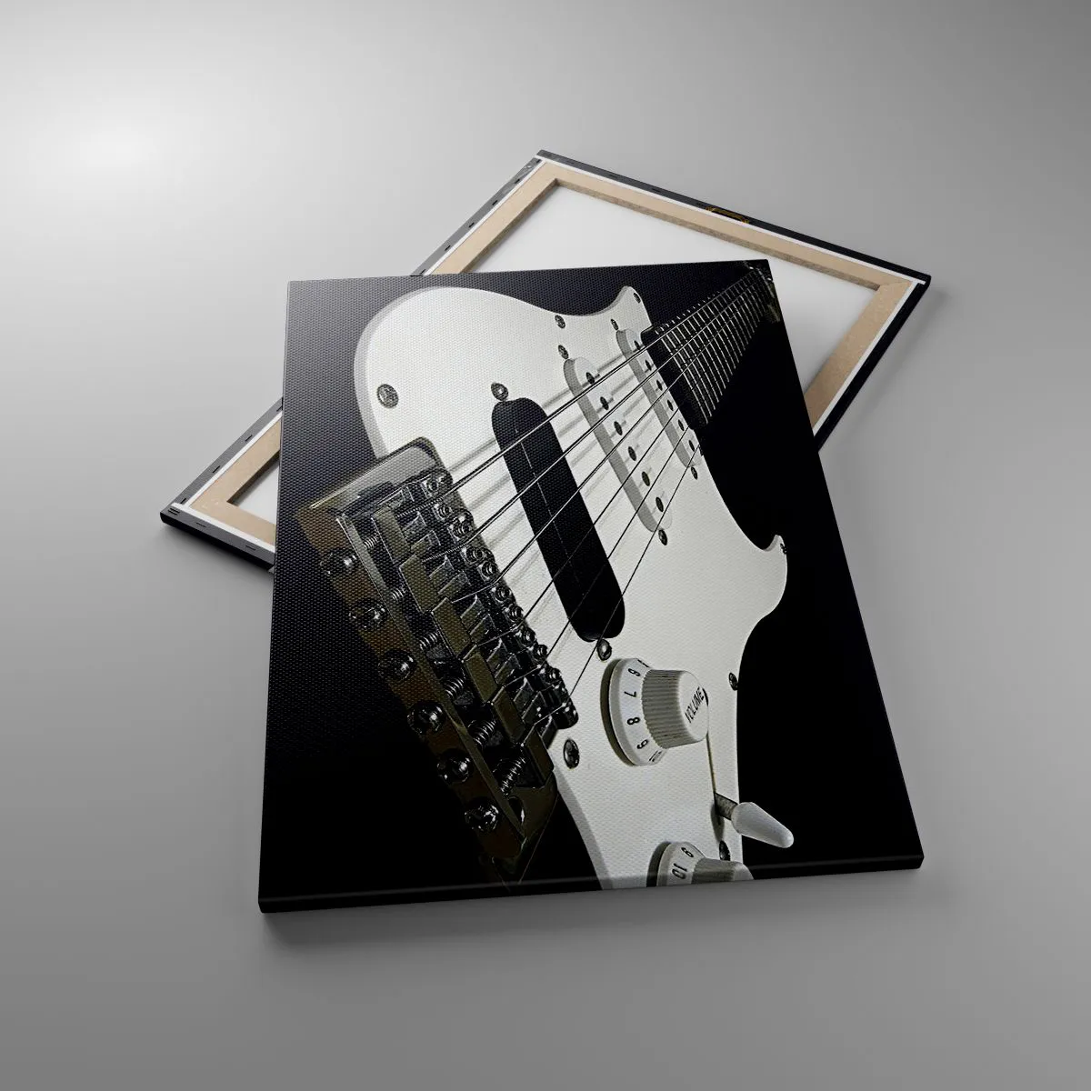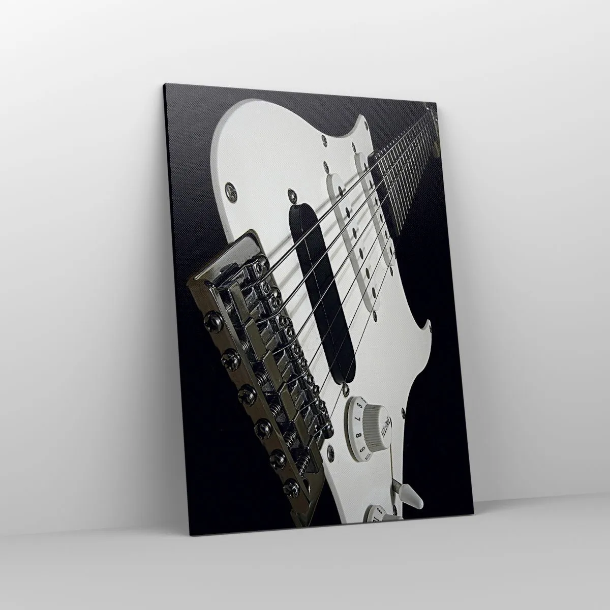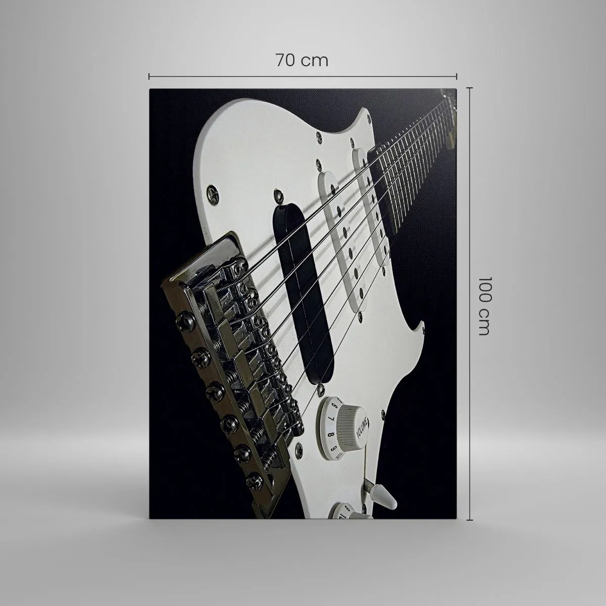 Bild auf Leinwand - Leinwandbild - Nahaufnahme einer weißen E-Gitarre auf schwarzem Hintergrund. - 70x100cm - In Weiß versteckter Ton - Moderne Wanddekoration für Wohnzimmer und Schlafzimmer ARTTOR