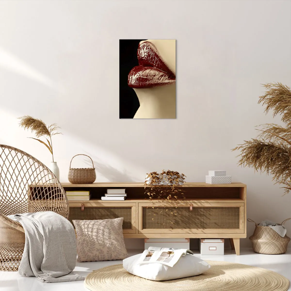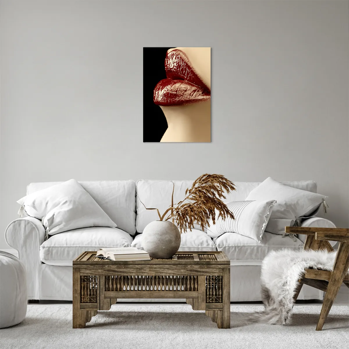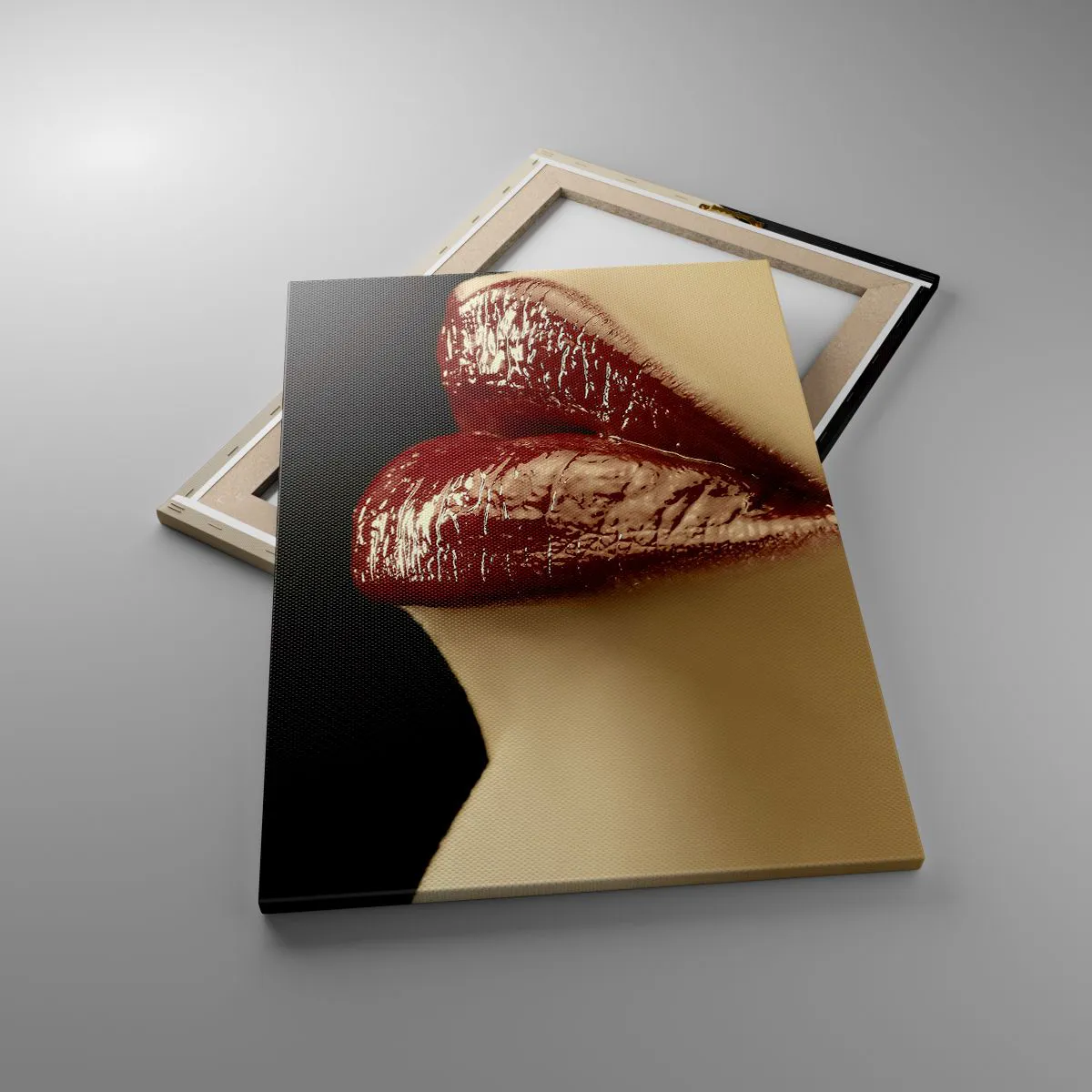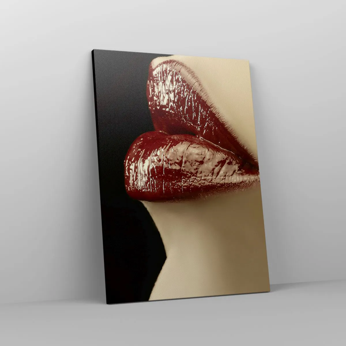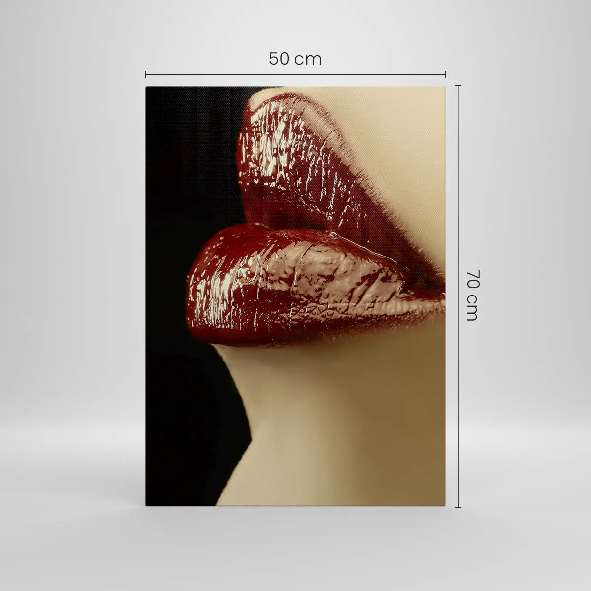 Bild auf Leinwand - Leinwandbild - Rote Lippen und Lippenstift auf schwarzem Hintergrund - 50x70cm - Sinnlichkeit und Brillanz von Karmin - Moderne Wanddekoration für Wohnzimmer und Schlafzimmer ARTTOR