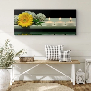 Bild auf Leinwand - Leinwandbild - Gelbe Blume, Kerzen und Steine vor dem Wasserhintergrund - 50x70cm - Beruhigung der Sinne - Moderne Wanddekoration für Wohnzimmer und Schlafzimmer ARTTOR