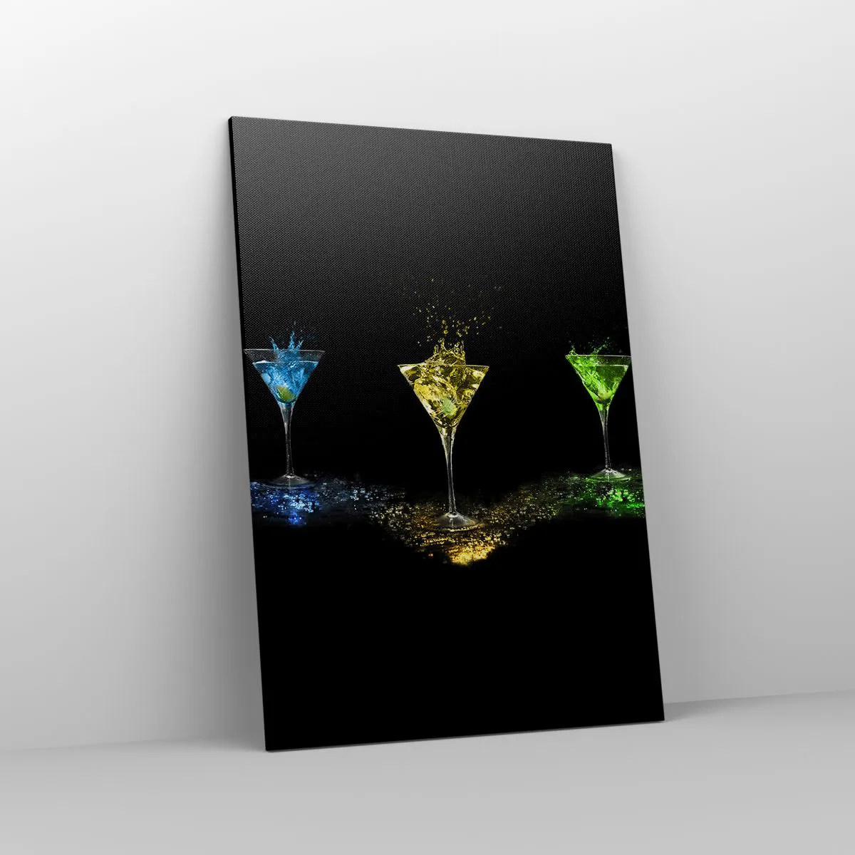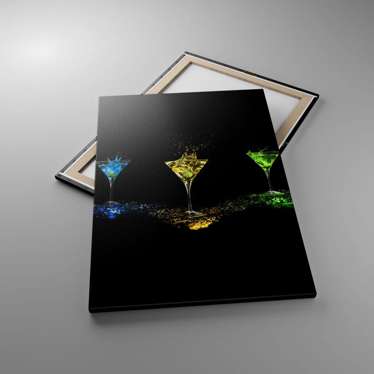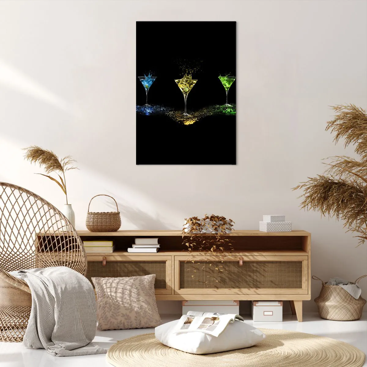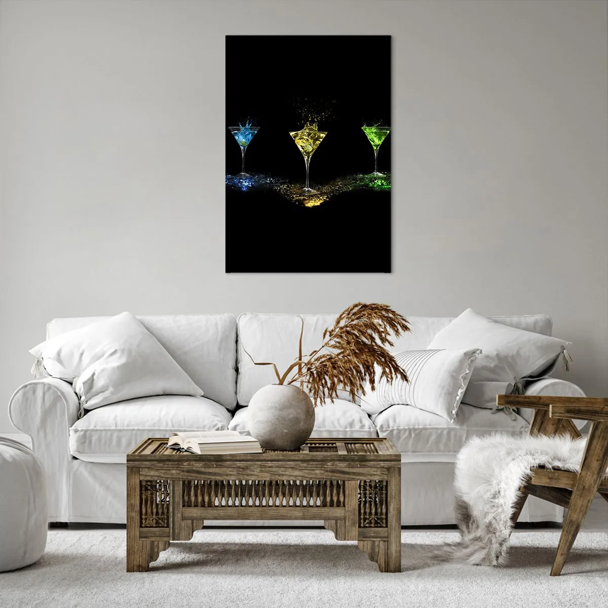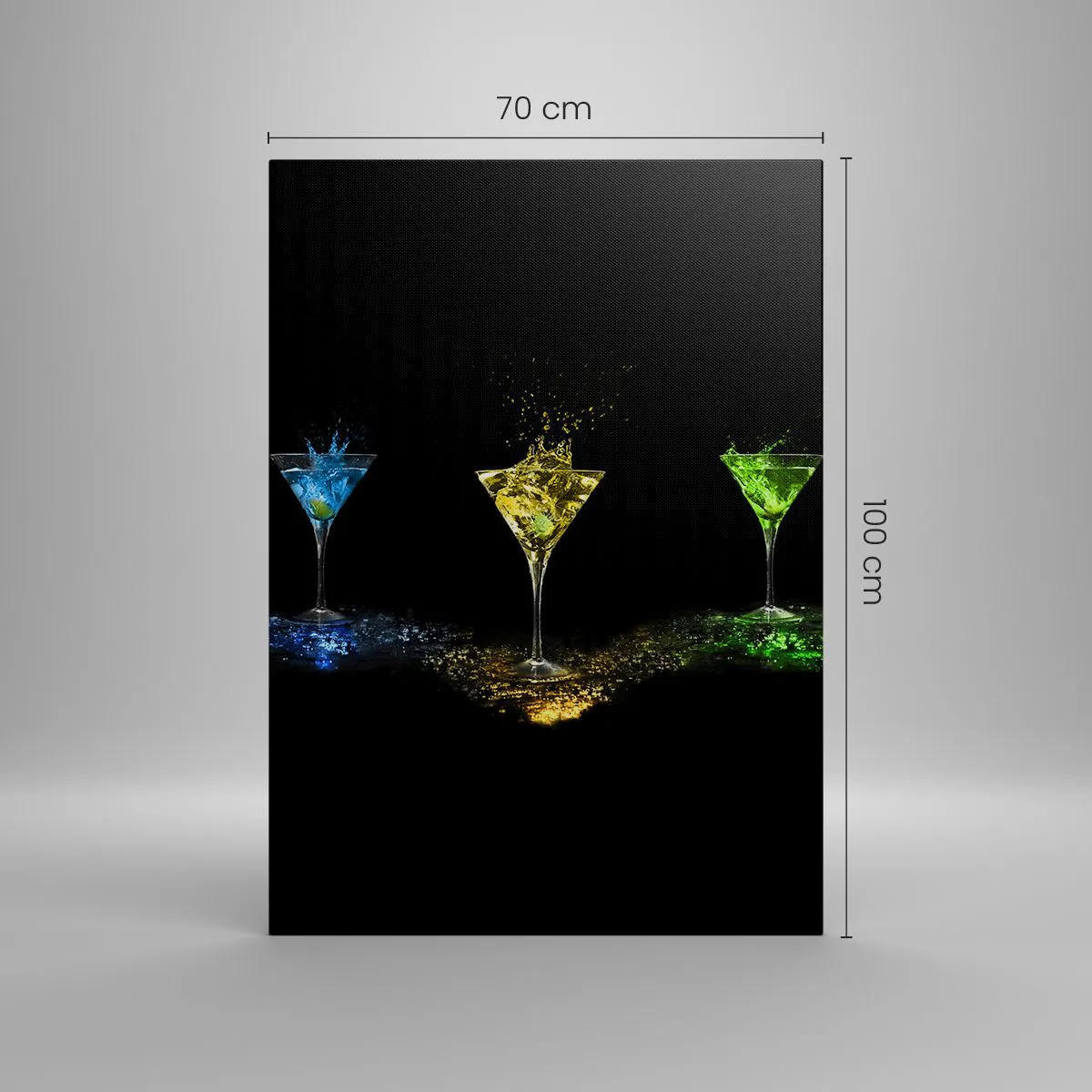 Bild auf Leinwand - Leinwandbild - Bunte Cocktails in Gläsern auf schwarzem Hintergrund - 70x100cm - Farben der Freude in Kristallglas - Moderne Wanddekoration für Wohnzimmer und Schlafzimmer ARTTOR
