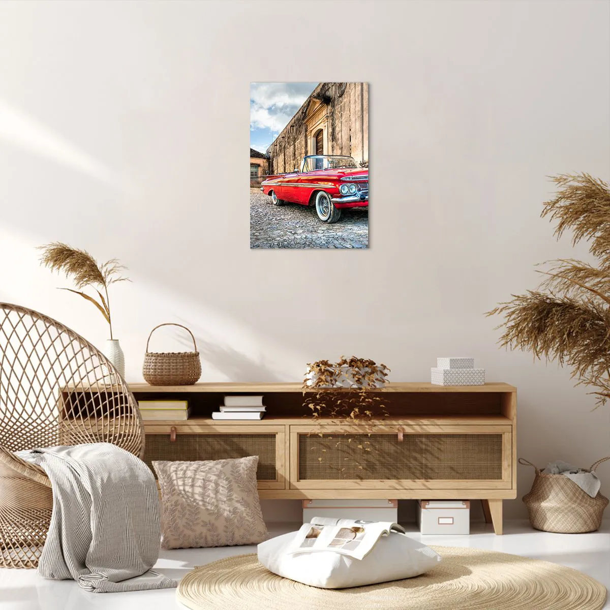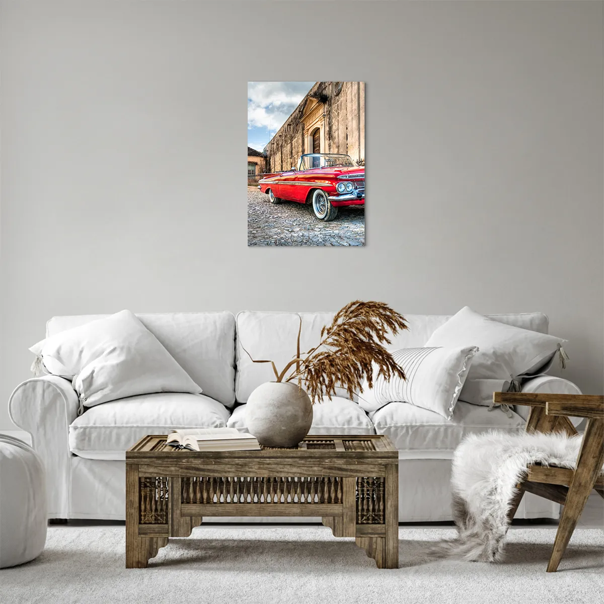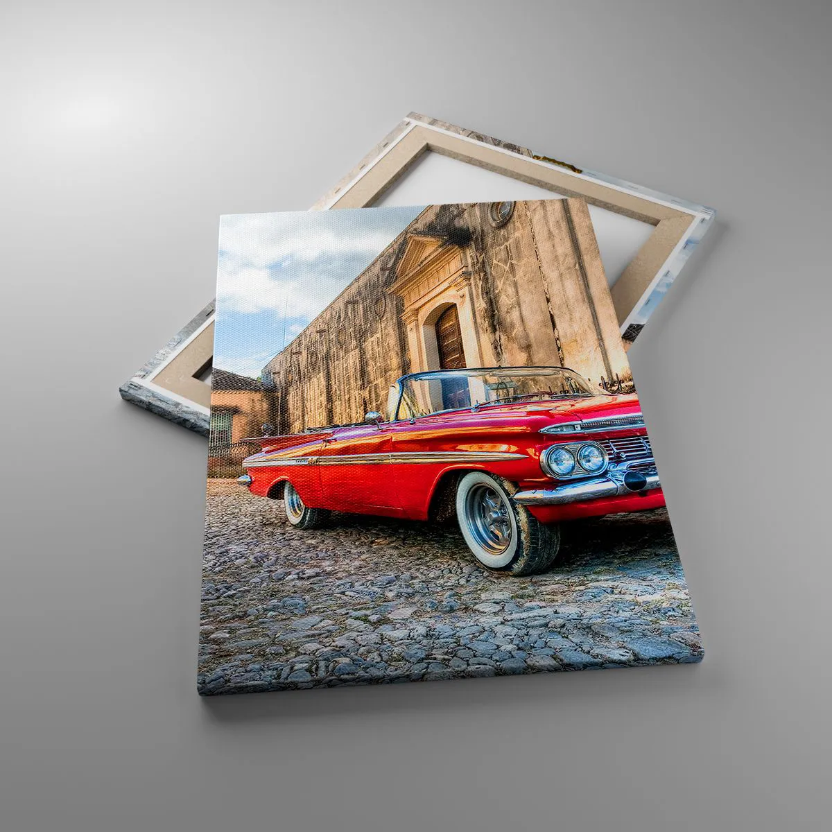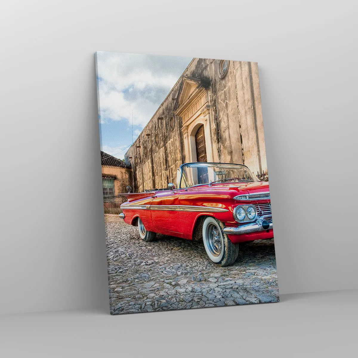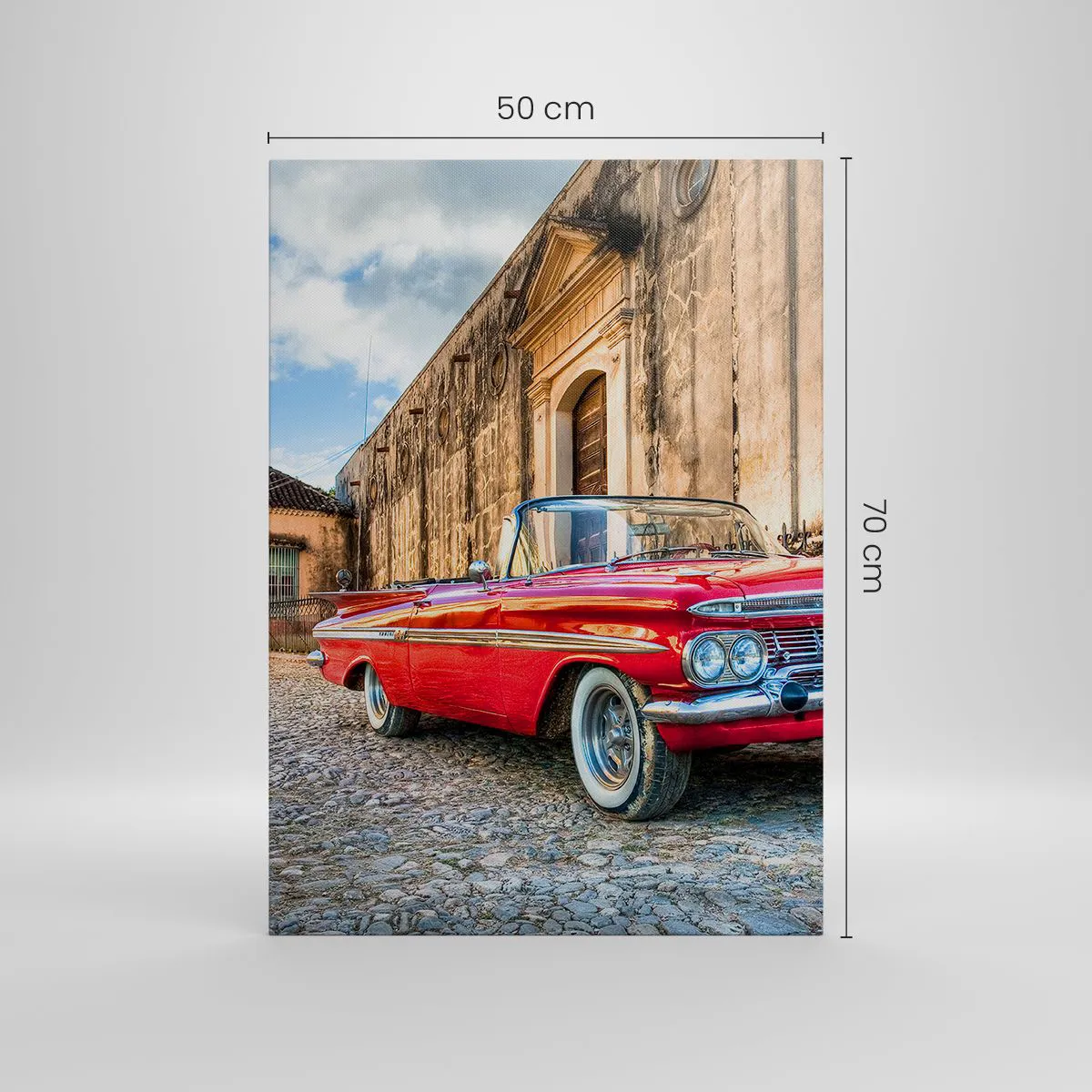 Bild auf Leinwand - Leinwandbild - Roter Oldtimer auf einer Kopfsteinpflasterstraße - 50x70cm - Kubanische Emotionen - Moderne Wanddekoration für Wohnzimmer und Schlafzimmer ARTTOR