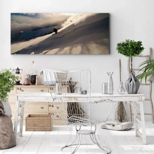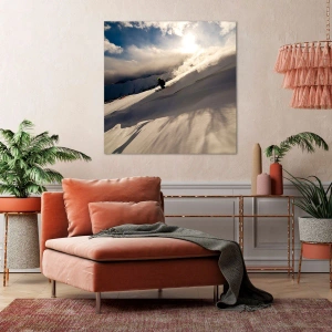 Bild auf Leinwand - Leinwandbild - Ein Skifahrer auf einer Piste, umgeben von Bergen und Schnee - 50x70cm - Bergherausforderung angenommen - Moderne Wanddekoration für Wohnzimmer und Schlafzimmer ARTTOR