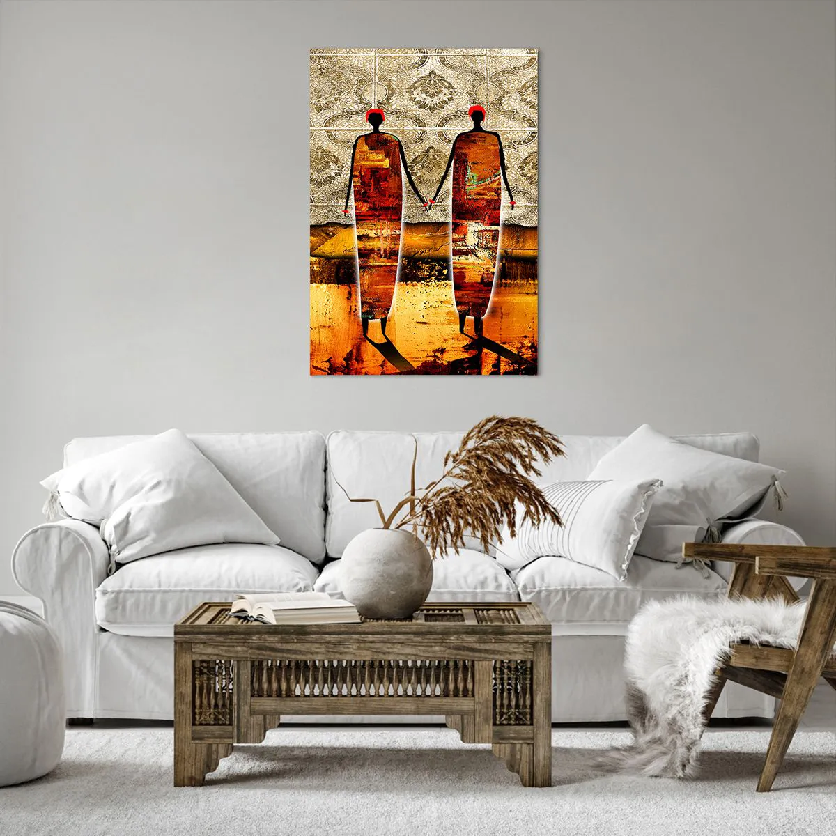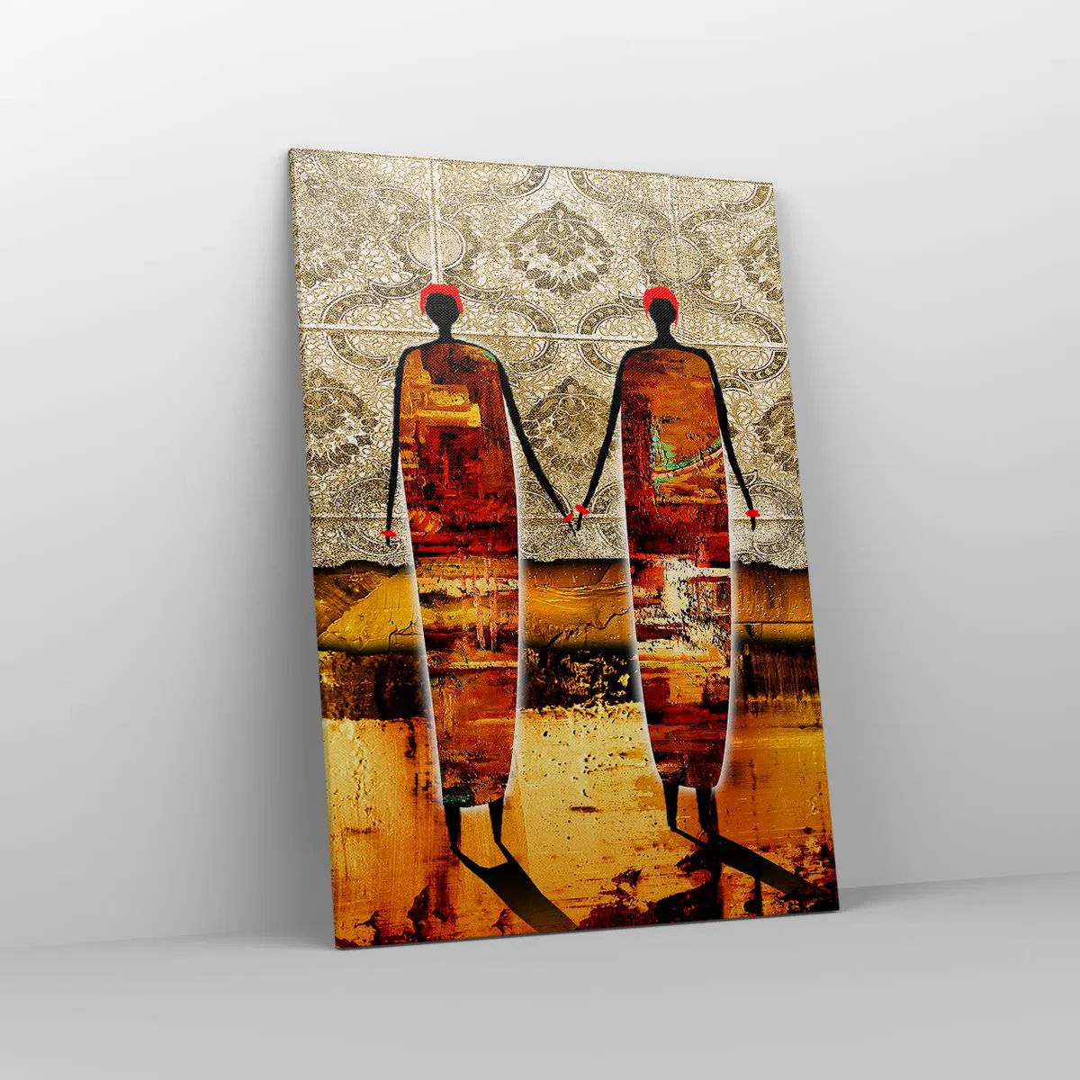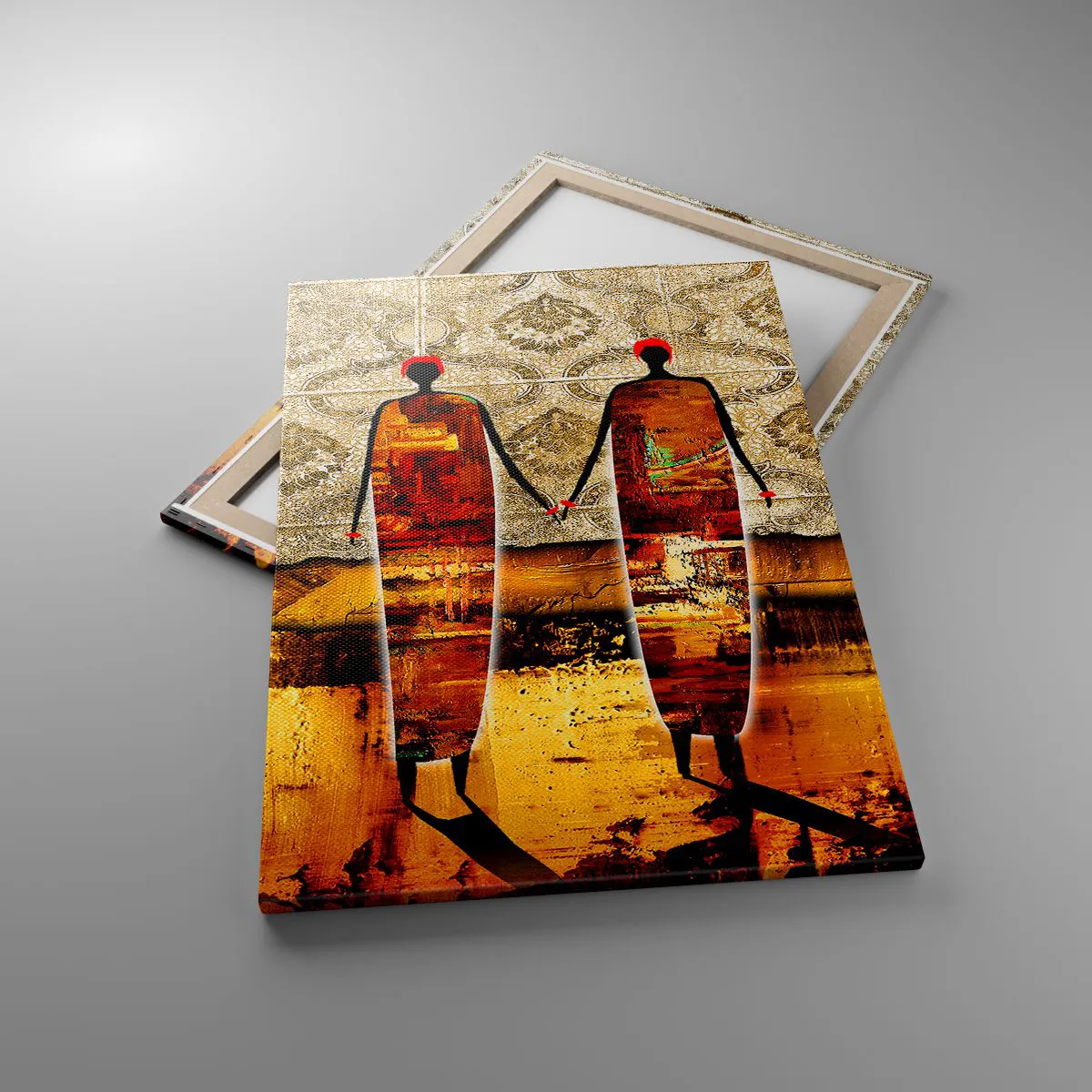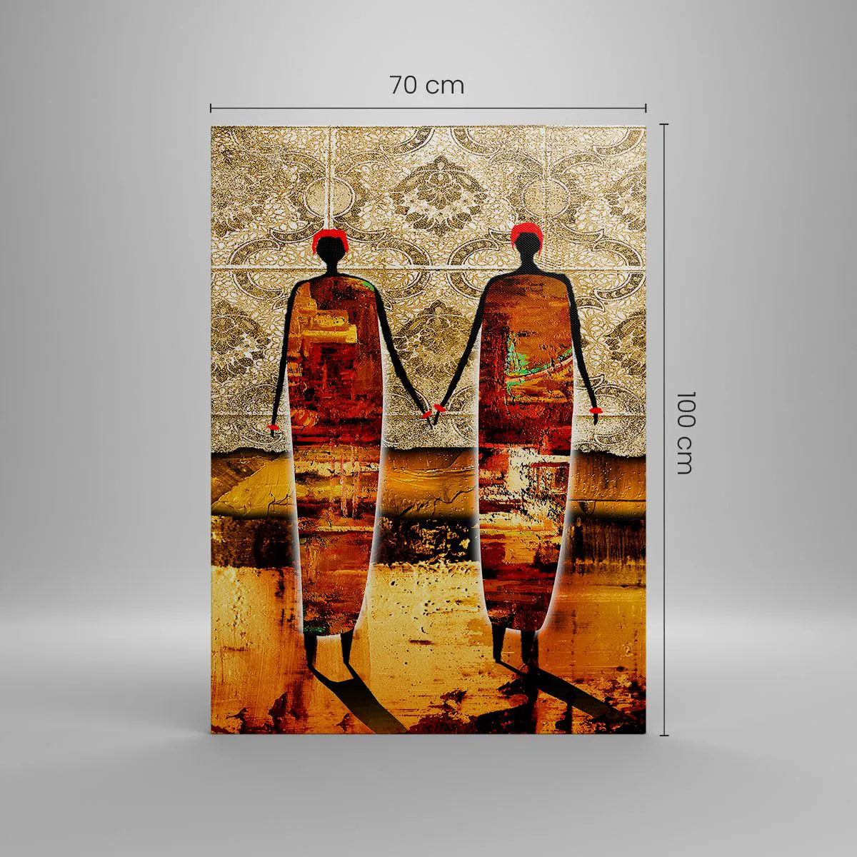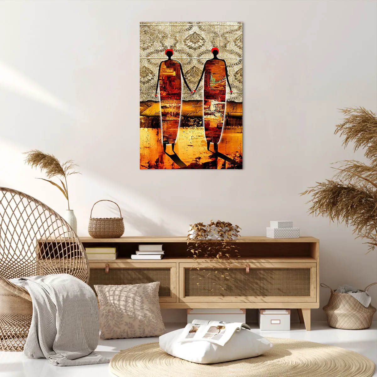 Bild auf Leinwand - Leinwandbild - Ein abstraktes Figurenpaar vor einem Hintergrund aus goldenen Mustern und einer Landschaft. - 70x100cm - Ethnische Zusammensetzung in den Farben Afrikas - Moderne Wanddekoration für Wohnzimmer und Schlafzimmer ARTTOR