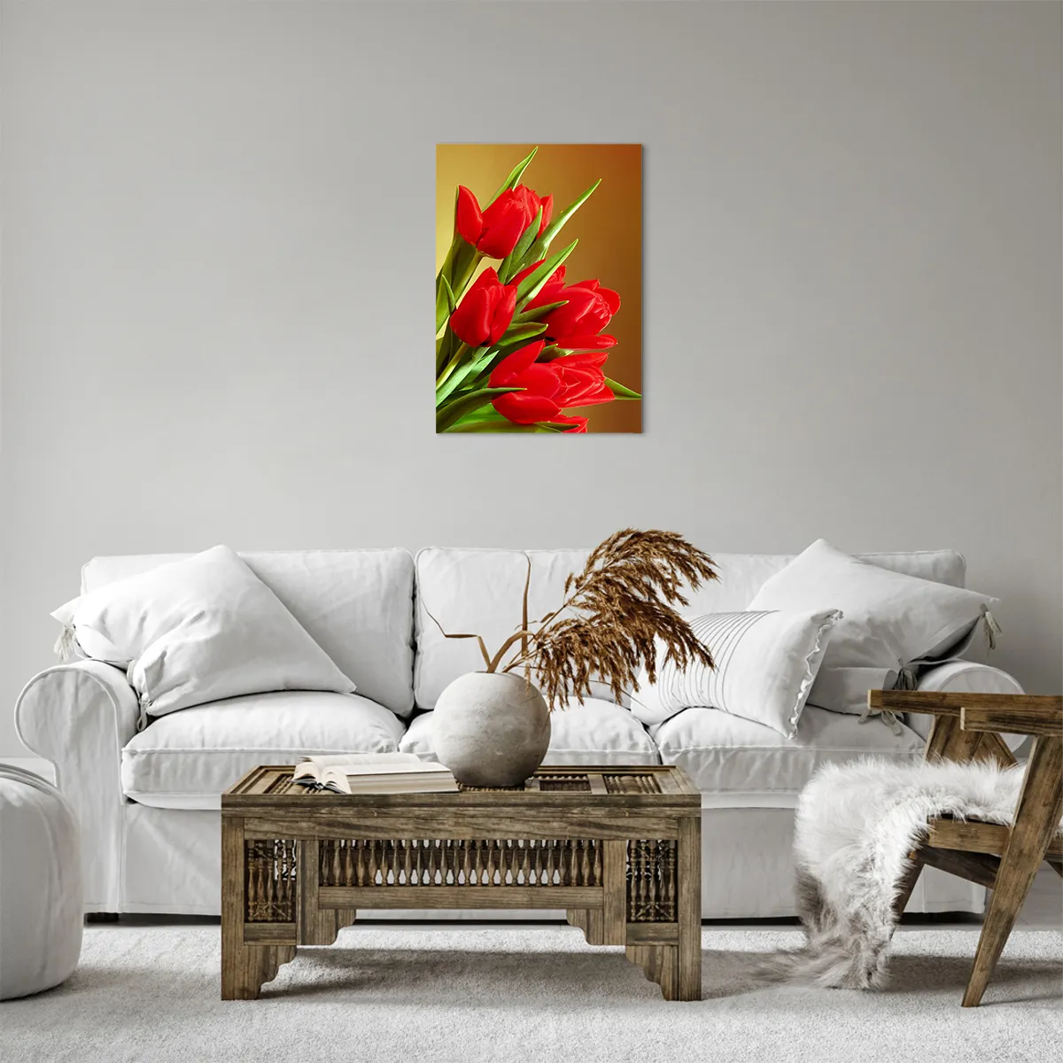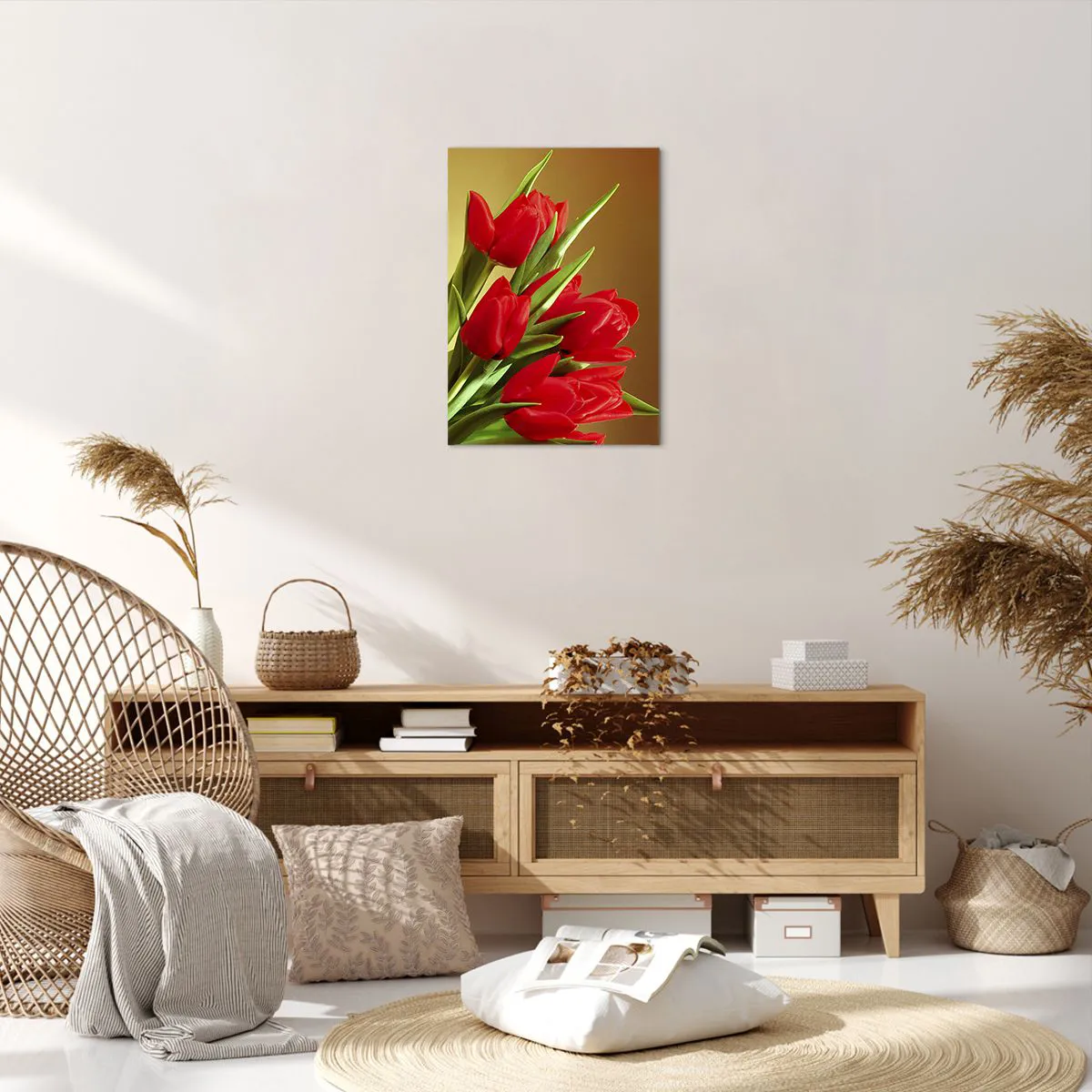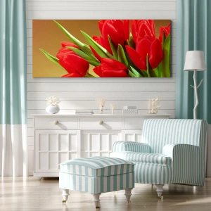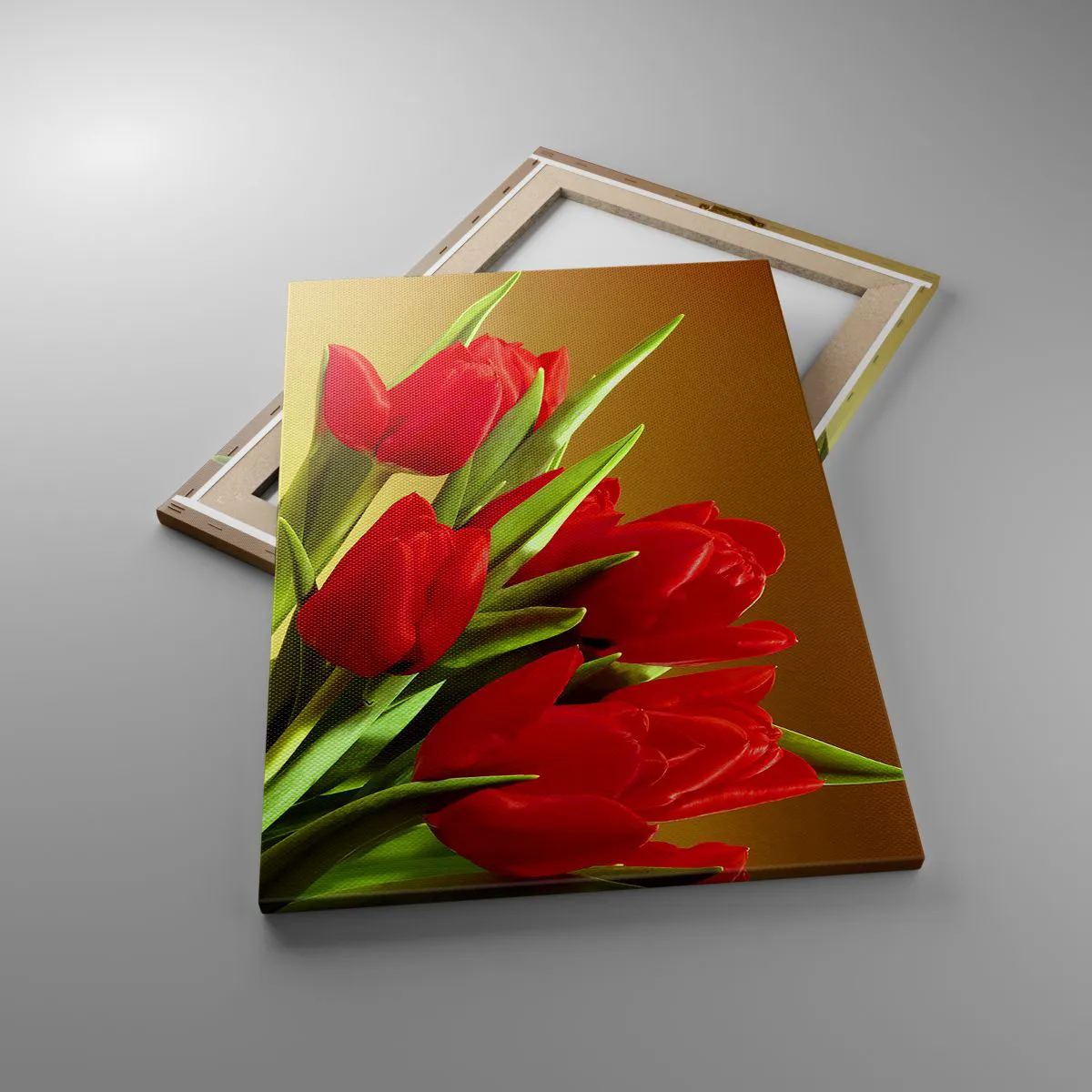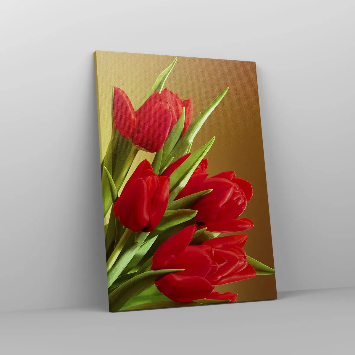 Bild auf Leinwand - Leinwandbild - Ein Strauß roter Tulpen auf goldenem Hintergrund mit grünen Blättern. - 50x70cm - Ein Haufen Frühlingsfreude - Moderne Wanddekoration für Wohnzimmer und Schlafzimmer ARTTOR