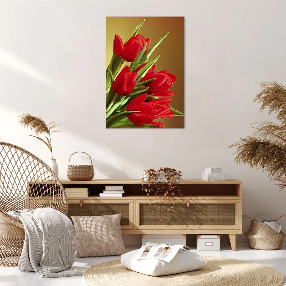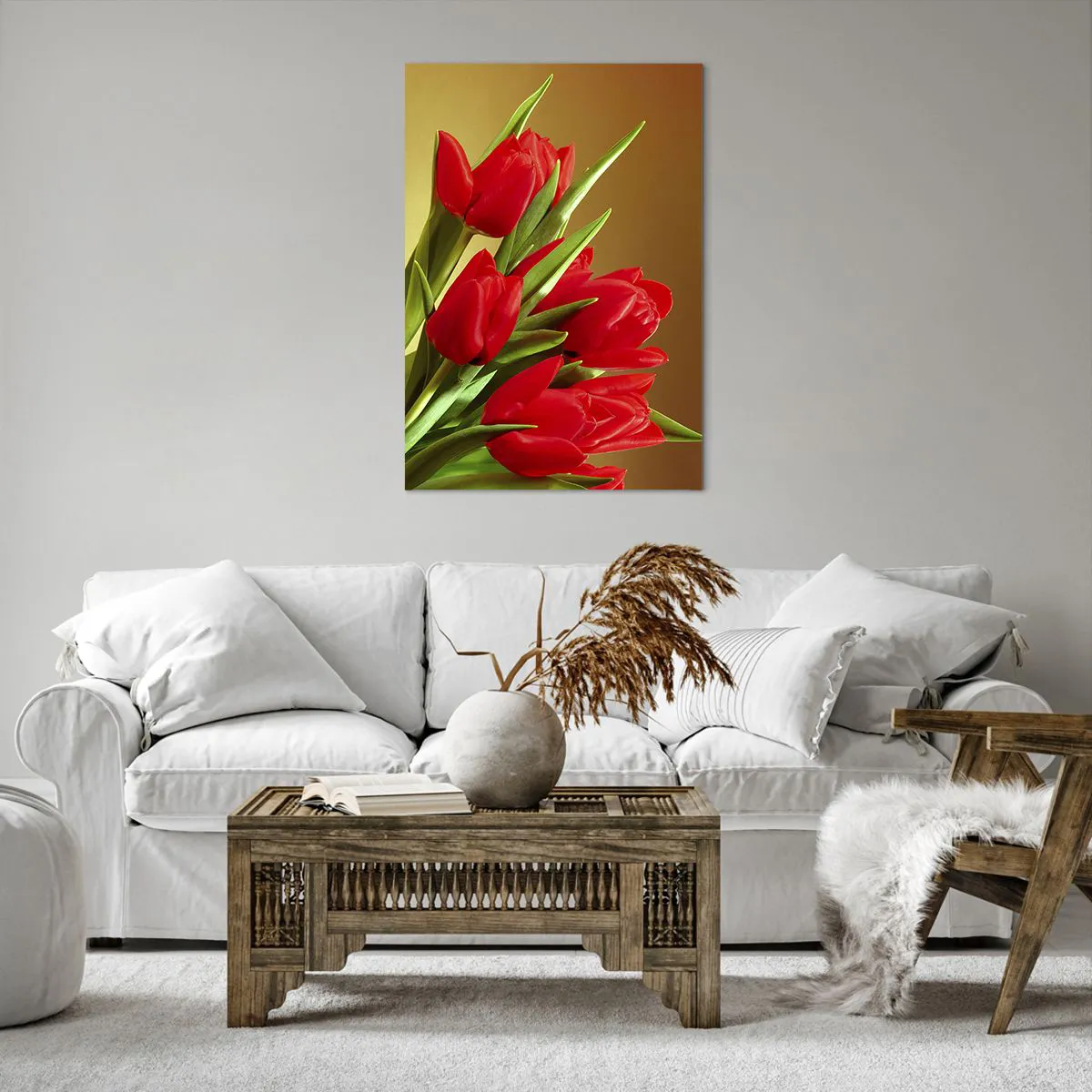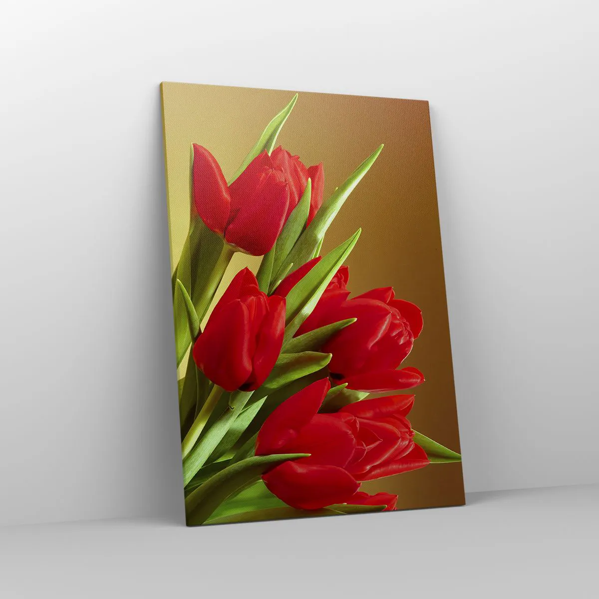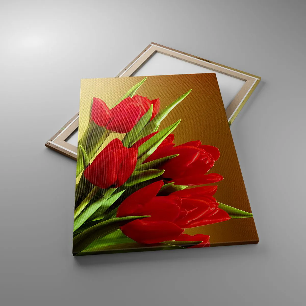Bild auf Leinwand - Leinwandbild - Ein Strauß roter Tulpen auf goldenem Hintergrund mit grünen Blättern. - 70x100cm - Ein Haufen Frühlingsfreude - Moderne Wanddekoration für Wohnzimmer und Schlafzimmer ARTTOR