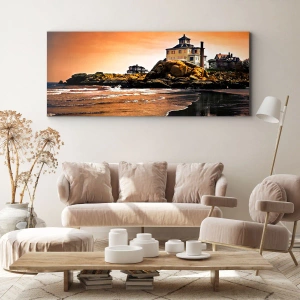 Bild auf Leinwand - Leinwandbild - Ein Haus auf einem Felsen am Strand bei Sonnenuntergang mit seiner Spiegelung im Wasser - 50x70cm - Eleganz der Westküste - Moderne Wanddekoration für Wohnzimmer und Schlafzimmer ARTTOR