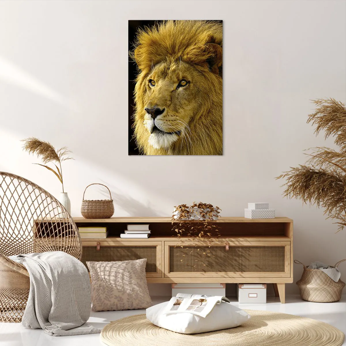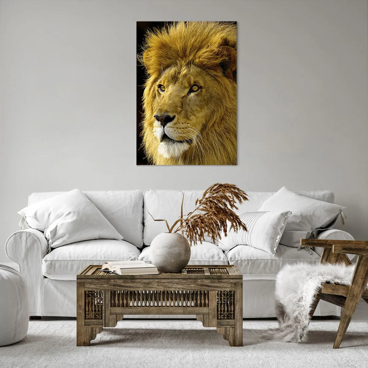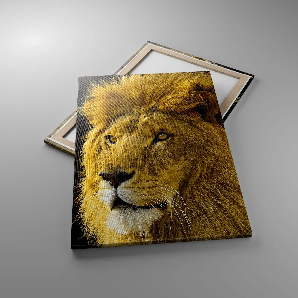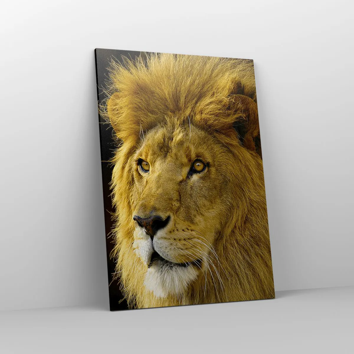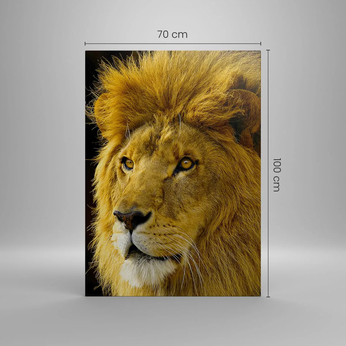 Bild auf Leinwand - Leinwandbild - Porträt eines Löwen mit majestätischer Mähne vor dunklem Hintergrund - 70x100cm - Porträt des Königs - Moderne Wanddekoration für Wohnzimmer und Schlafzimmer ARTTOR