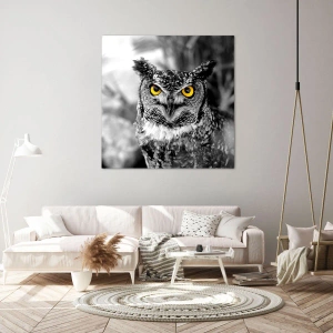 Bild auf Leinwand - Leinwandbild - Eine Schwarz-Weiß-Aufnahme einer Eule mit gelben Augen - 50x70cm - Nichts wird sich verstecken - Moderne Wanddekoration für Wohnzimmer und Schlafzimmer ARTTOR
