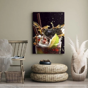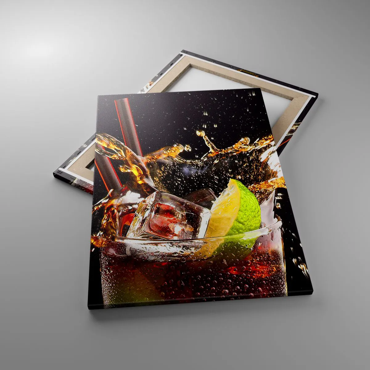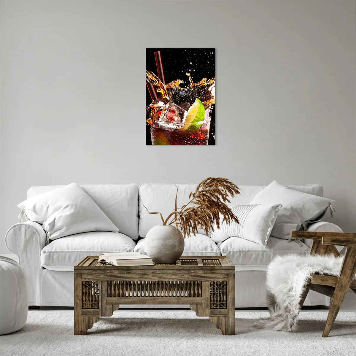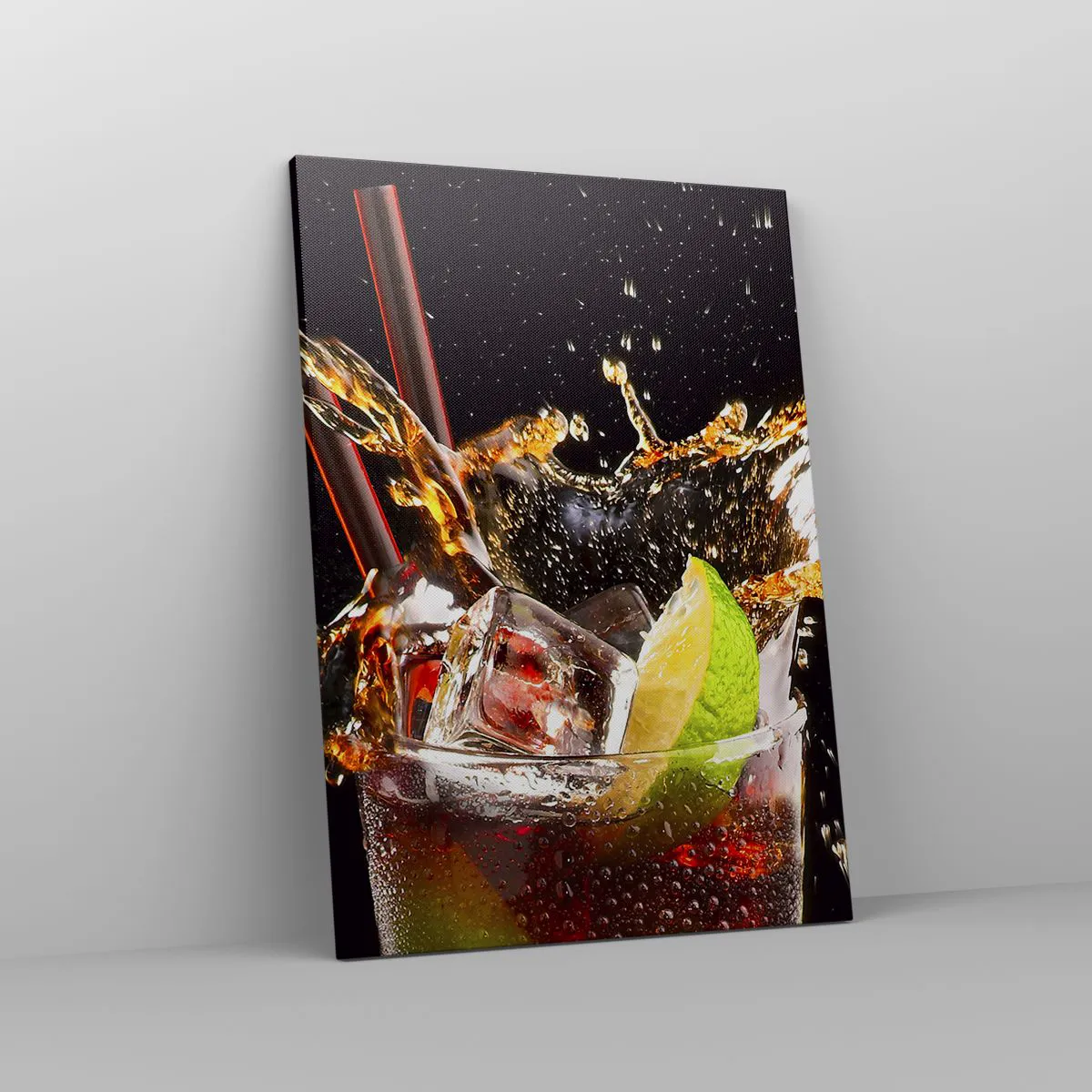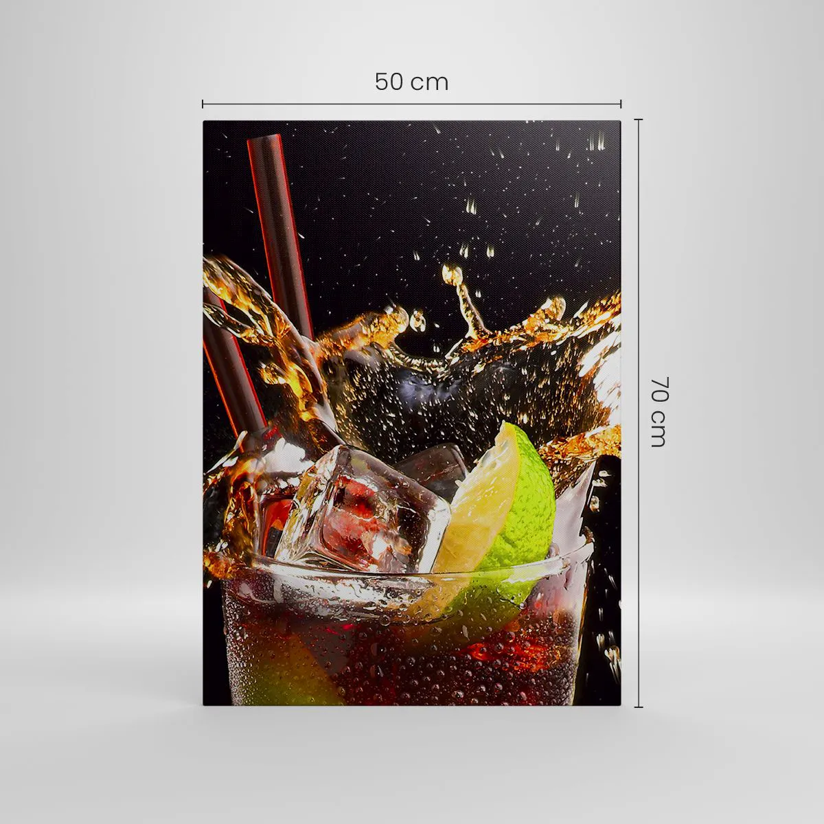 Bild auf Leinwand - Leinwandbild - Ein Glas Getränk, Limette und Eis im Moment des dynamischen Spritzens - 50x70cm - Freude und Energie der Farben - Moderne Wanddekoration für Wohnzimmer und Schlafzimmer ARTTOR