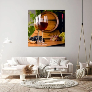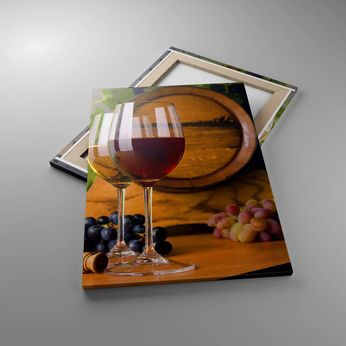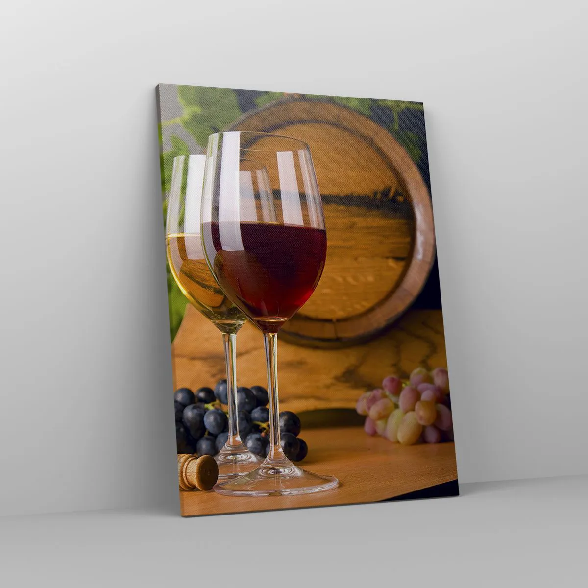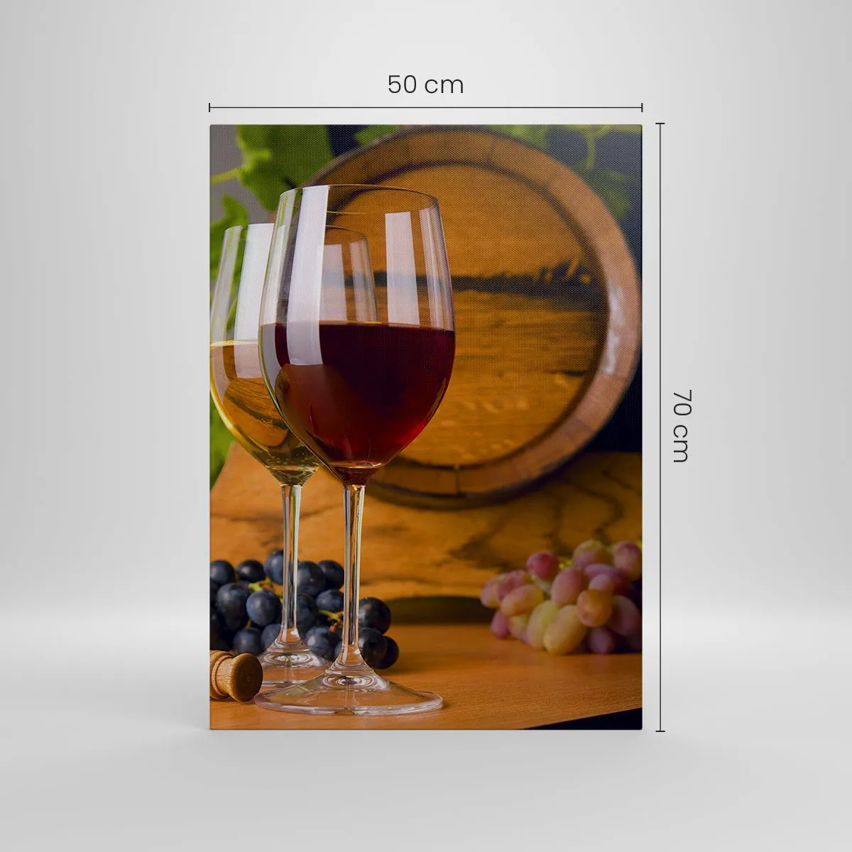 Bild auf Leinwand - Leinwandbild - Gläser Wein mit Trauben, ein Fass und Flaschen auf einem Holztisch - 50x70cm - Wie die alten Meister - Moderne Wanddekoration für Wohnzimmer und Schlafzimmer ARTTOR