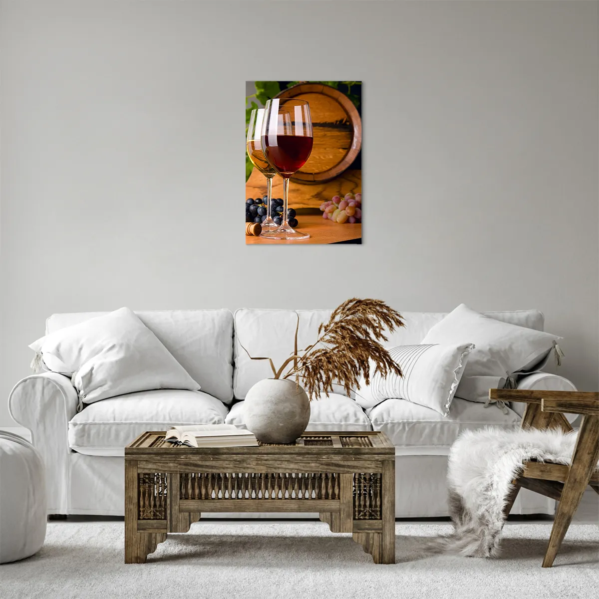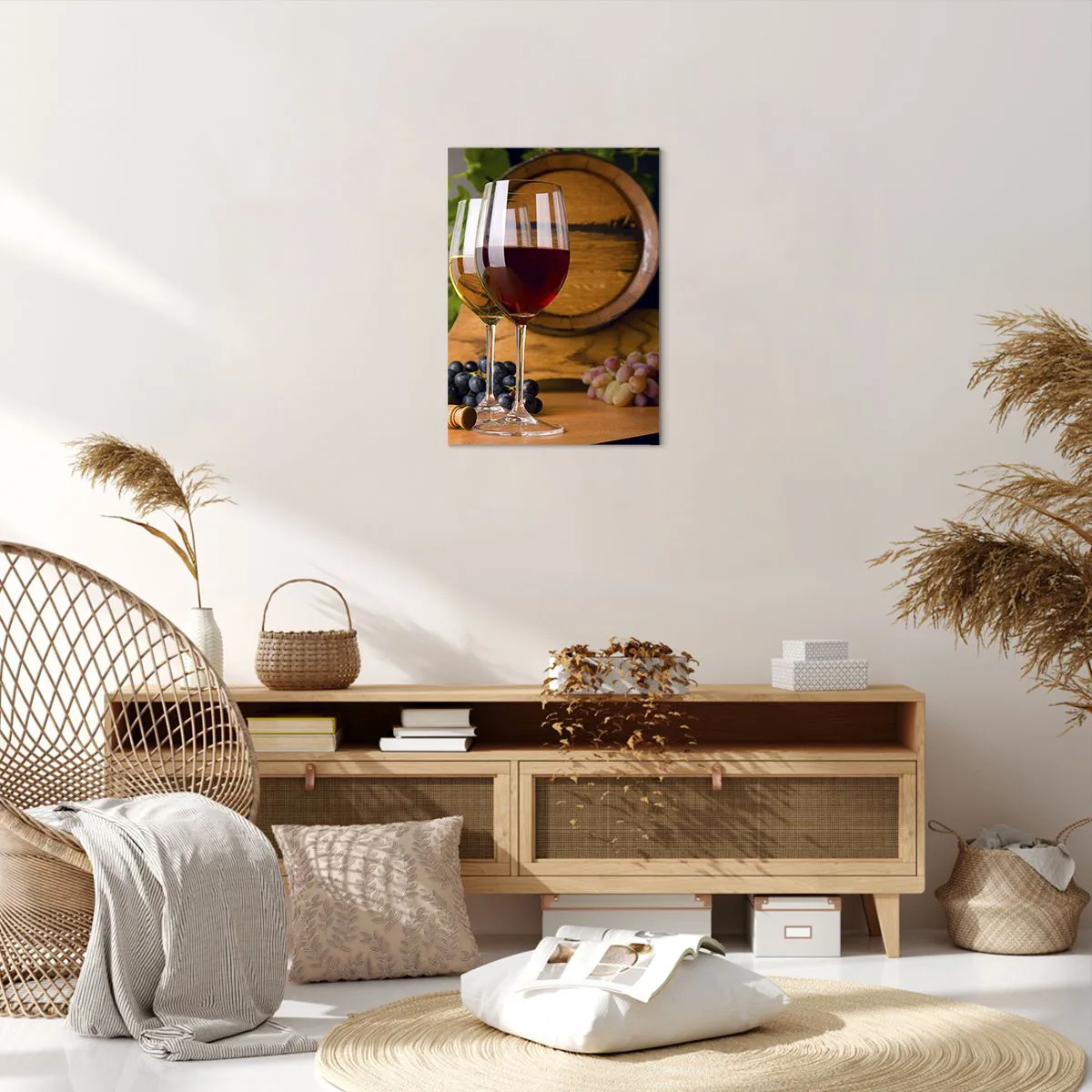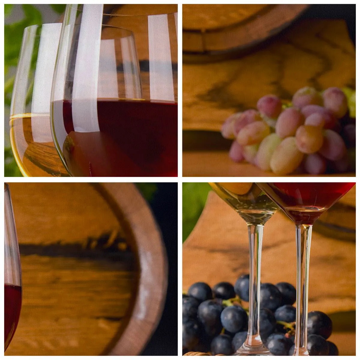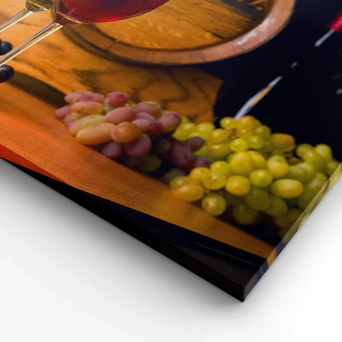 Bild auf Leinwand - Leinwandbild - Gläser Wein mit Trauben, ein Fass und Flaschen auf einem Holztisch - 50x70cm - Wie die alten Meister - Moderne Wanddekoration für Wohnzimmer und Schlafzimmer ARTTOR