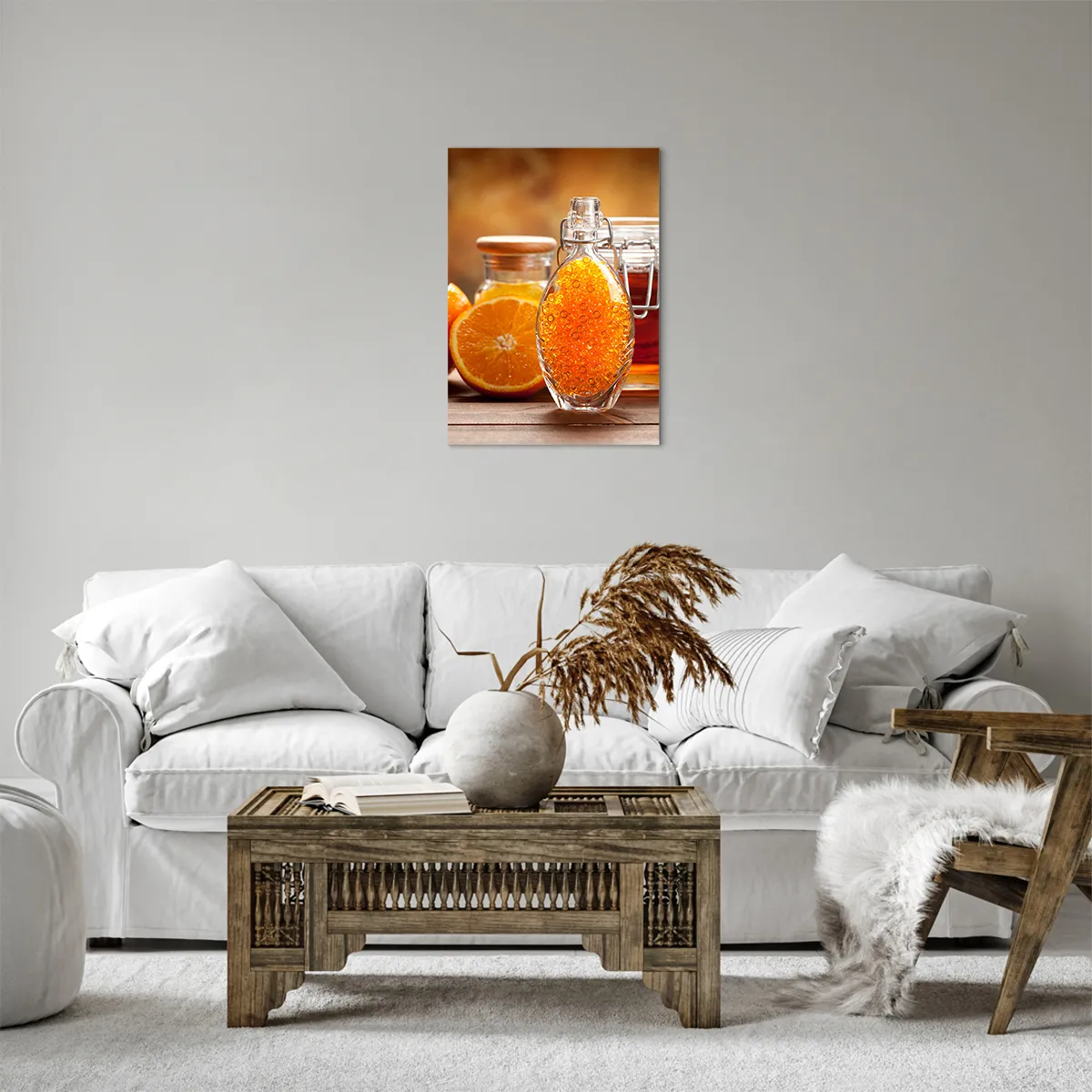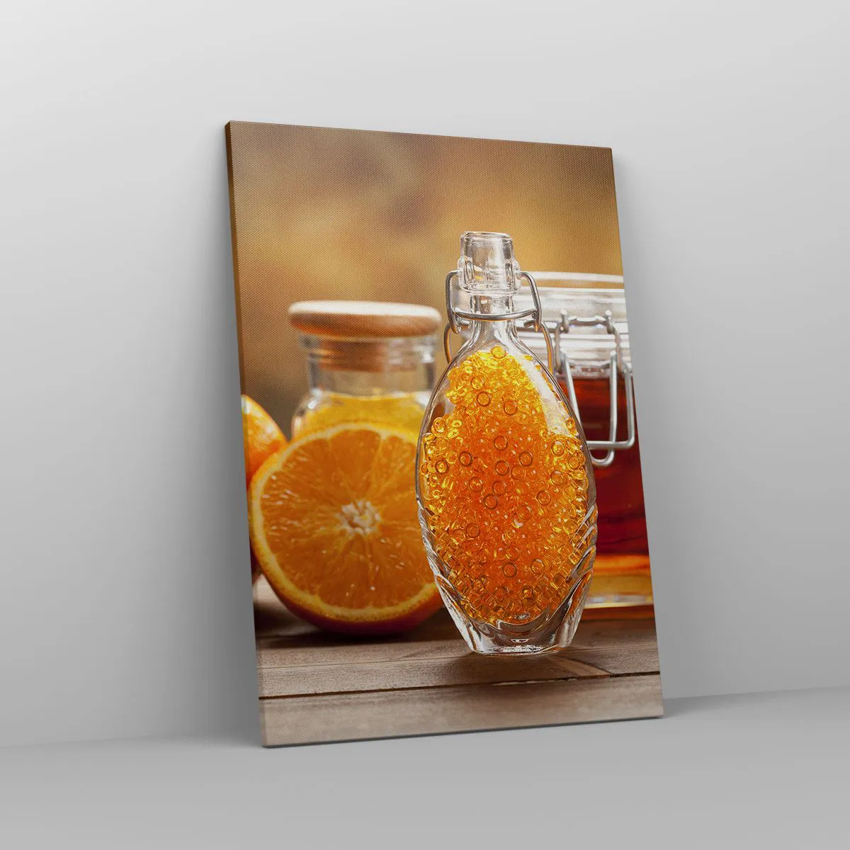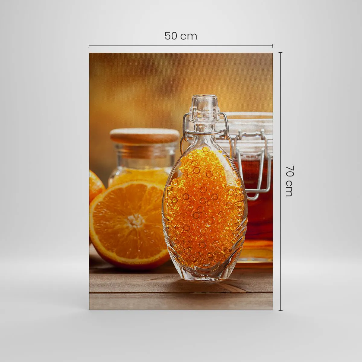 Bild auf Leinwand - Leinwandbild - Eine Flasche bernsteinfarbene Flüssigkeit und frische Orangen - 50x70cm - Sonnige Aromen und Düfte - Moderne Wanddekoration für Wohnzimmer und Schlafzimmer ARTTOR