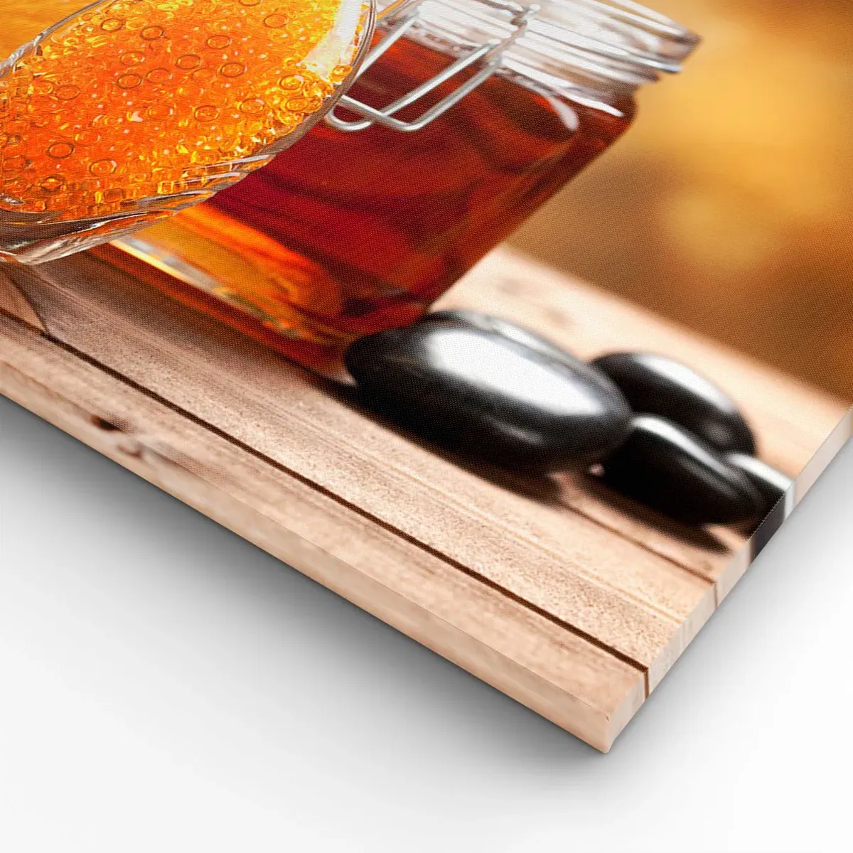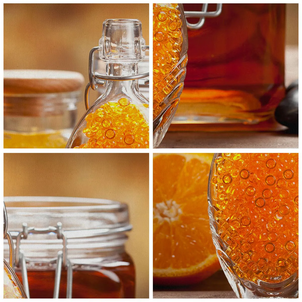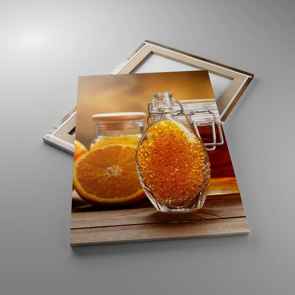Bild auf Leinwand - Leinwandbild - Eine Flasche bernsteinfarbene Flüssigkeit und frische Orangen - 50x70cm - Sonnige Aromen und Düfte - Moderne Wanddekoration für Wohnzimmer und Schlafzimmer ARTTOR