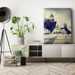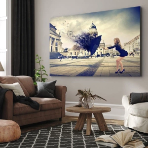 Bild auf Leinwand - Leinwandbild - Eine Frau mit Regenschirm in einer künstlerischen Komposition vor urbanem Hintergrund - 50x70cm - Es weht so ein Wind ... - Moderne Wanddekoration für Wohnzimmer und Schlafzimmer ARTTOR