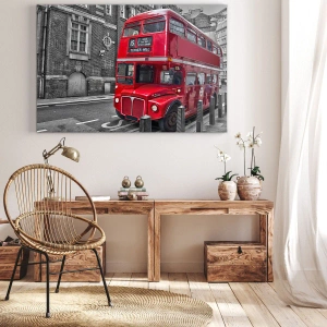 Bild auf Leinwand - Leinwandbild - Ein roter Doppeldeckerbus in London vor der Kulisse klassischer Architektur - 80x120cm - Immer gleich - Moderne Wanddekoration für Wohnzimmer und Schlafzimmer ARTTOR