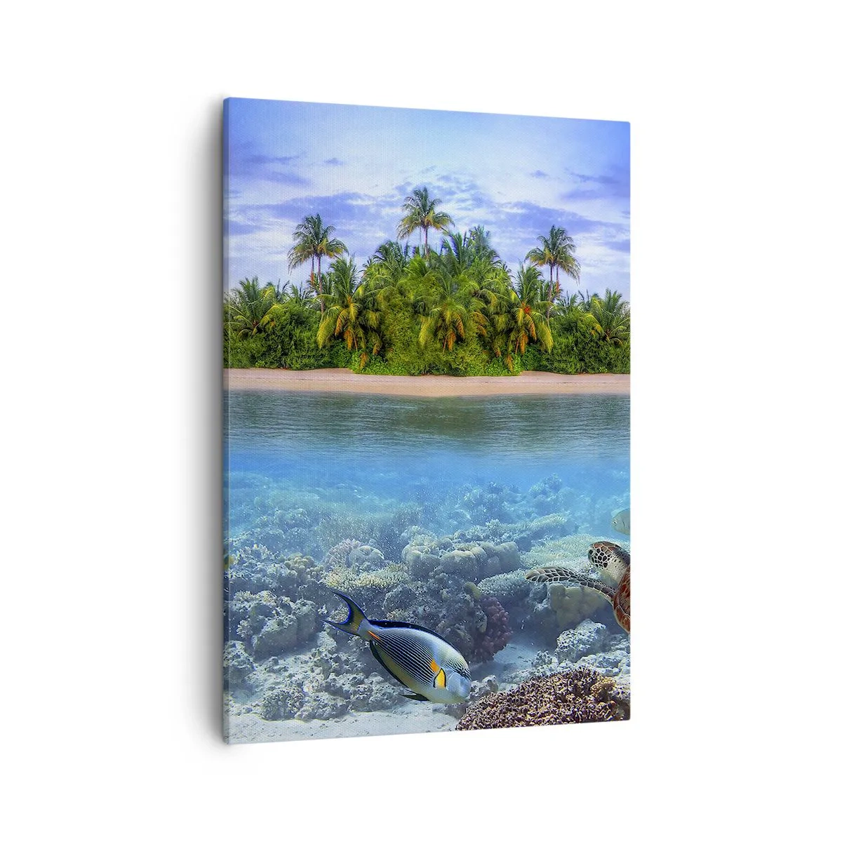 Bild auf Leinwand - Leinwandbild - Eine tropische Insel, umgeben von einem türkisfarbenen Ozean mit einem Korallenriff und Fischen. - 50x70cm - Heavenly Island lädt dich ein - Moderne Wanddekoration für Wohnzimmer und Schlafzimmer ARTTOR