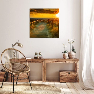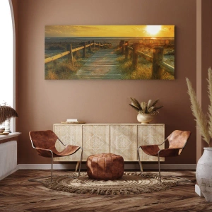 Bild auf Leinwand - Leinwandbild - Ein Holzweg, der im Schein der untergehenden Sonne zum Strand führt - 50x70cm - In altem Gold gebadet - Moderne Wanddekoration für Wohnzimmer und Schlafzimmer ARTTOR