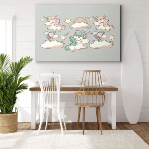 Bild auf Leinwand - Leinwandbild - Niedliche Einhörner auf pastellfarbenem Hintergrund - 50x70cm - Sicherlich gibt es... - Moderne Wanddekoration für Wohnzimmer und Schlafzimmer ARTTOR