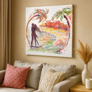Bild auf Leinwand - Leinwandbild - Romantische Paarszene an einem Strand mit Palmen in Aquarell - 70x100cm - Romantischer Urlaub - Moderne Wanddekoration für Wohnzimmer und Schlafzimmer ARTTOR