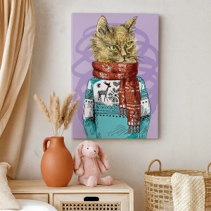 Bild auf Leinwand - Leinwandbild - Eine Katze in Pullover und Schal auf violettem Hintergrund - 50x70cm - Die Katze nicht nur in Schuhen - Moderne Wanddekoration für Wohnzimmer und Schlafzimmer ARTTOR