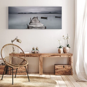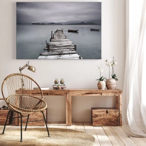 Bild auf Leinwand - Leinwandbild - Eine Holzbrücke, die zur ruhigen Oberfläche des Sees führt - 70x100cm - Du kannst morgen gehen - Moderne Wanddekoration für Wohnzimmer und Schlafzimmer ARTTOR