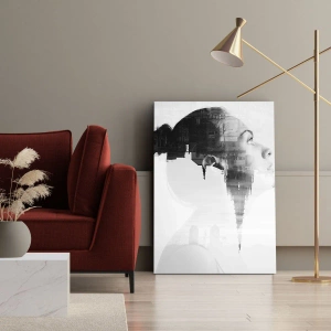 Bild auf Leinwand - Leinwandbild - Porträt einer Frau mit den Umrissen einer Stadt im Hintergrund, schwarz-weiße Farben - 70x100cm - Auf beiden Seiten des Glases - Moderne Wanddekoration für Wohnzimmer und Schlafzimmer ARTTOR