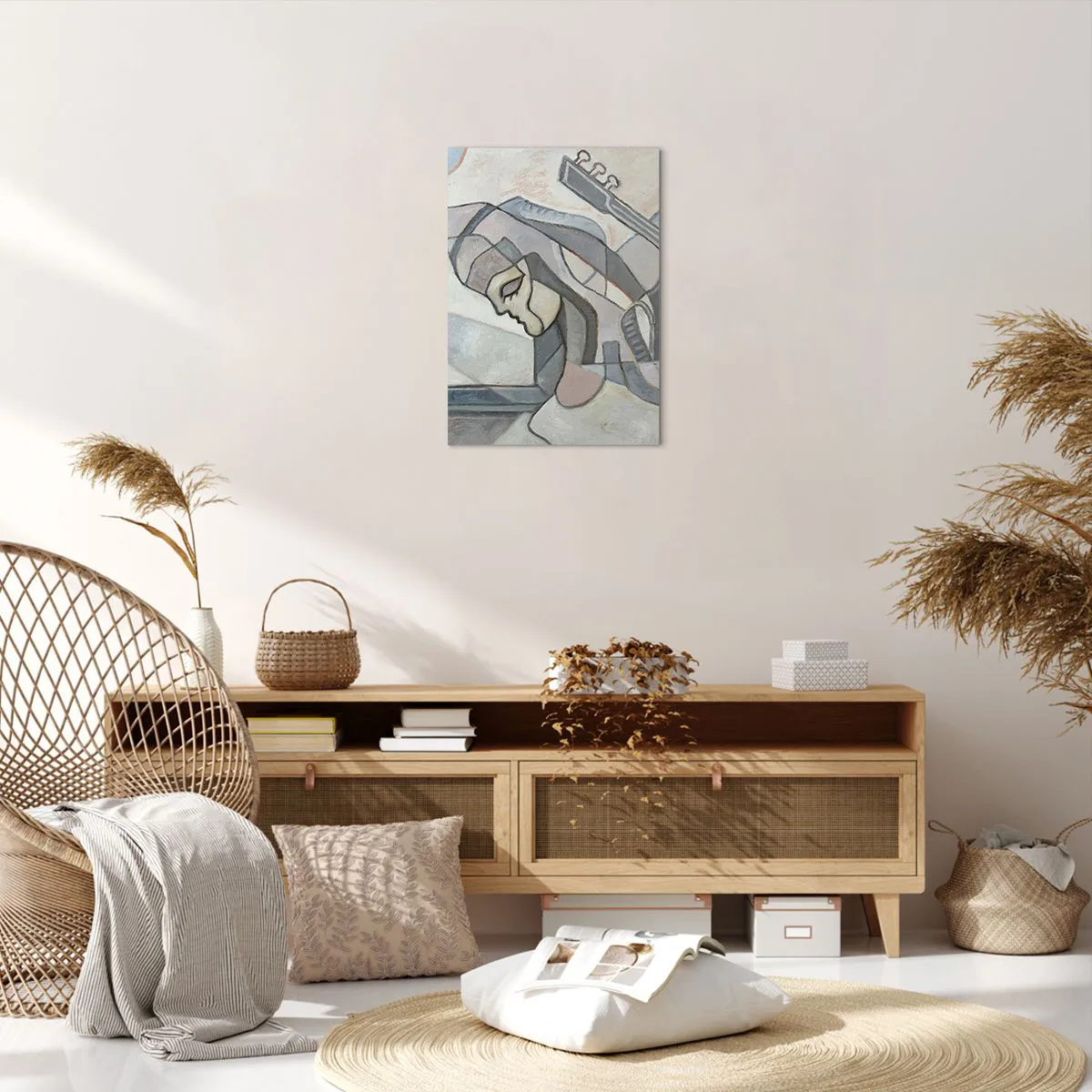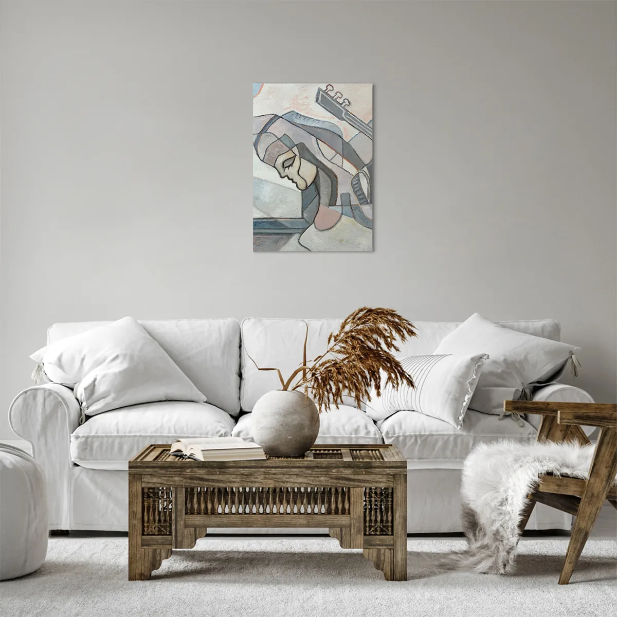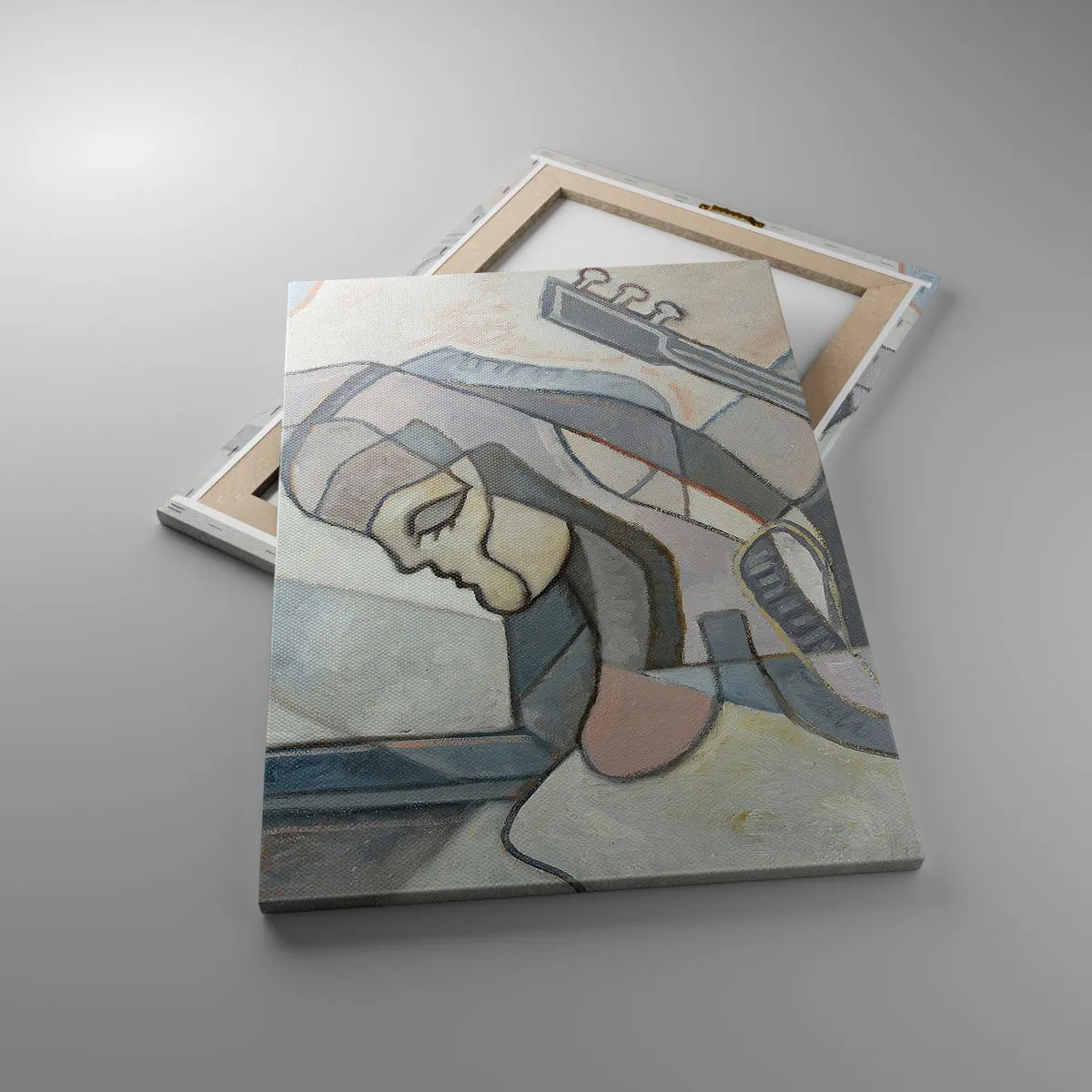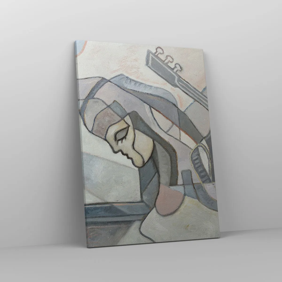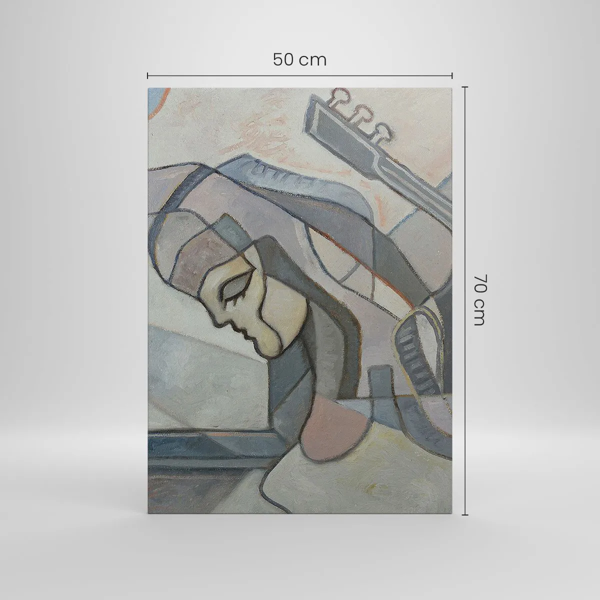 Bild auf Leinwand - Leinwandbild - Eine abstrakte Figur mit einer Gitarre in Pastellfarben. - 50x70cm - In der Kraft der Musik - Moderne Wanddekoration für Wohnzimmer und Schlafzimmer ARTTOR