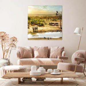 Bild auf Leinwand - Leinwandbild - Elefanten und Wildtiere an einer Wasserstelle bei Sonnenuntergang - 50x70cm - Ein Fluss floss aus Eden ... - Moderne Wanddekoration für Wohnzimmer und Schlafzimmer ARTTOR