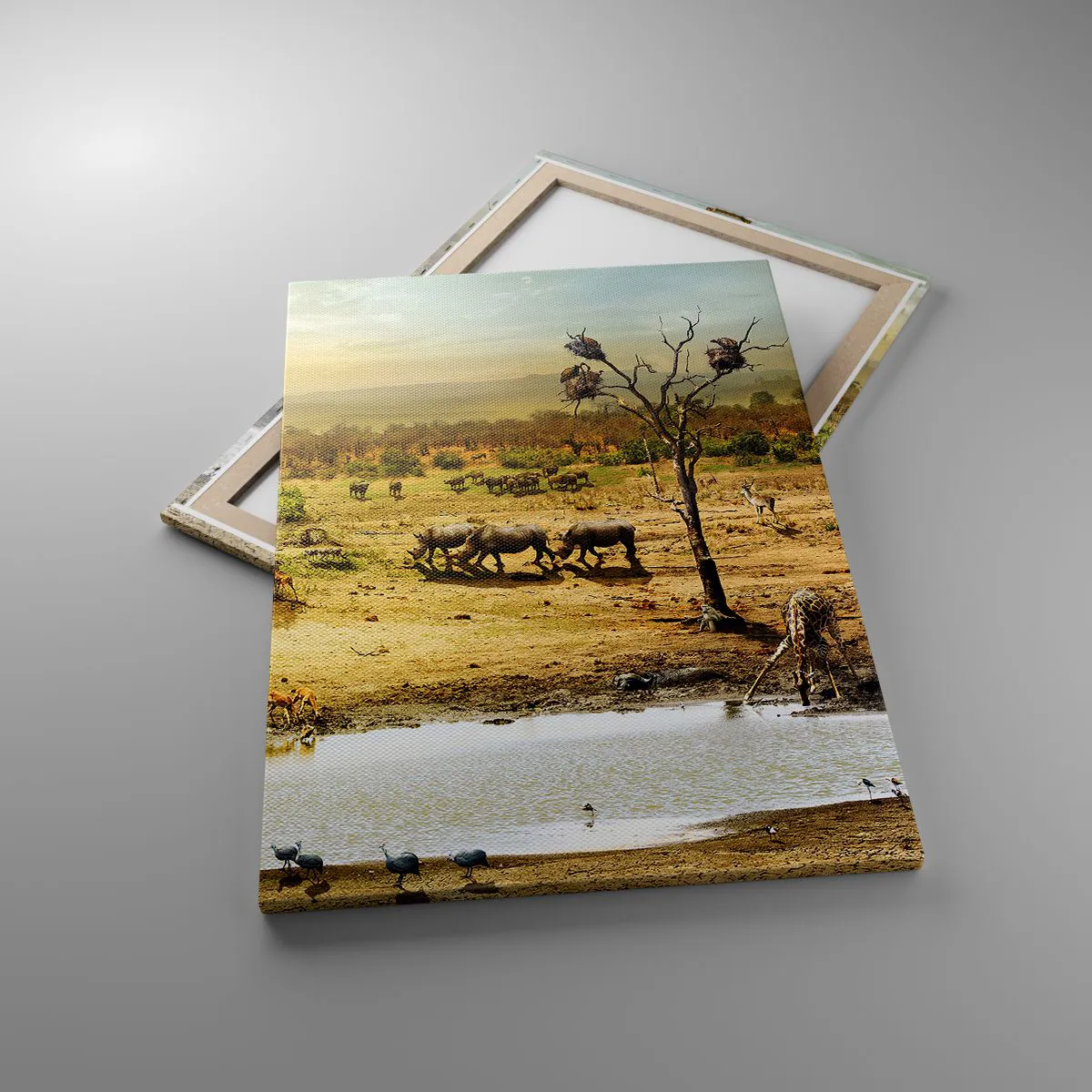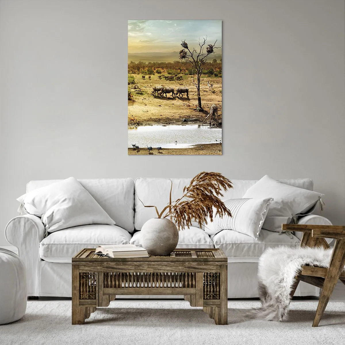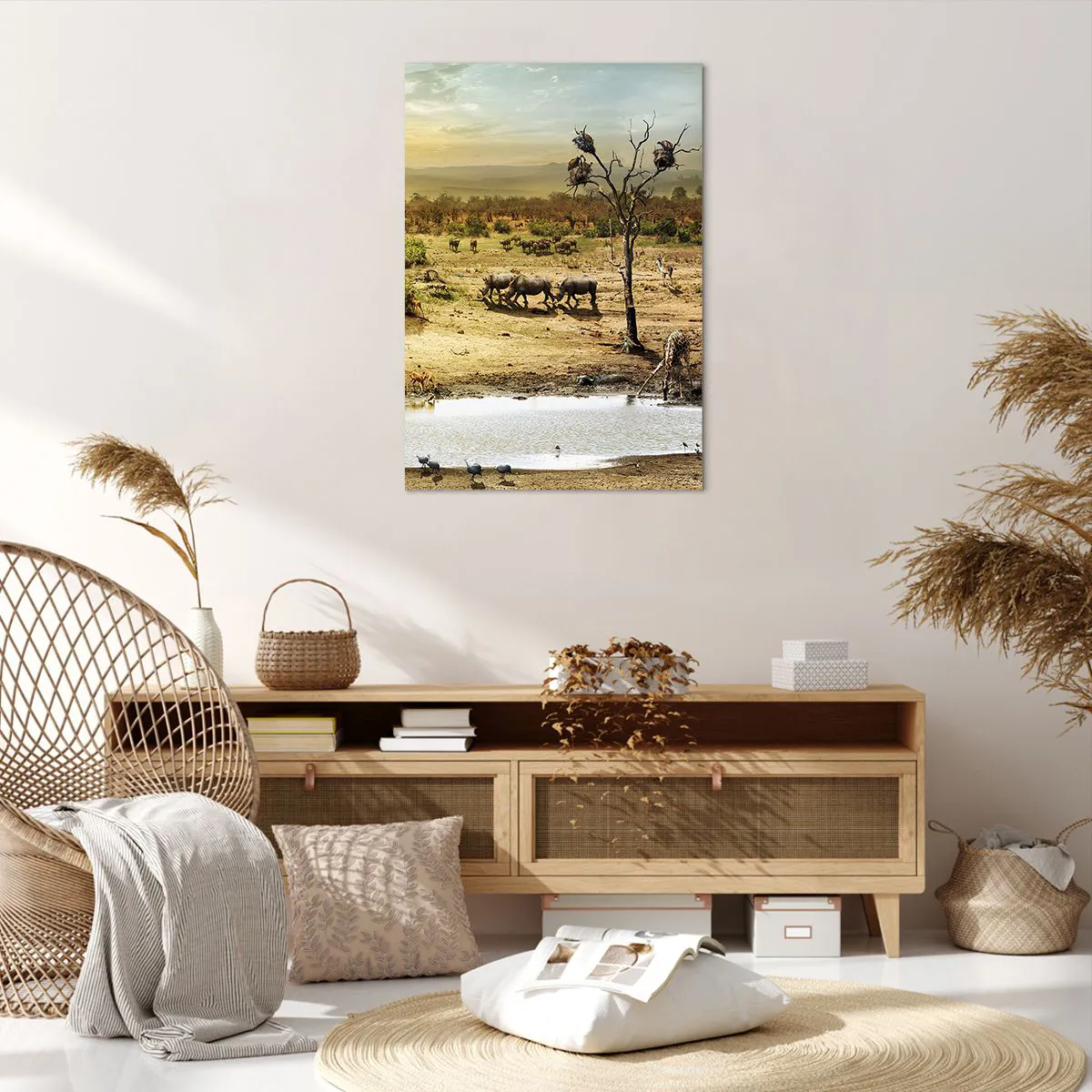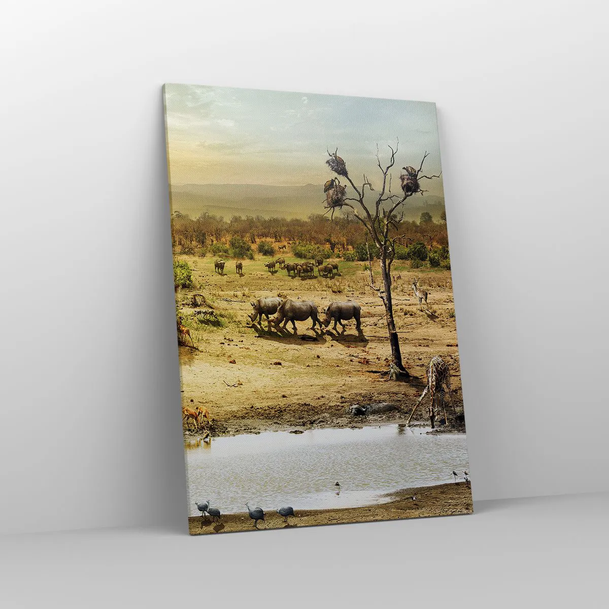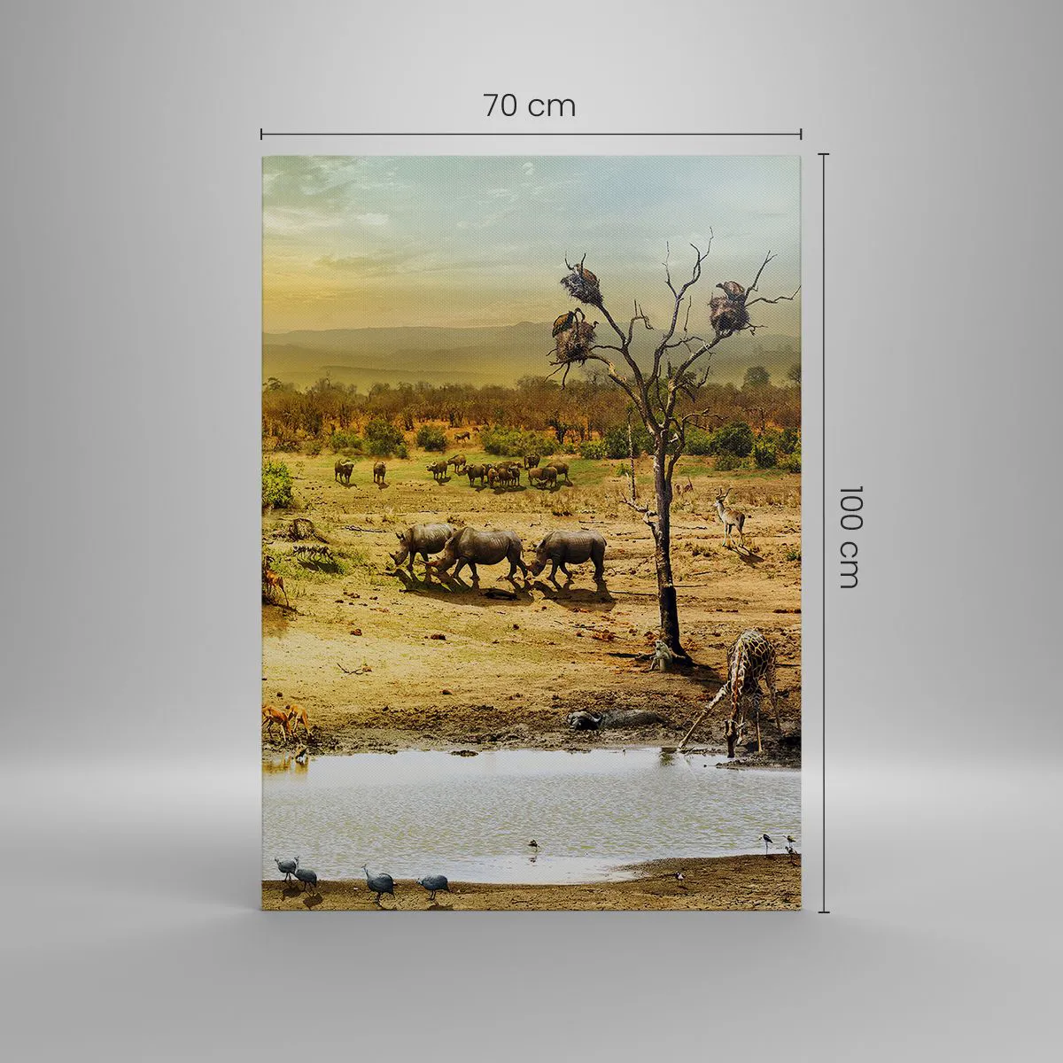 Bild auf Leinwand - Leinwandbild - Elefanten und Wildtiere an einer Wasserstelle bei Sonnenuntergang - 70x100cm - Ein Fluss floss aus Eden ... - Moderne Wanddekoration für Wohnzimmer und Schlafzimmer ARTTOR
