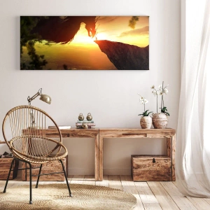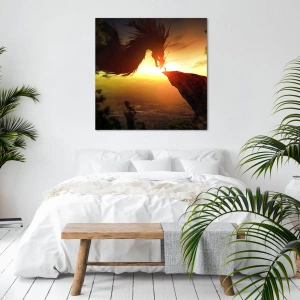 Bild auf Leinwand - Leinwandbild - Ein Drache und ein Mann auf einem Felsen im Schein der untergehenden Sonne - 50x70cm - Drachentöter - Moderne Wanddekoration für Wohnzimmer und Schlafzimmer ARTTOR