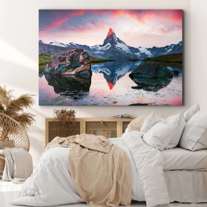 • Das Gemälde zeigt einen majestätischen Berggipfel, der sich in einem ruhigen See spiegelt, umrahmt von den warmen Farbtönen eines Sonnenuntergangs. Eine perfekte Wahl für Liebhaber der Natur und einzigartiger Landschaften.