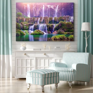 Bild auf Leinwand - Leinwandbild - Wasserfälle umgeben von Grün mit pastellfarbener Beleuchtung - 50x70cm - Treppe zum Himmel - Moderne Wanddekoration für Wohnzimmer und Schlafzimmer ARTTOR