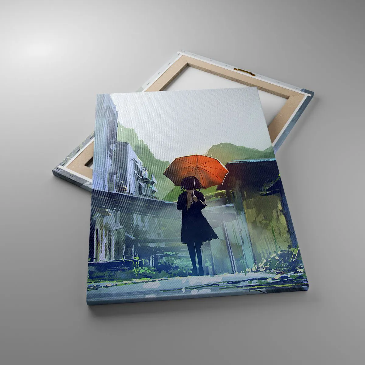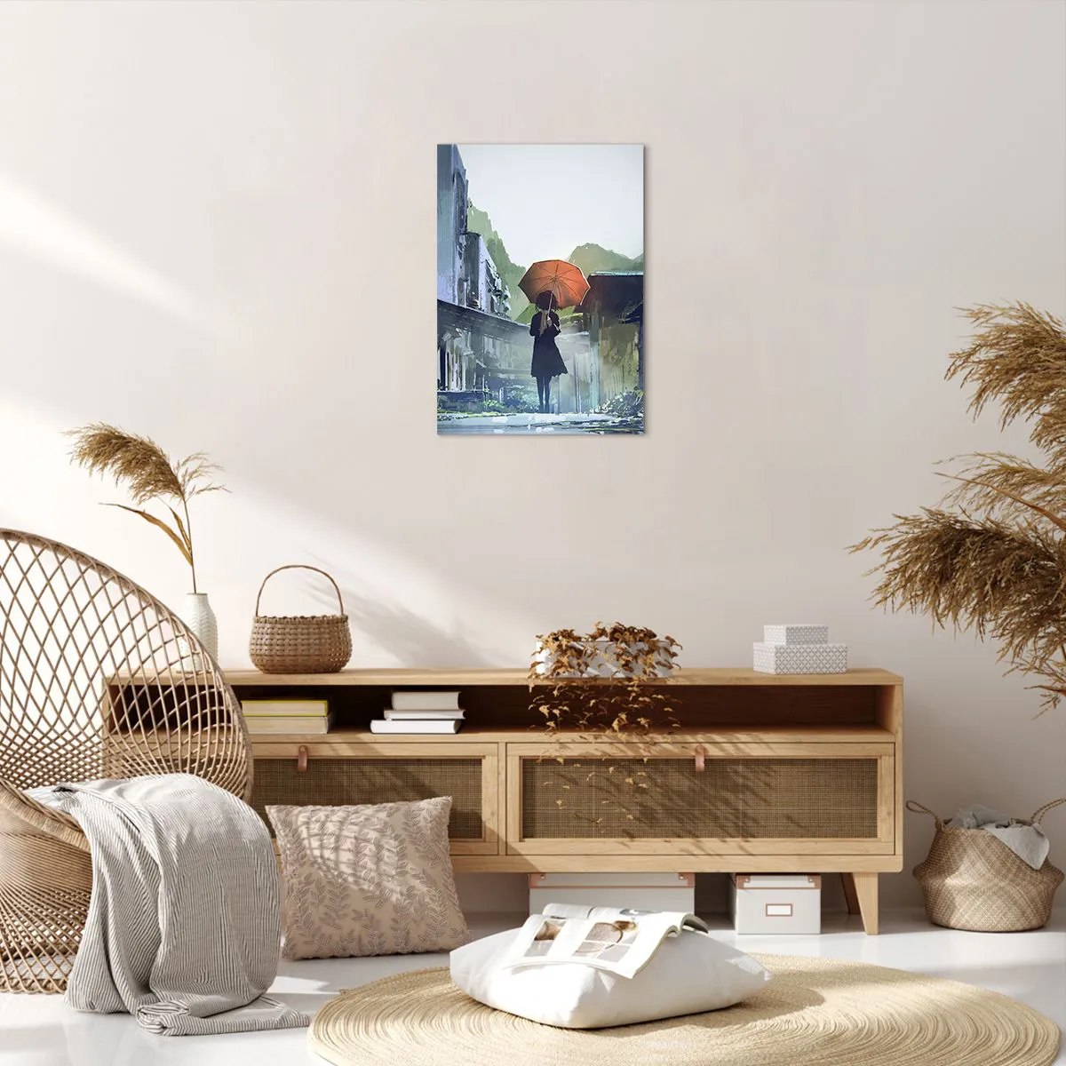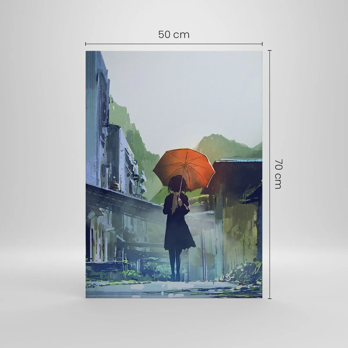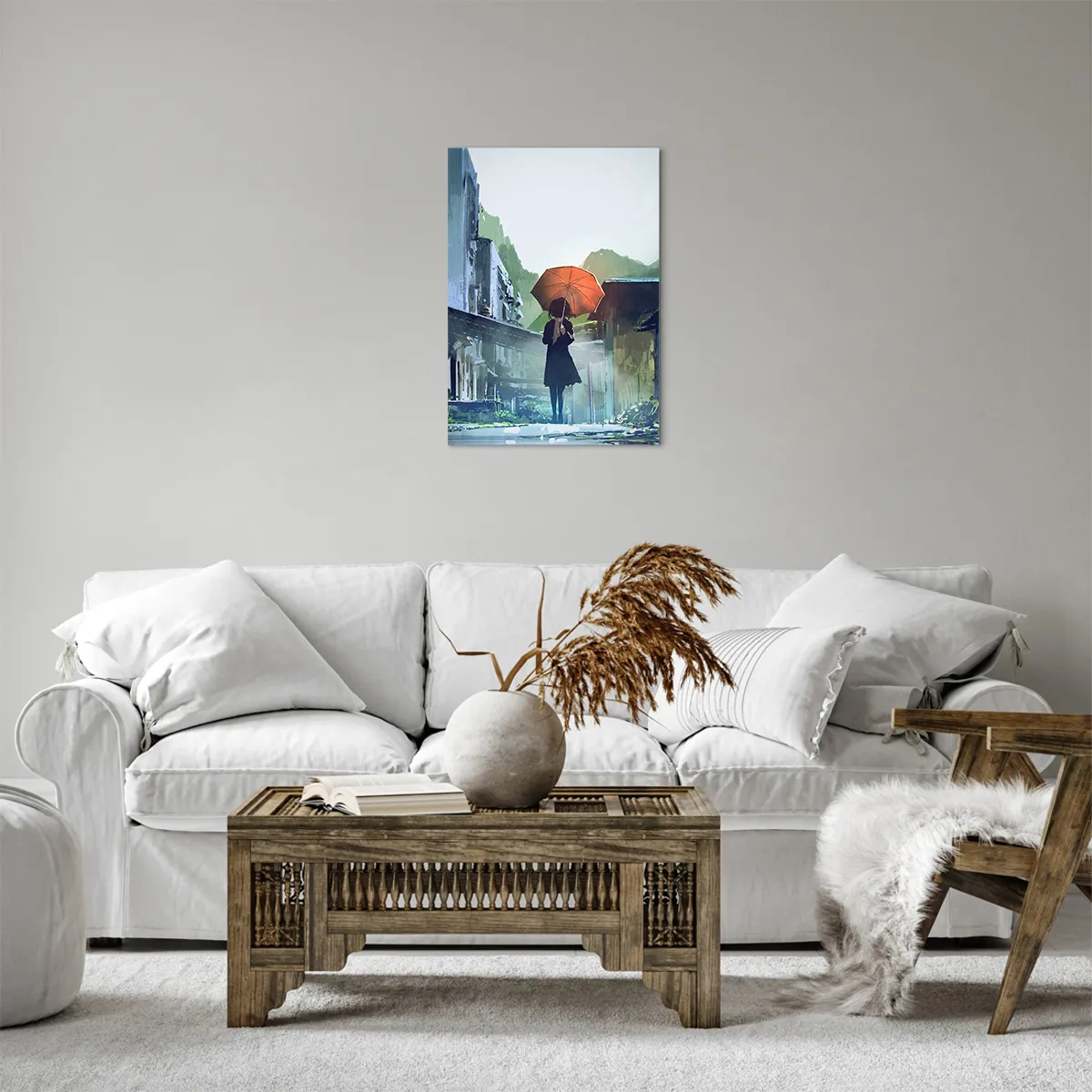 Bild auf Leinwand - Leinwandbild - Eine Figur mit einem Regenschirm in einer verregneten Stadt - 50x70cm - Belebender Regen - Moderne Wanddekoration für Wohnzimmer und Schlafzimmer ARTTOR