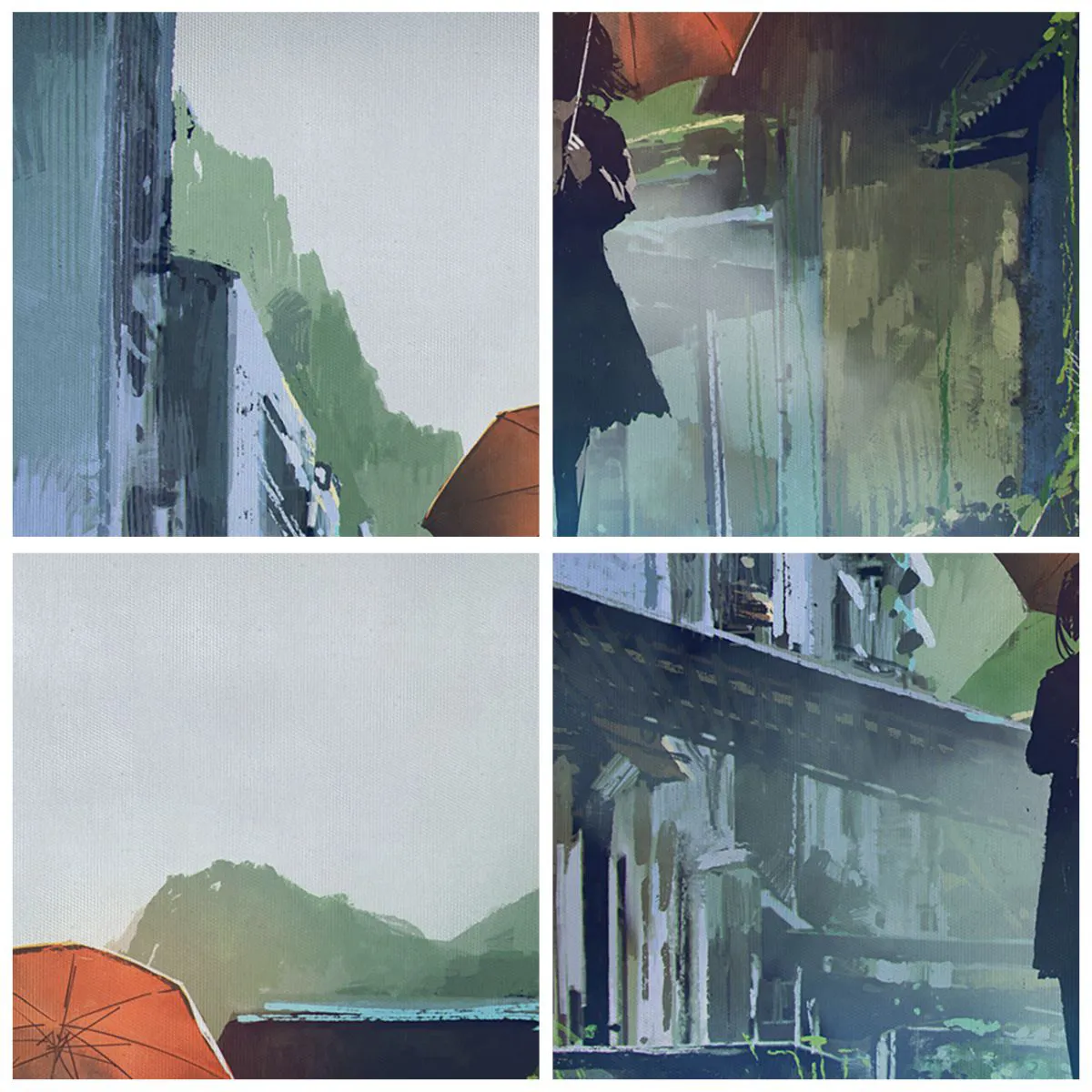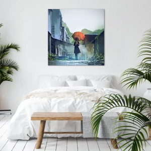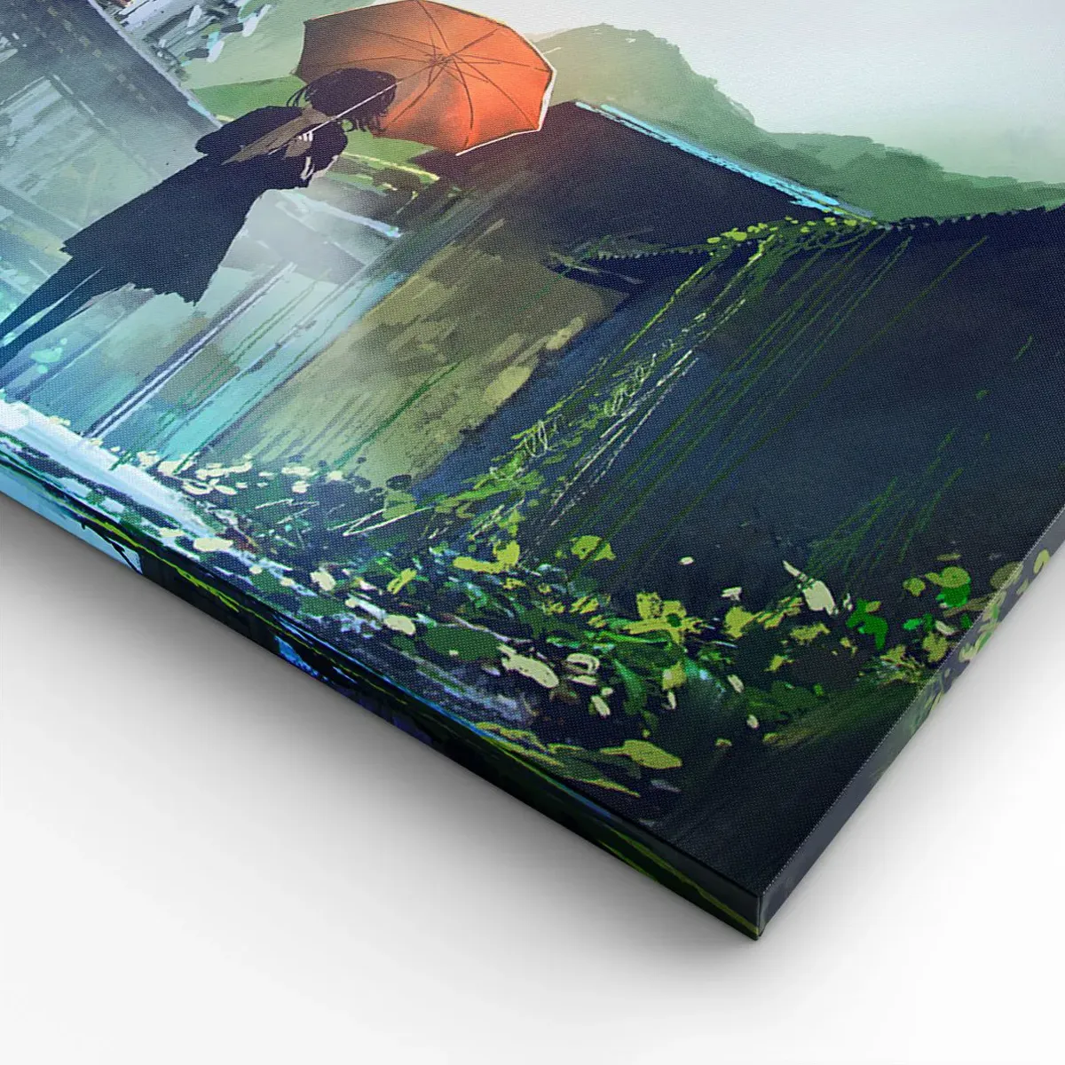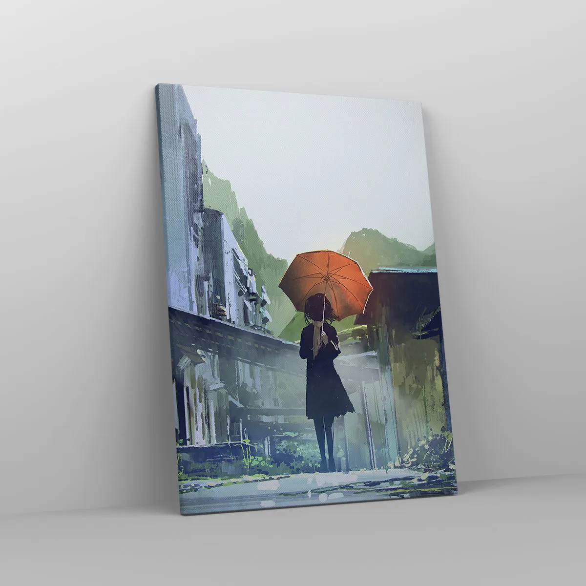 Bild auf Leinwand - Leinwandbild - Eine Figur mit einem Regenschirm in einer verregneten Stadt - 50x70cm - Belebender Regen - Moderne Wanddekoration für Wohnzimmer und Schlafzimmer ARTTOR