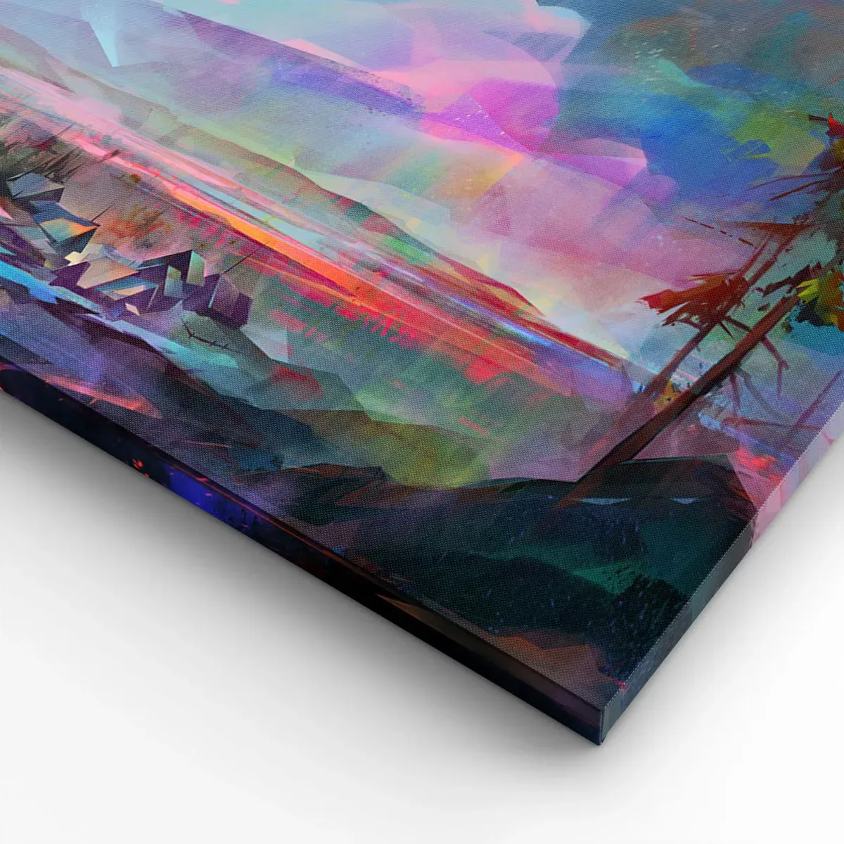 Die Leinwand wird über den Rahmen gespannt. Die Seiten und Kanten werden gedruckt, um das Bild fortzusetzen. Das Bild ist fertig zum Aufhängen an der Wand. Jedes Produkt hat einen am Rahmen befestigten Anhänger und ein Montageset (Schraube + Stift).