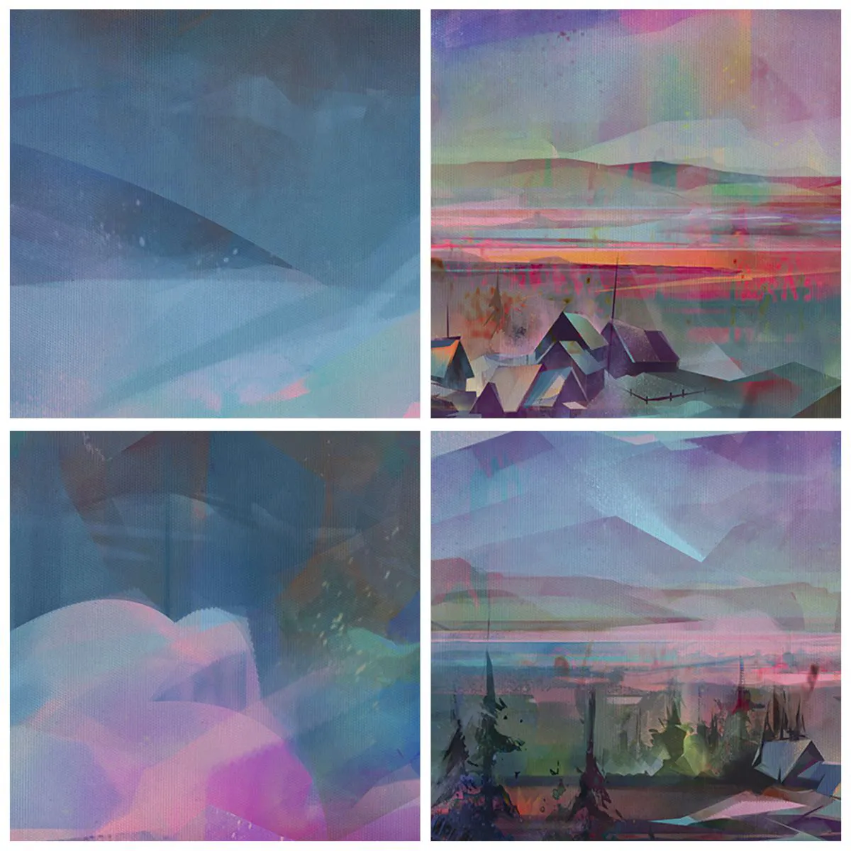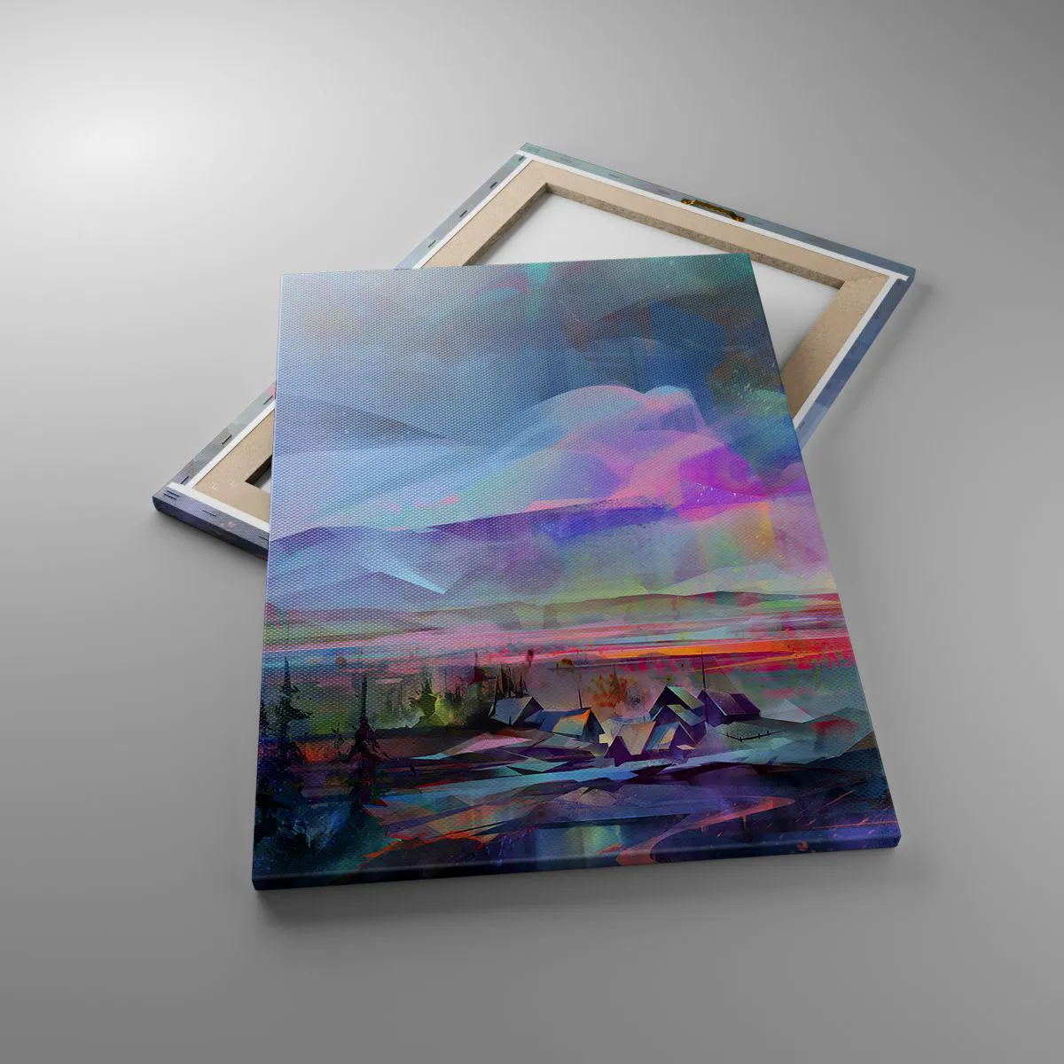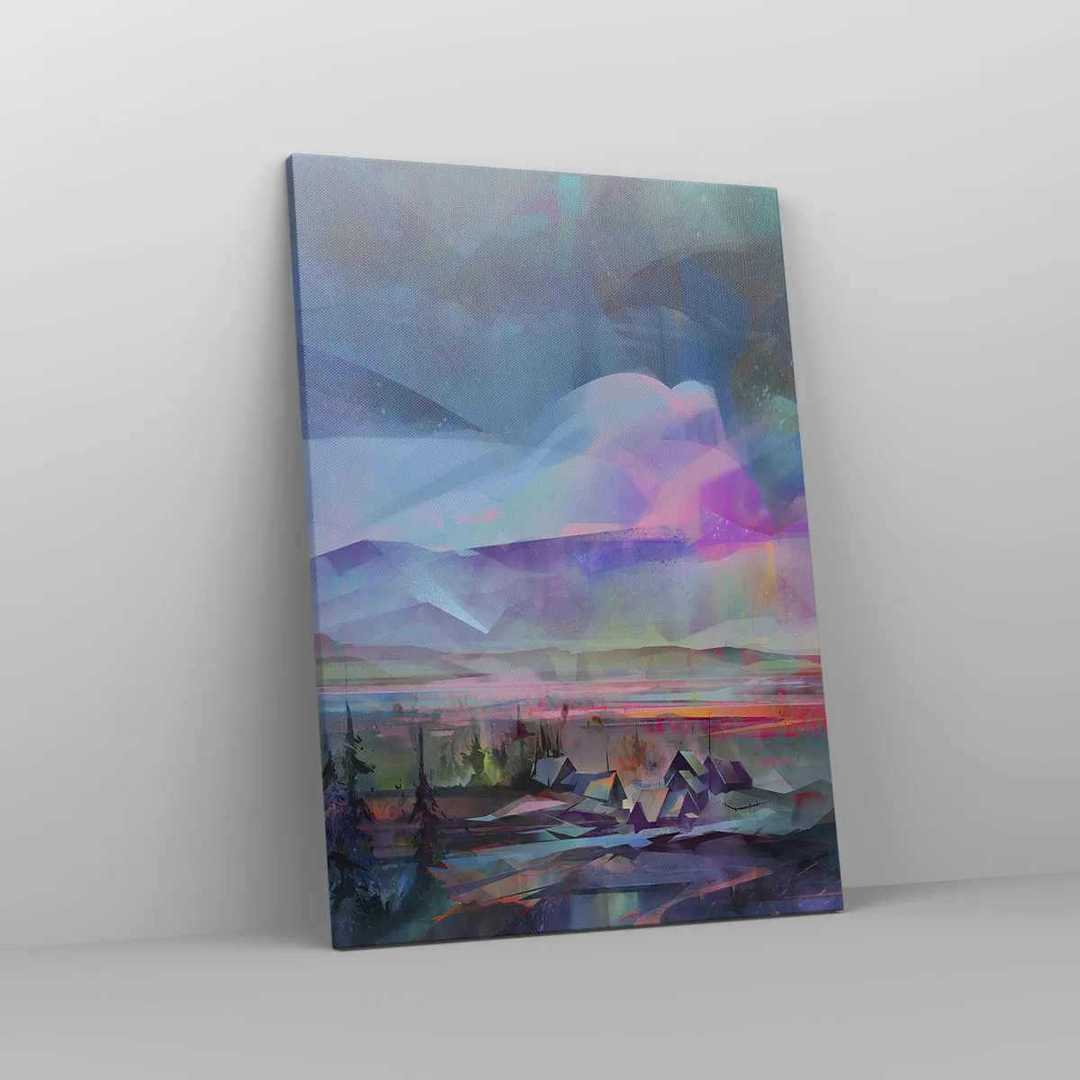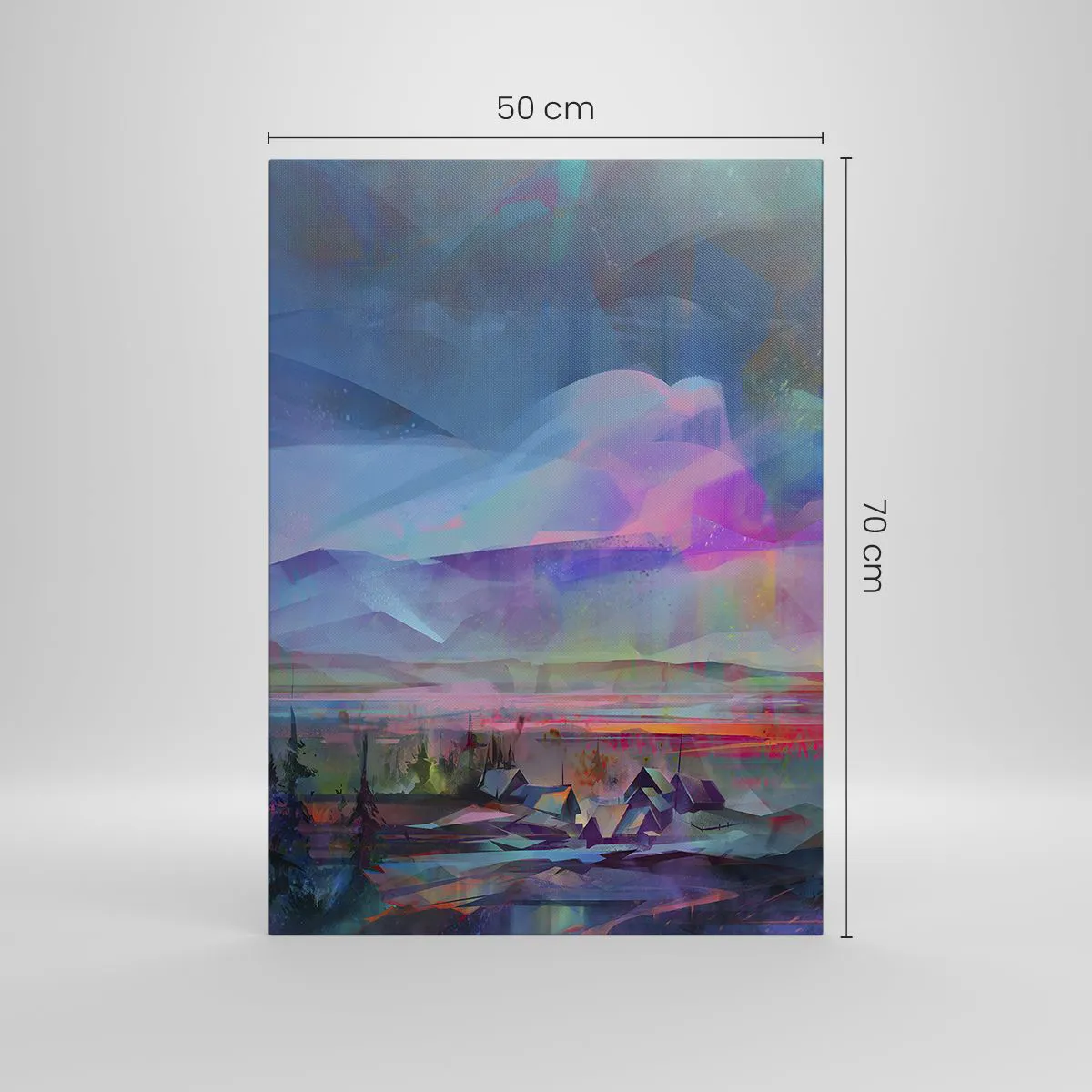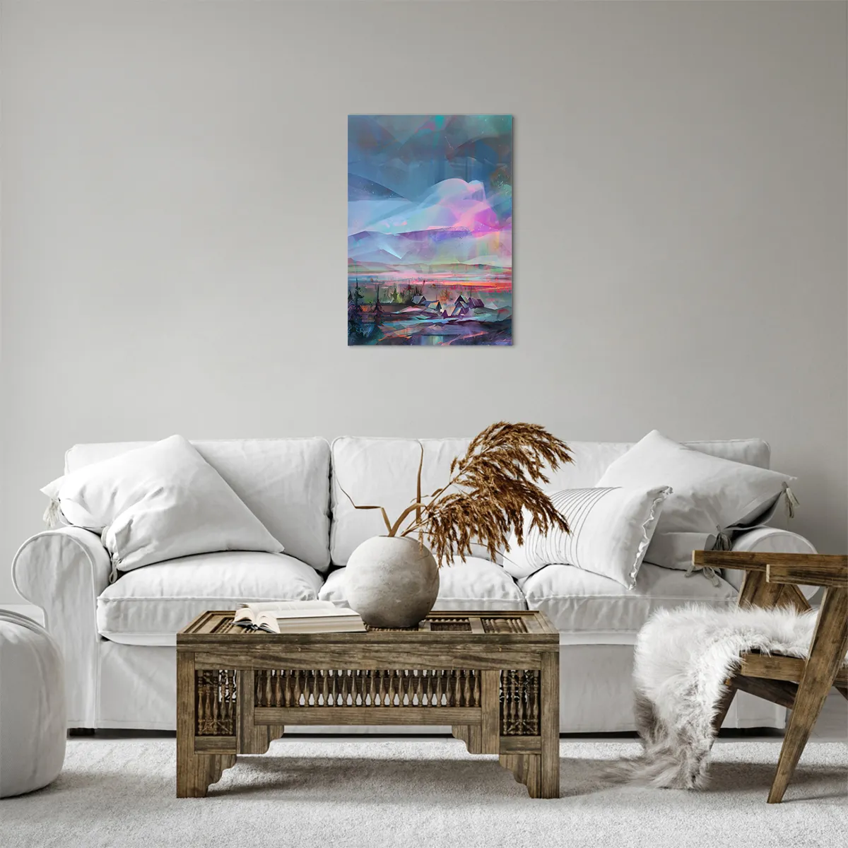 Bild auf Leinwand - Leinwandbild - Berglandschaft mit buntem Himmel und einem Dorf - 50x70cm - Unter einem wohlwollenden Himmel - Moderne Wanddekoration für Wohnzimmer und Schlafzimmer ARTTOR