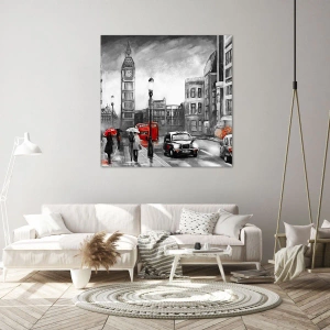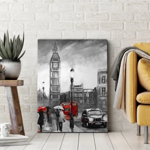 Bild auf Leinwand - Leinwandbild - Eine Londoner Szene in Schwarzweiß mit roten Akzenten - 50x70cm - Gar keine graue Stadt - Moderne Wanddekoration für Wohnzimmer und Schlafzimmer ARTTOR