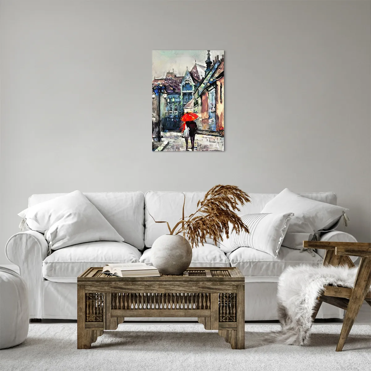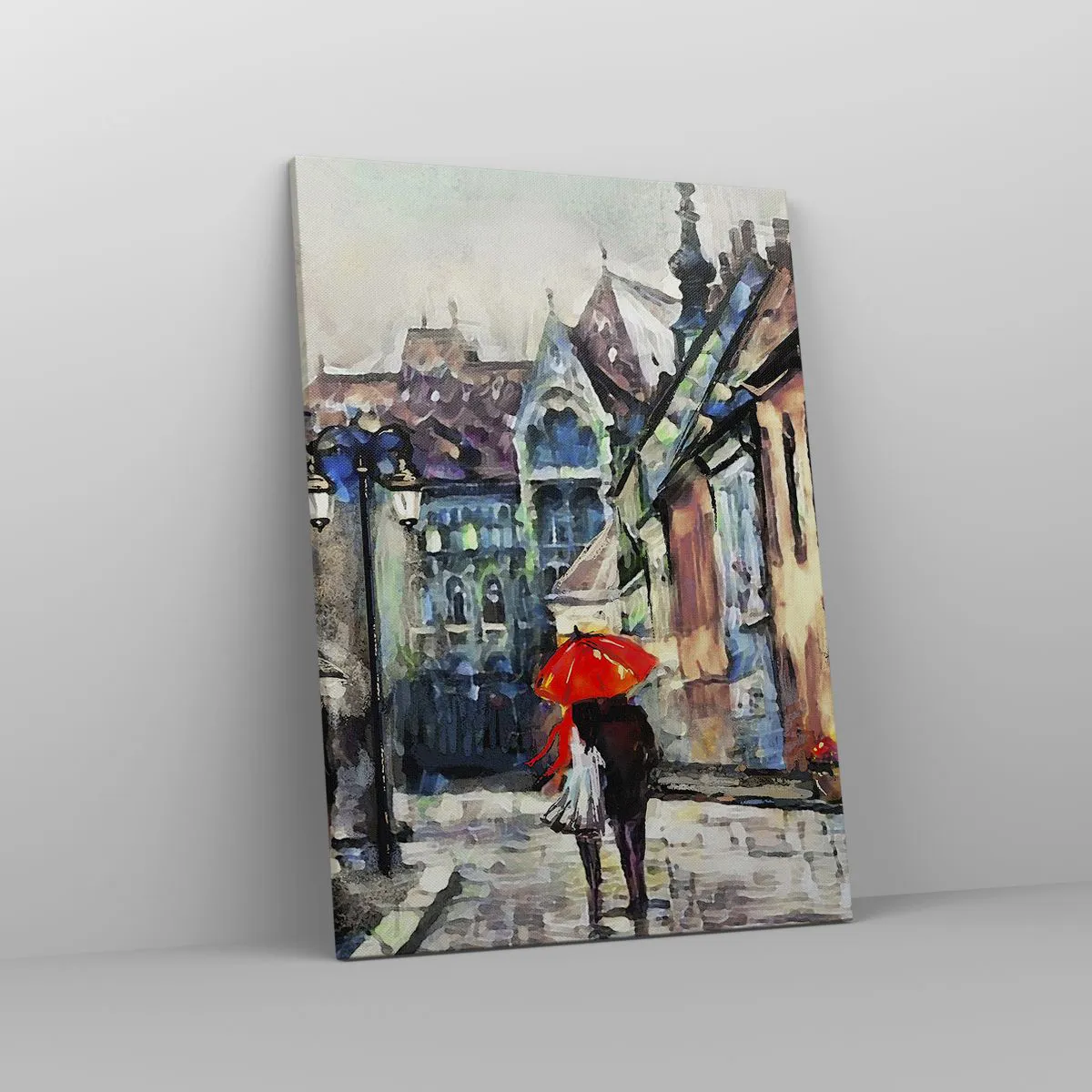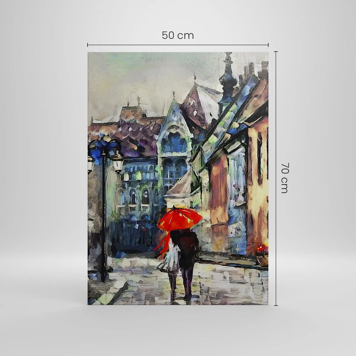 Bild auf Leinwand - Leinwandbild - Eine charmante Stadtstraße mit einem Paar unter einem roten Regenschirm - 50x70cm - Regen für Zwei - Moderne Wanddekoration für Wohnzimmer und Schlafzimmer ARTTOR