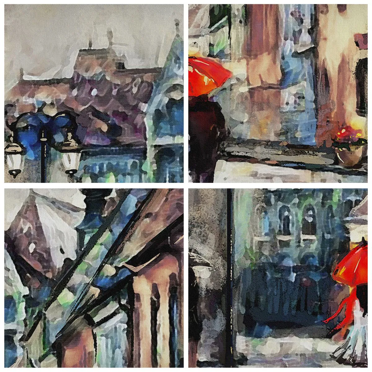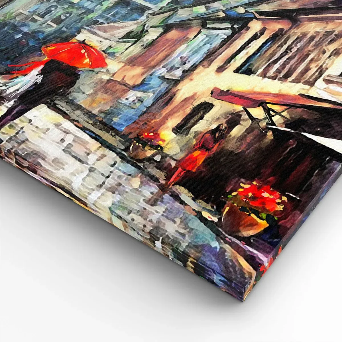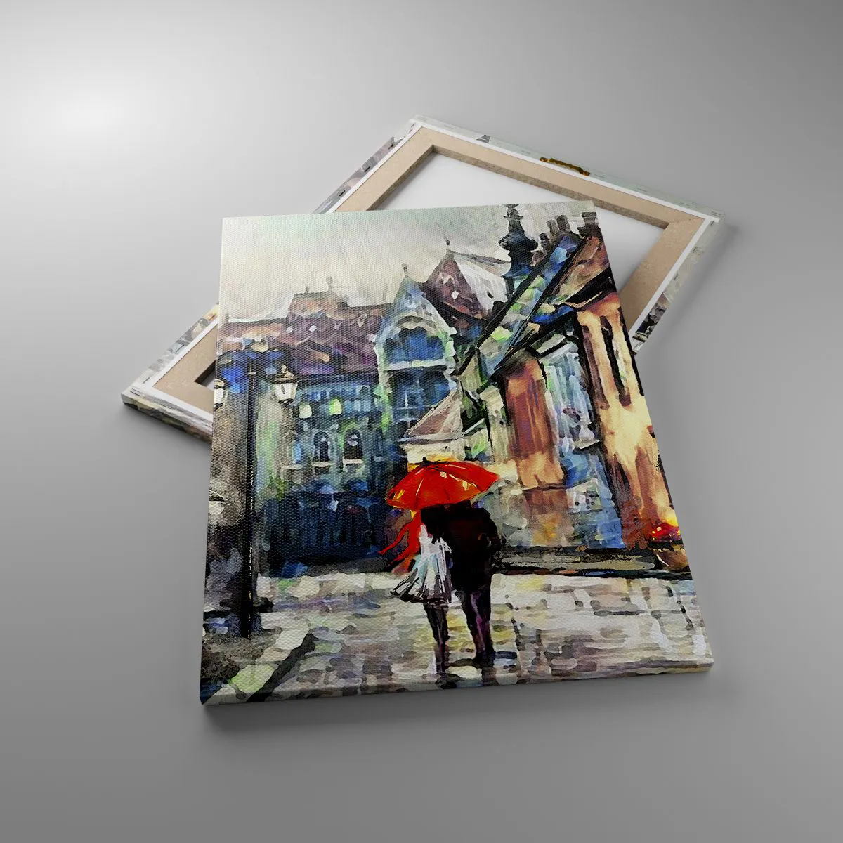 Bild auf Leinwand - Leinwandbild - Eine charmante Stadtstraße mit einem Paar unter einem roten Regenschirm - 50x70cm - Regen für Zwei - Moderne Wanddekoration für Wohnzimmer und Schlafzimmer ARTTOR