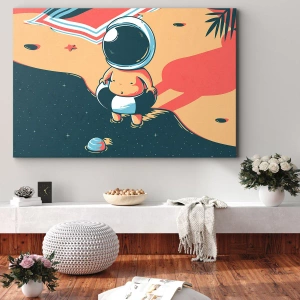 Bild auf Leinwand - Leinwandbild - Lustiger Astronaut am Strand mit Weltraumelementen im Hintergrund - 120x80cm - Aus einer anderen Perspektive - Moderne Wanddekoration für Wohnzimmer und Schlafzimmer ARTTOR