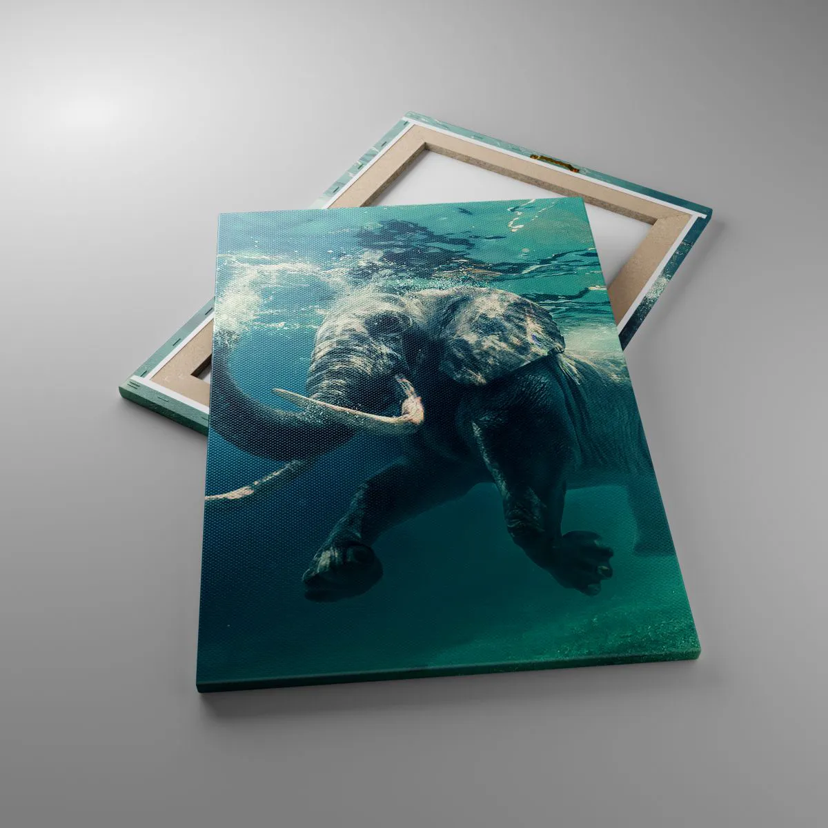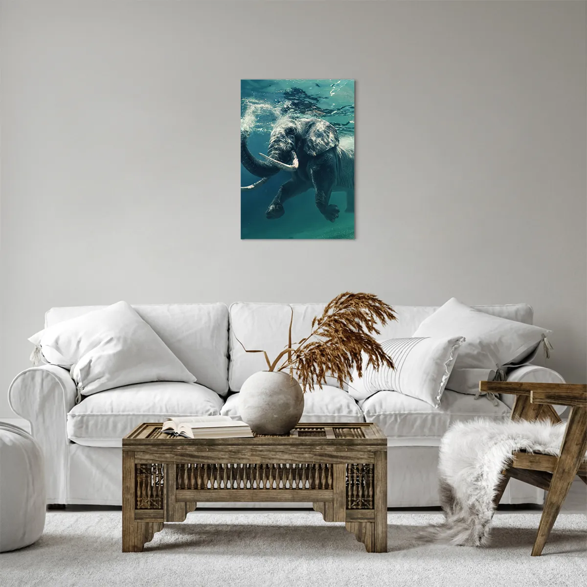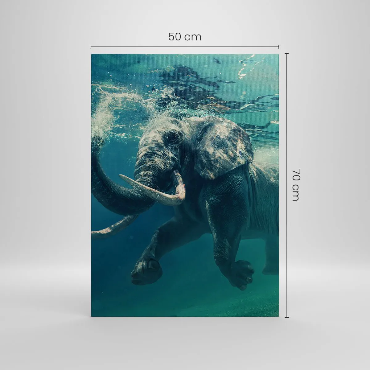 Bild auf Leinwand - Leinwandbild - Ein Elefant schwimmt unter Wasser in den türkisfarbenen Tiefen - 50x70cm - Jeder schwimmt gerne - Moderne Wanddekoration für Wohnzimmer und Schlafzimmer ARTTOR